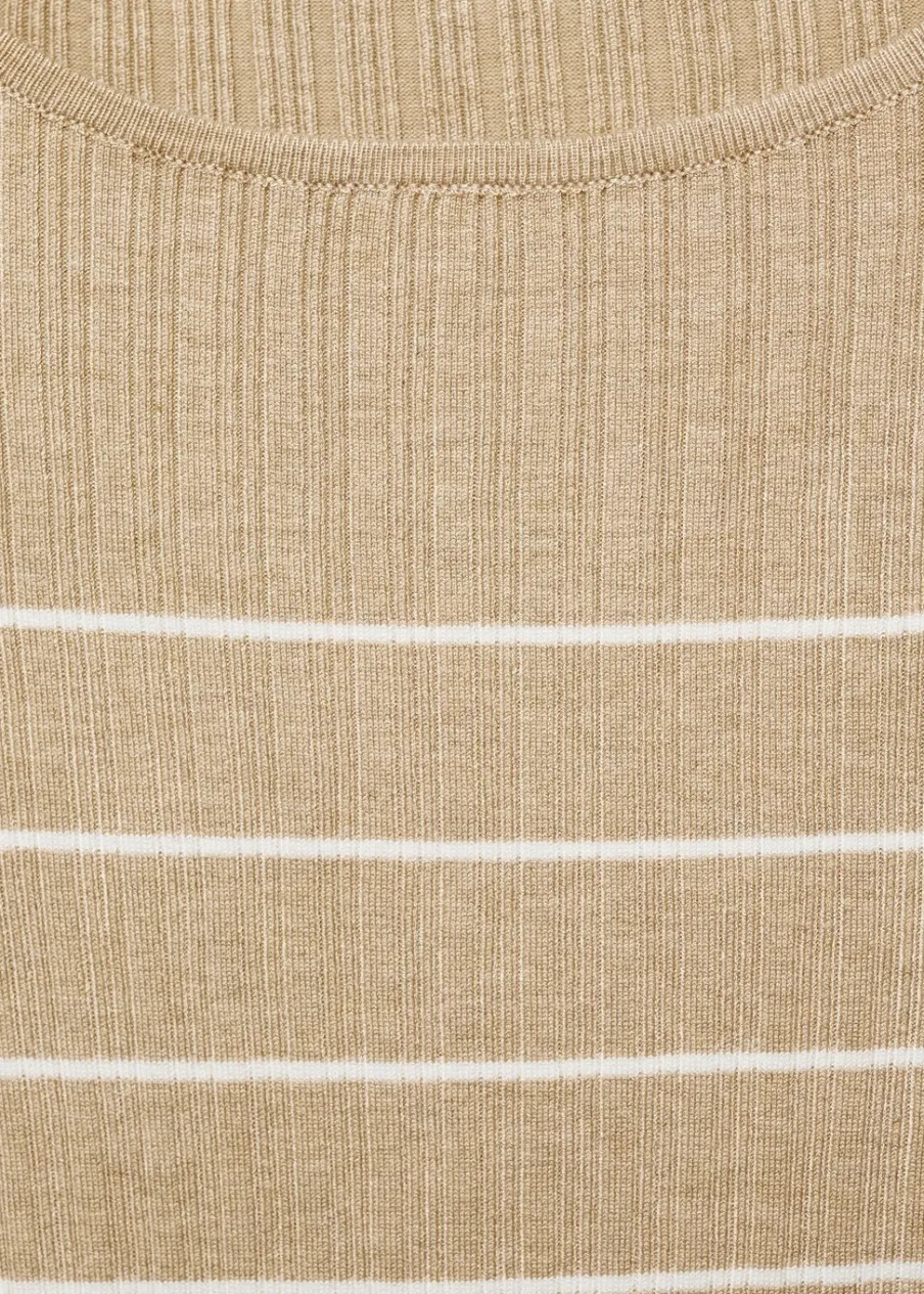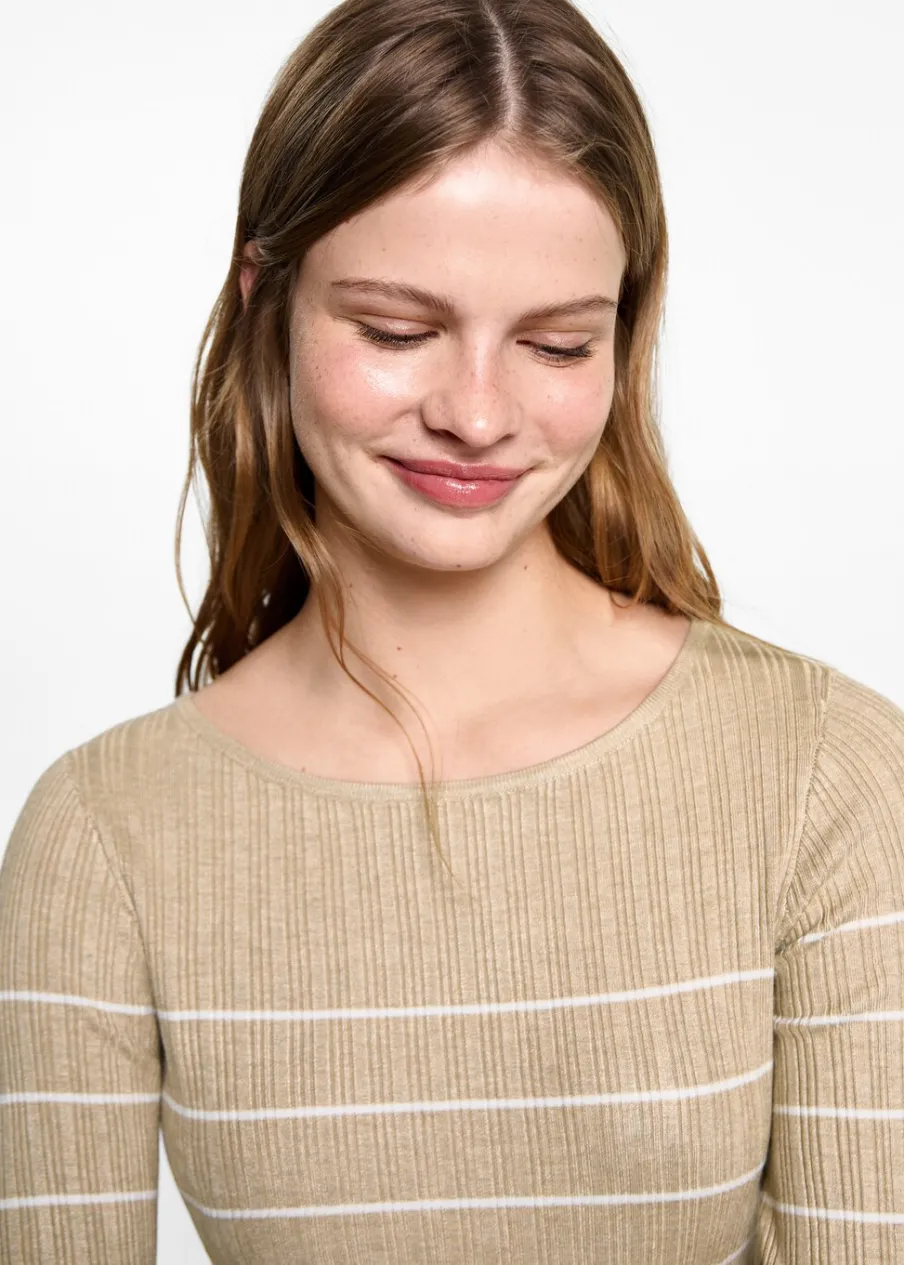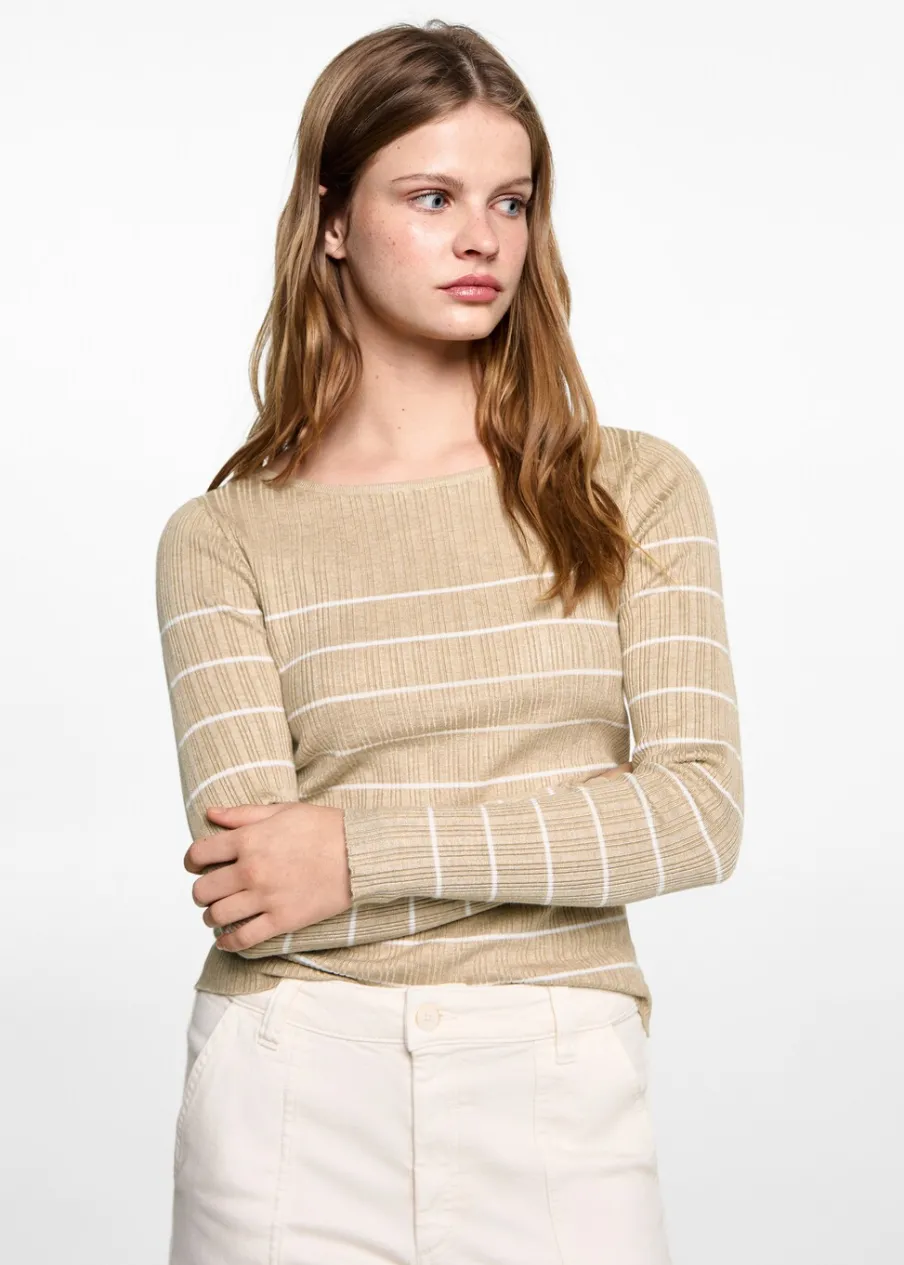 Tkanina ze ściągaczowej dzianiny. Deseń w pasy. Slim-fit. Okrągły dekolt. Długi rękaw.