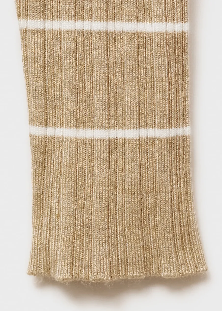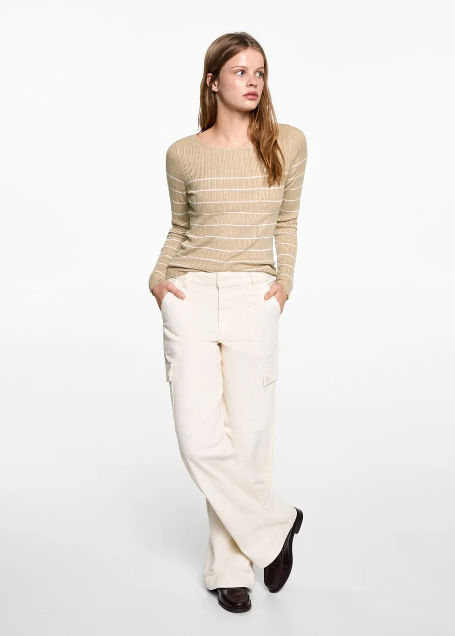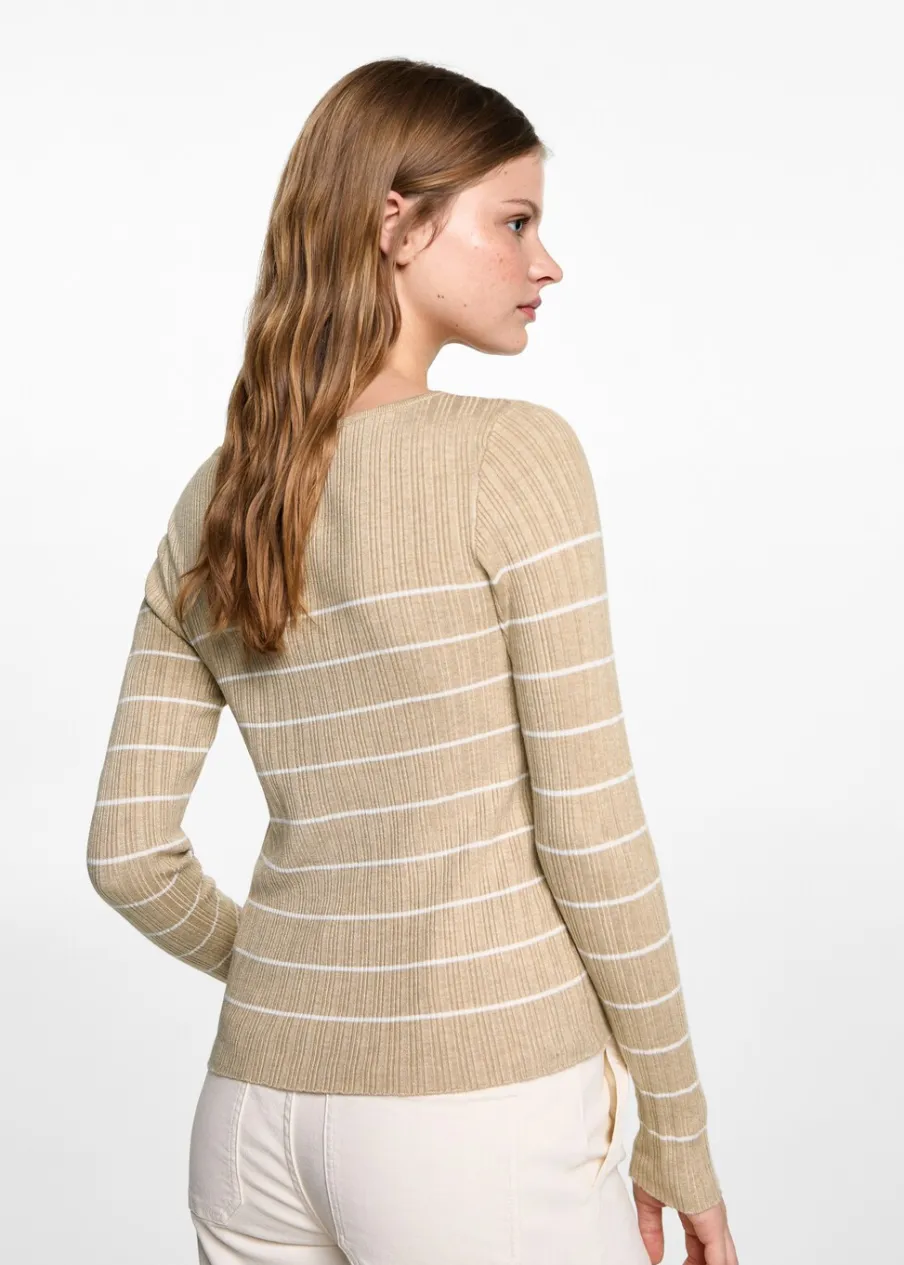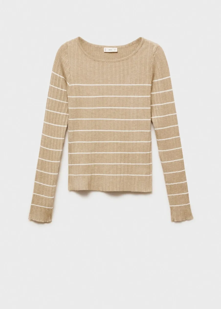 Tkanina ze ściągaczowej dzianiny. Deseń w pasy. Slim-fit. Okrągły dekolt. Długi rękaw.