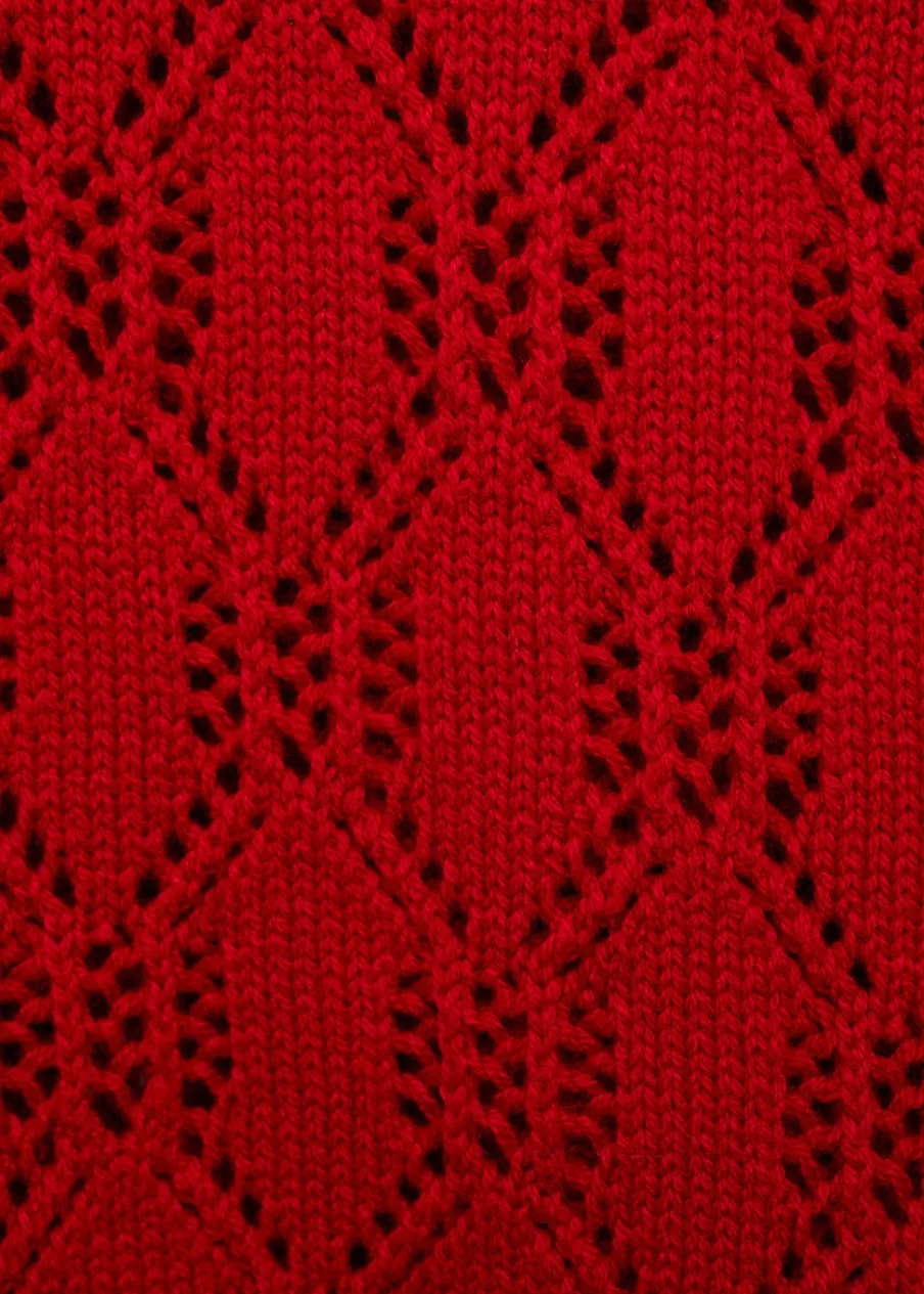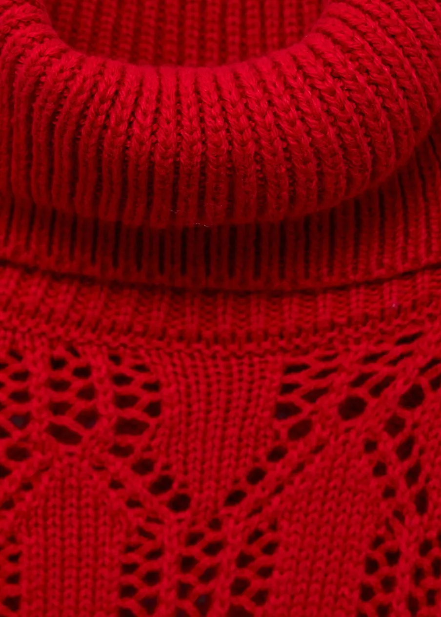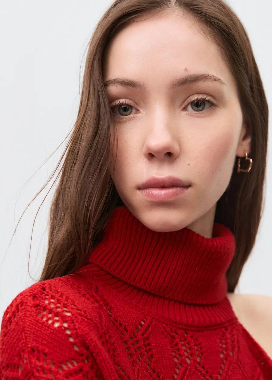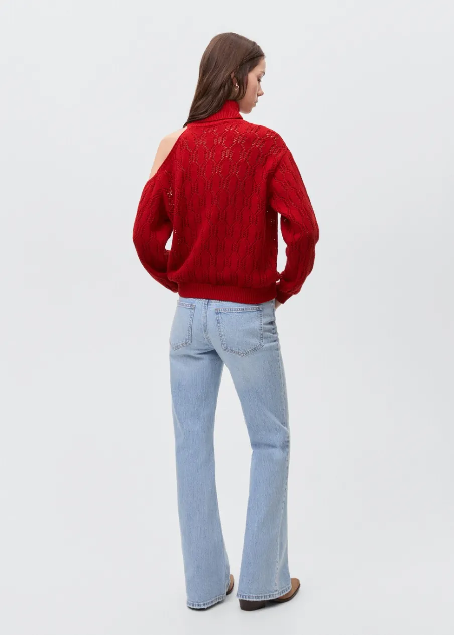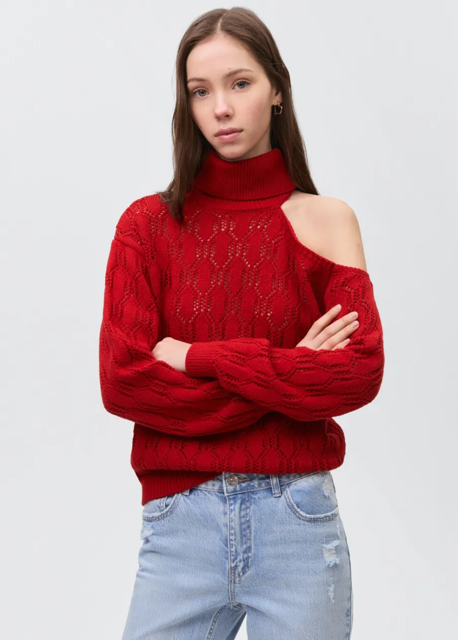Bawełniana tkanina. Ażurowa dzianina. Golf. Wycięcie. Odkryte ramię. Długi rękaw. Mankiety i dół wykończone ściągaczem.