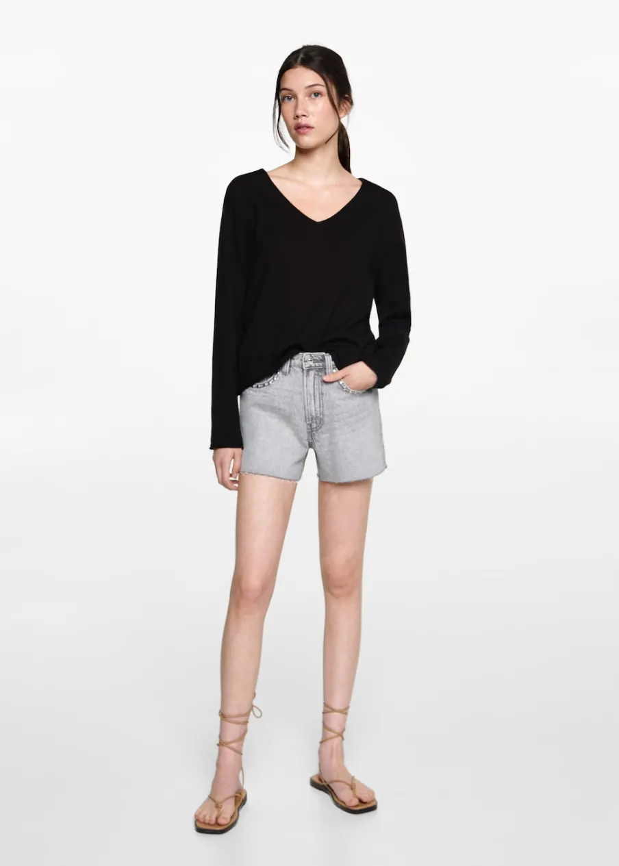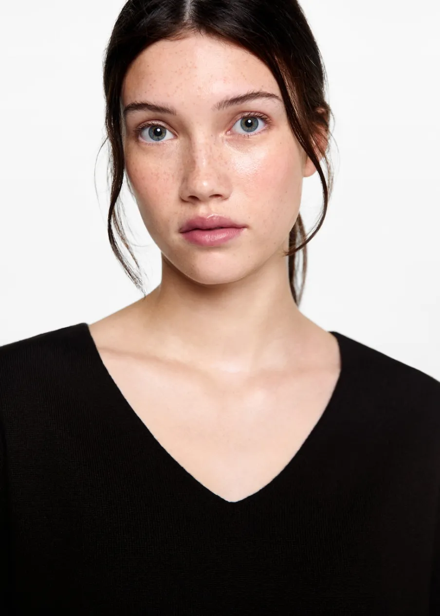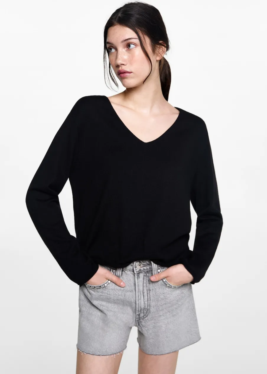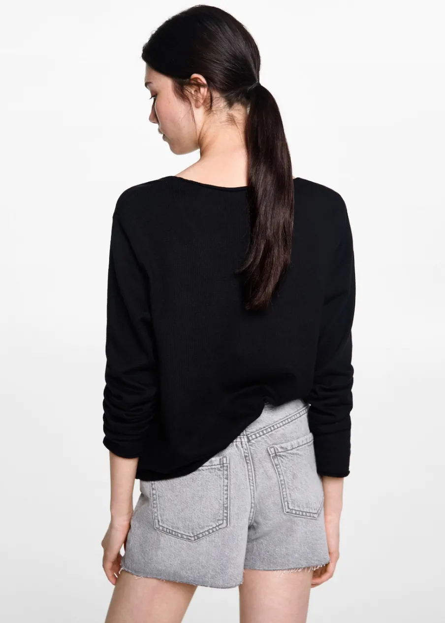 Tkanina z bawełną. Model prosty. Dekolt V. Długi rękaw. Bez zapięcia. Modelka ma 172 cm wzrostu i nosi rozmiar M. Powrót do szkoły.