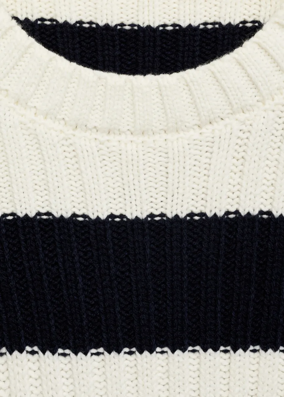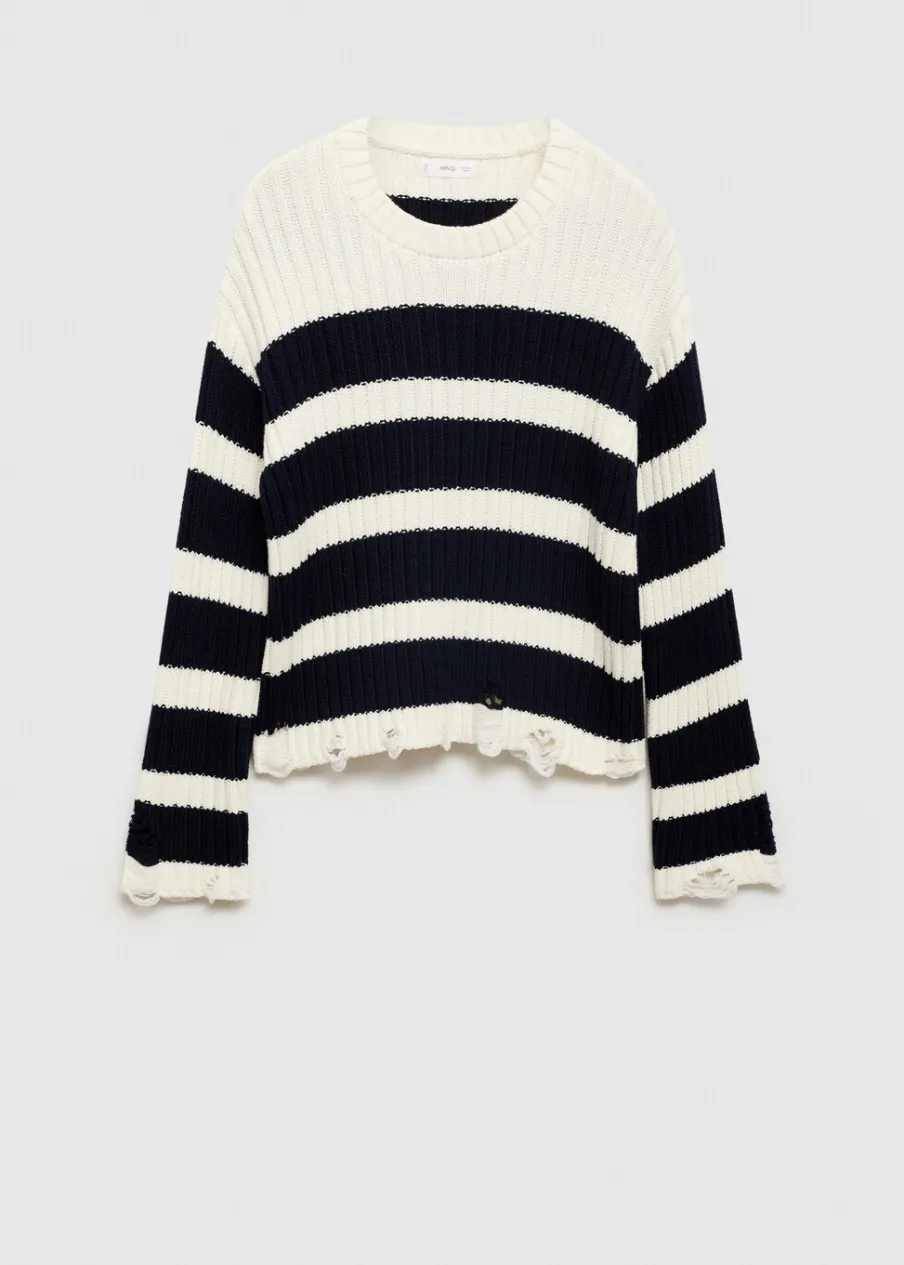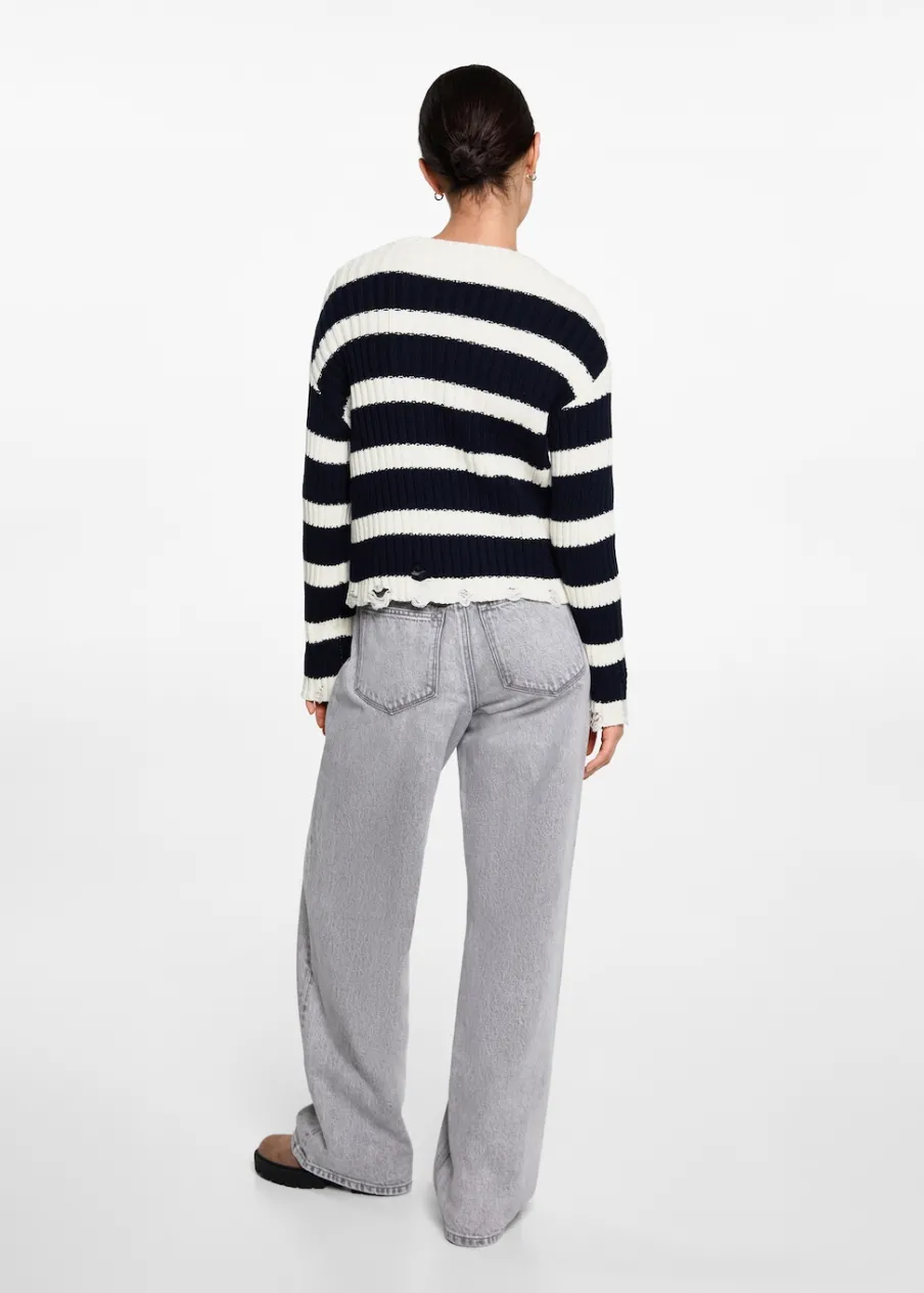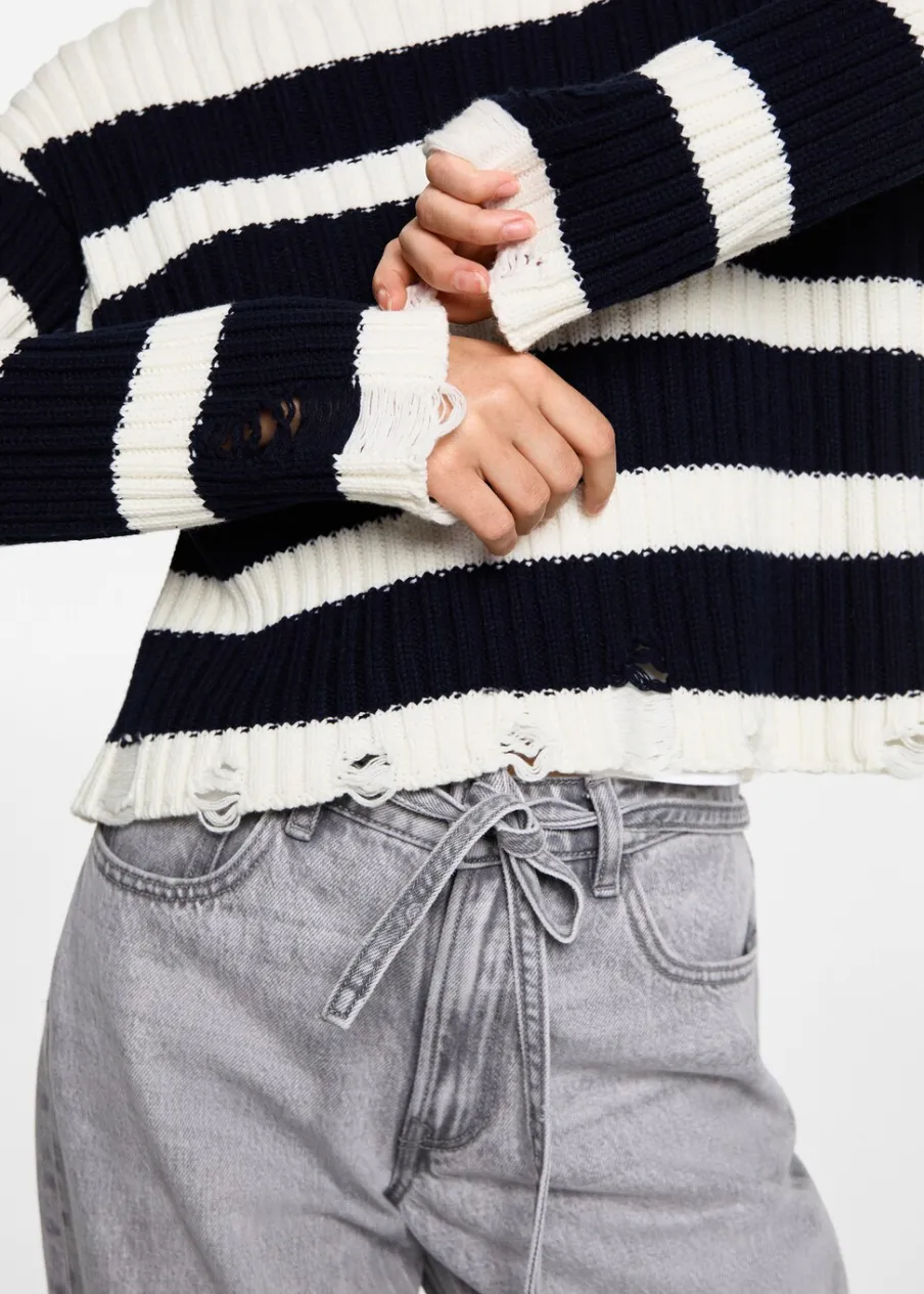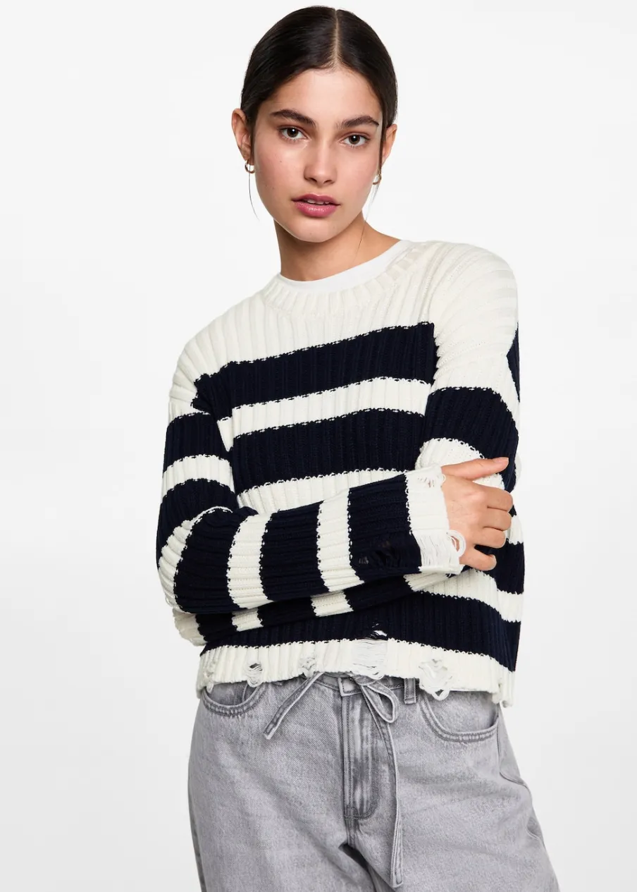 Tkanina z grubej dzianiny. Długi rękaw. Postrzępione wykończenie. Model prosty. Modelka ma 172 cm wzrostu i nosi rozmiar M. Okrągły dekolt.