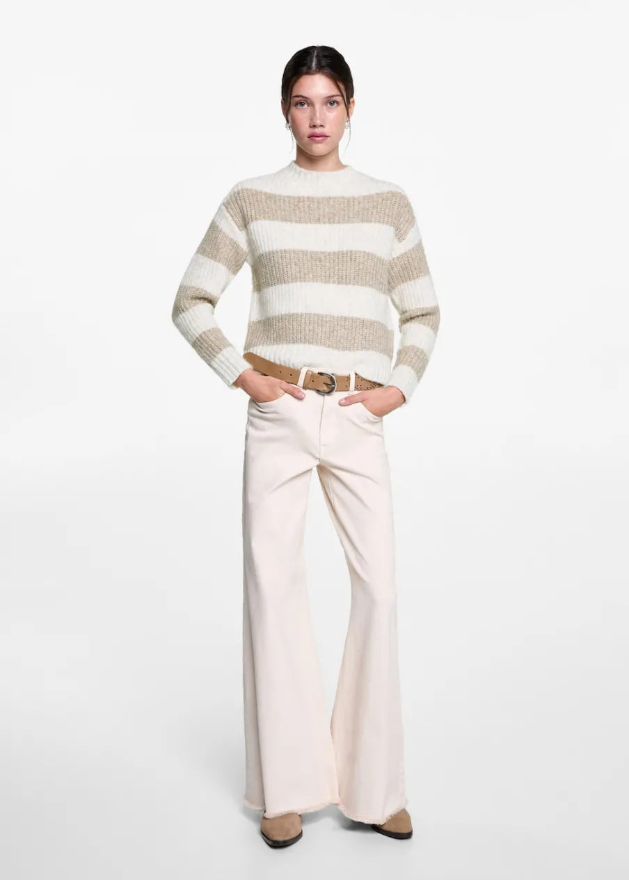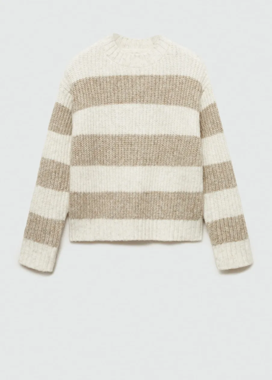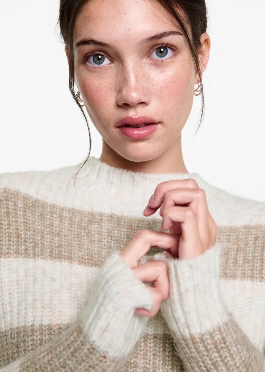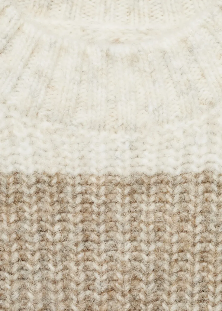 Tkanina z grubej dzianiny. Okrągły dekolt. Długi rękaw. Bez zapięcia. Modelka ma 172 cm wzrostu i nosi rozmiar M.