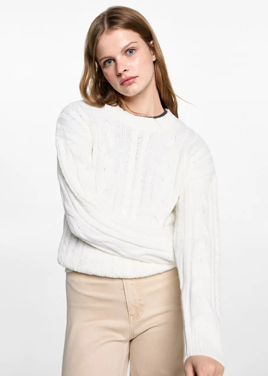 Dzianina. Dzianina ze ściegiem w ósemki. Okrągły dekolt. Długi rękaw.
