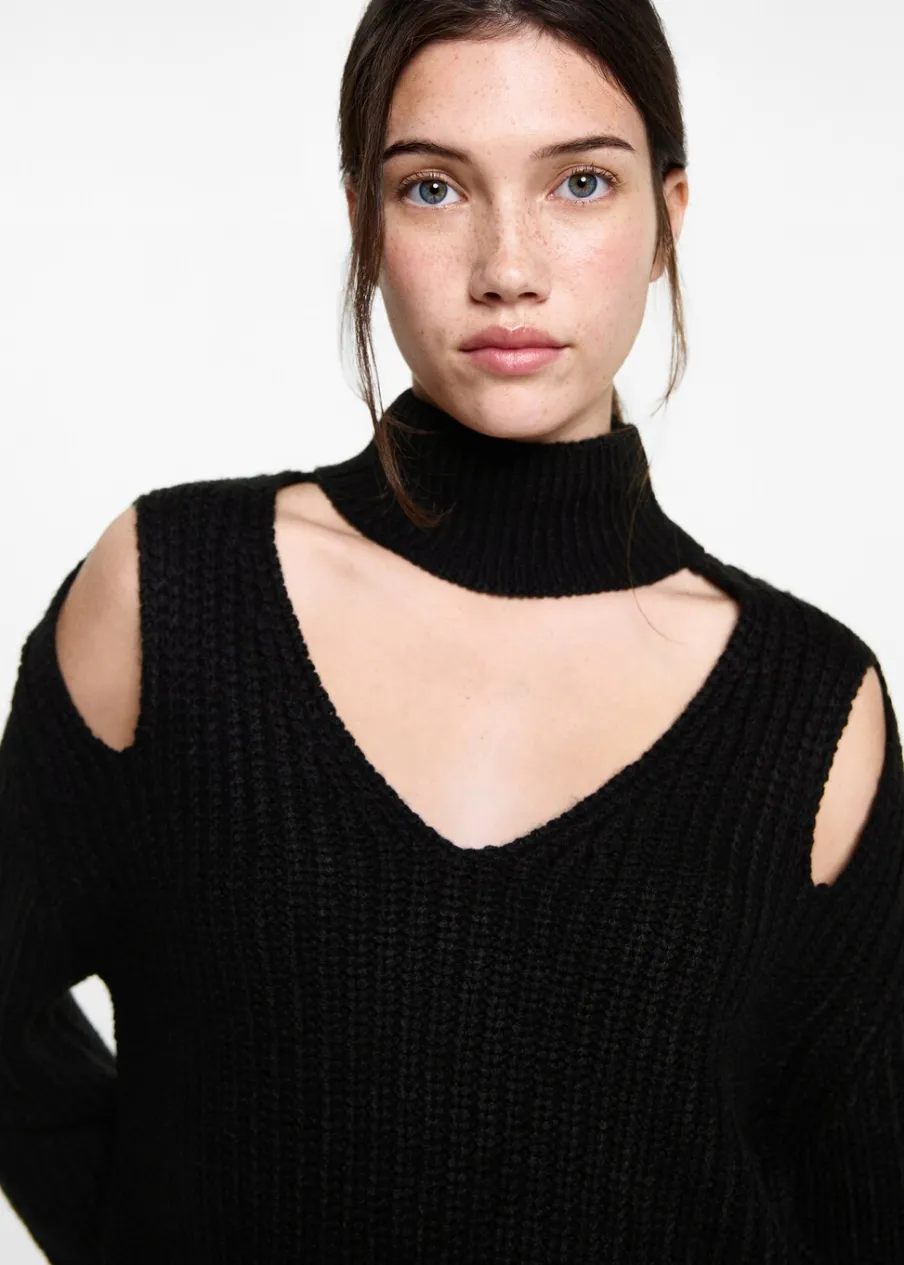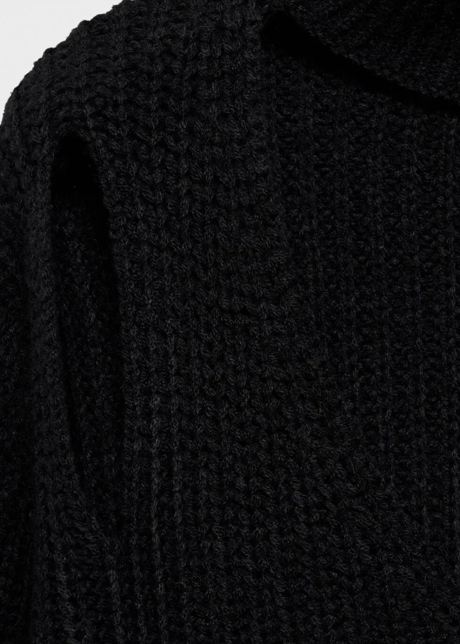 Kolekcja wieczorowa i imprezowa. Tkanina z grubej dzianiny. Model oversize. Długi bufiasty rękaw. Dekolt V. Dekolt V. Golf. Rozcięcia na ramionach.