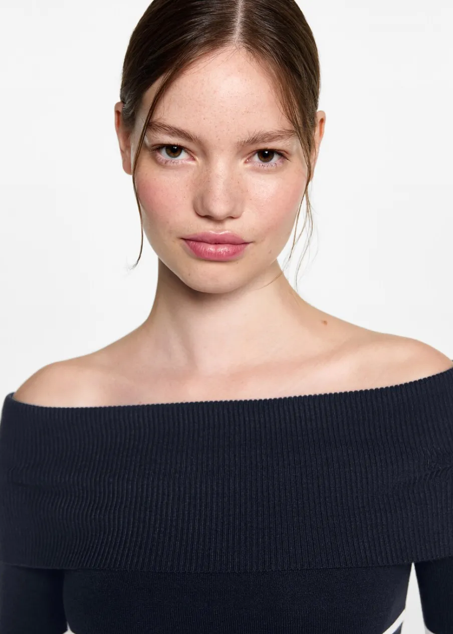Model prosty. Odkryte ramiona. Deseń crop. Długi rękaw. Wzór w paski. Tkanina z wiskozy.
