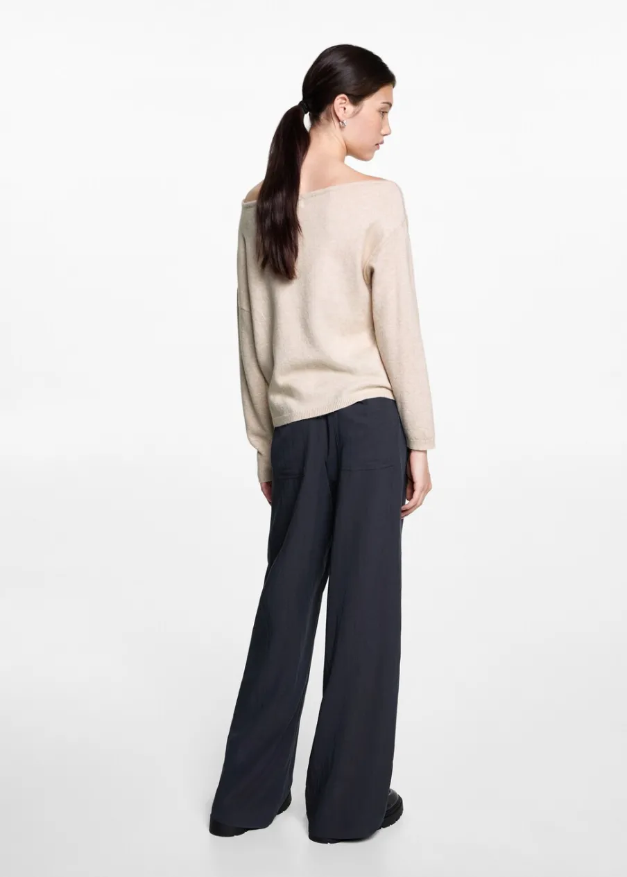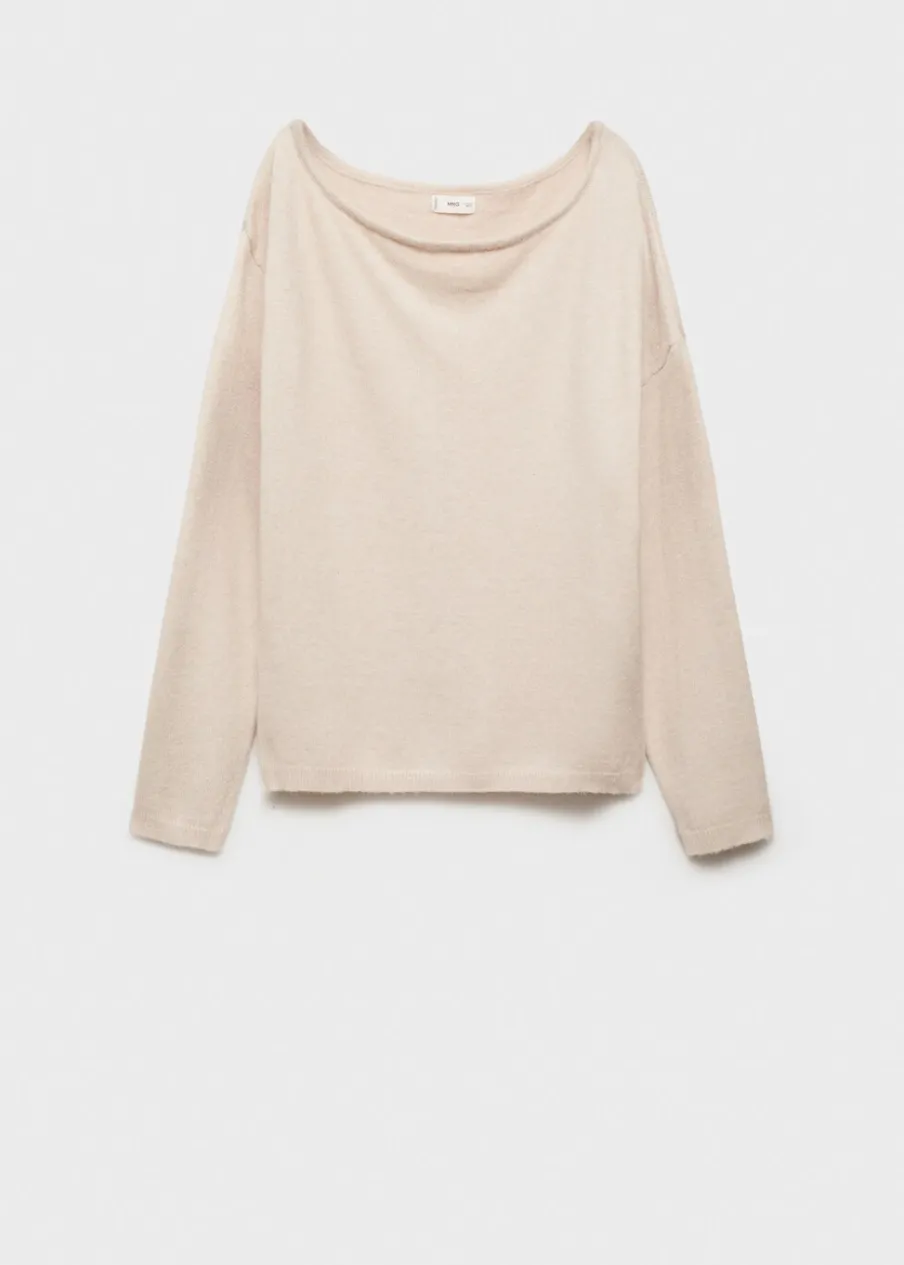 Dekolt w kształcie łódki. Długi rękaw. Bez zapięcia. Modelka ma 172 cm wzrostu i nosi rozmiar M. Model prosty.