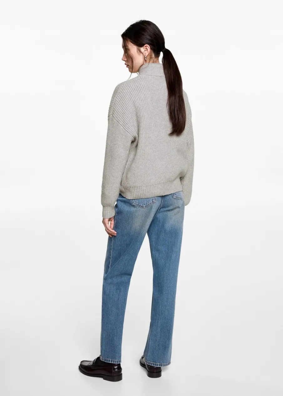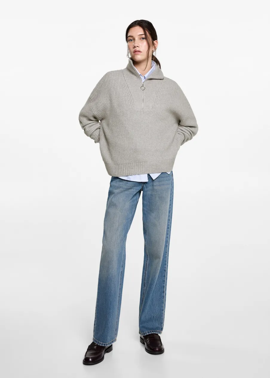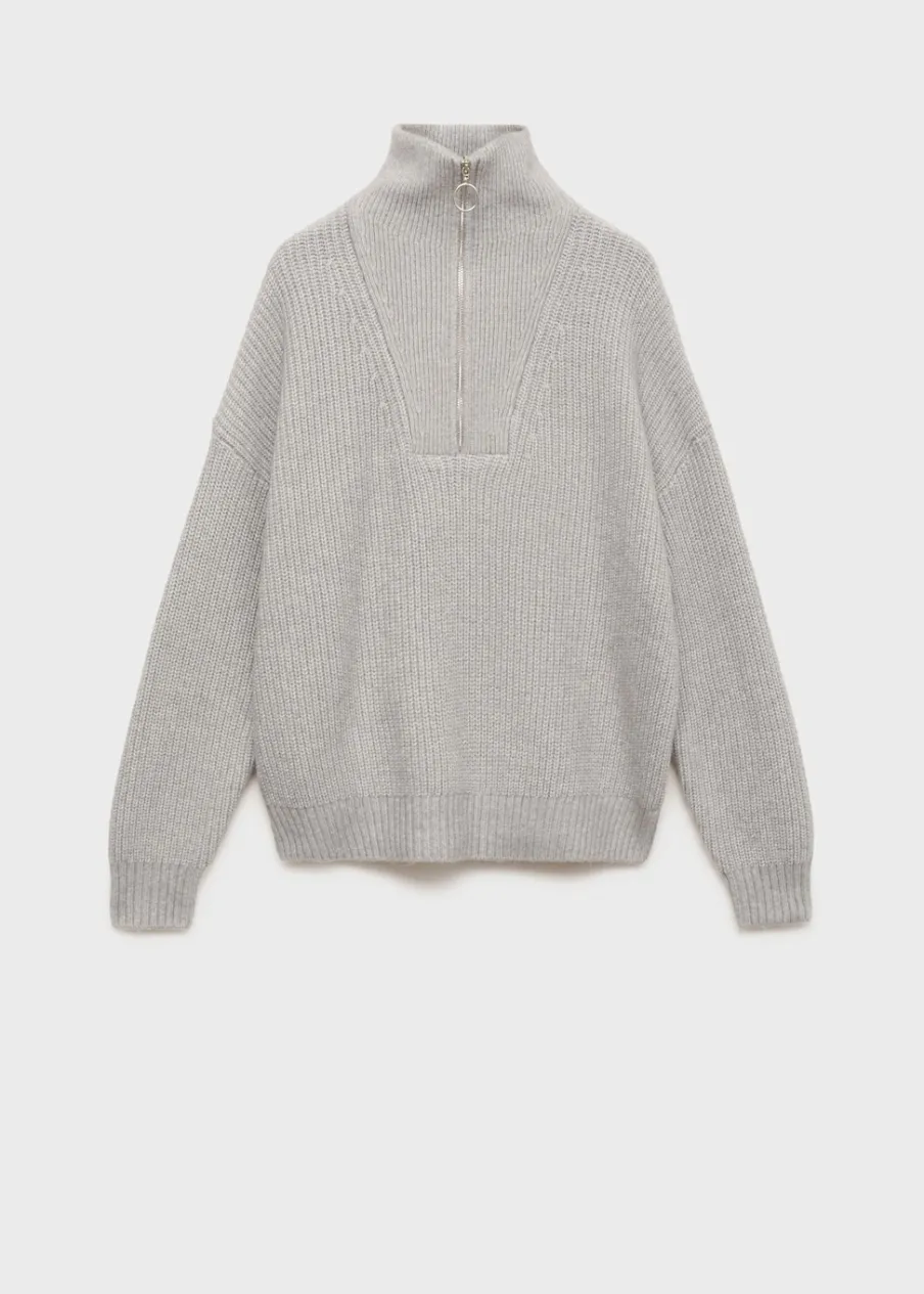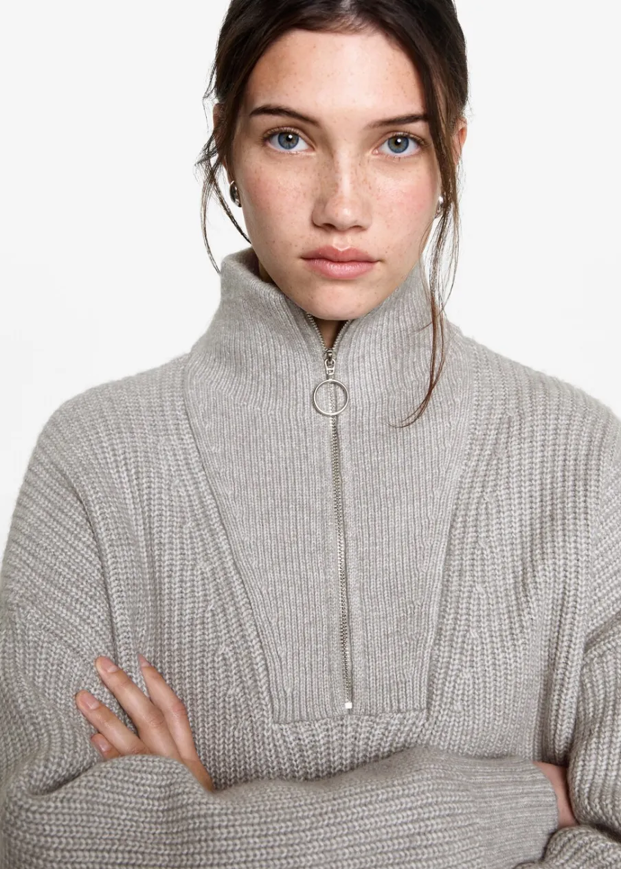 Tkanina z grubej dzianiny. Model oversize. Golf. Długi rękaw. Zapięcie na zamek na dekolcie.