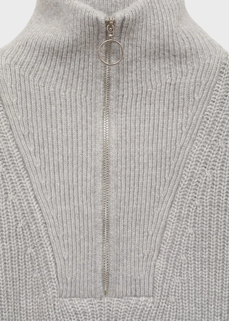 OpisTkanina z grubej dzianiny. Model oversize. Golf. Długi rękaw. Zapięcie na zamek na dekolcie.