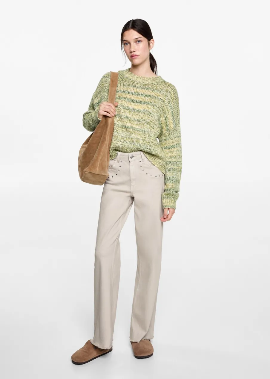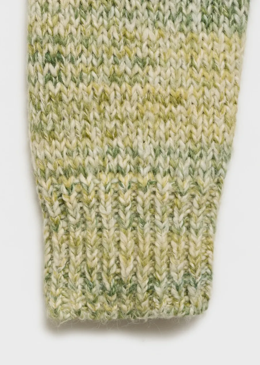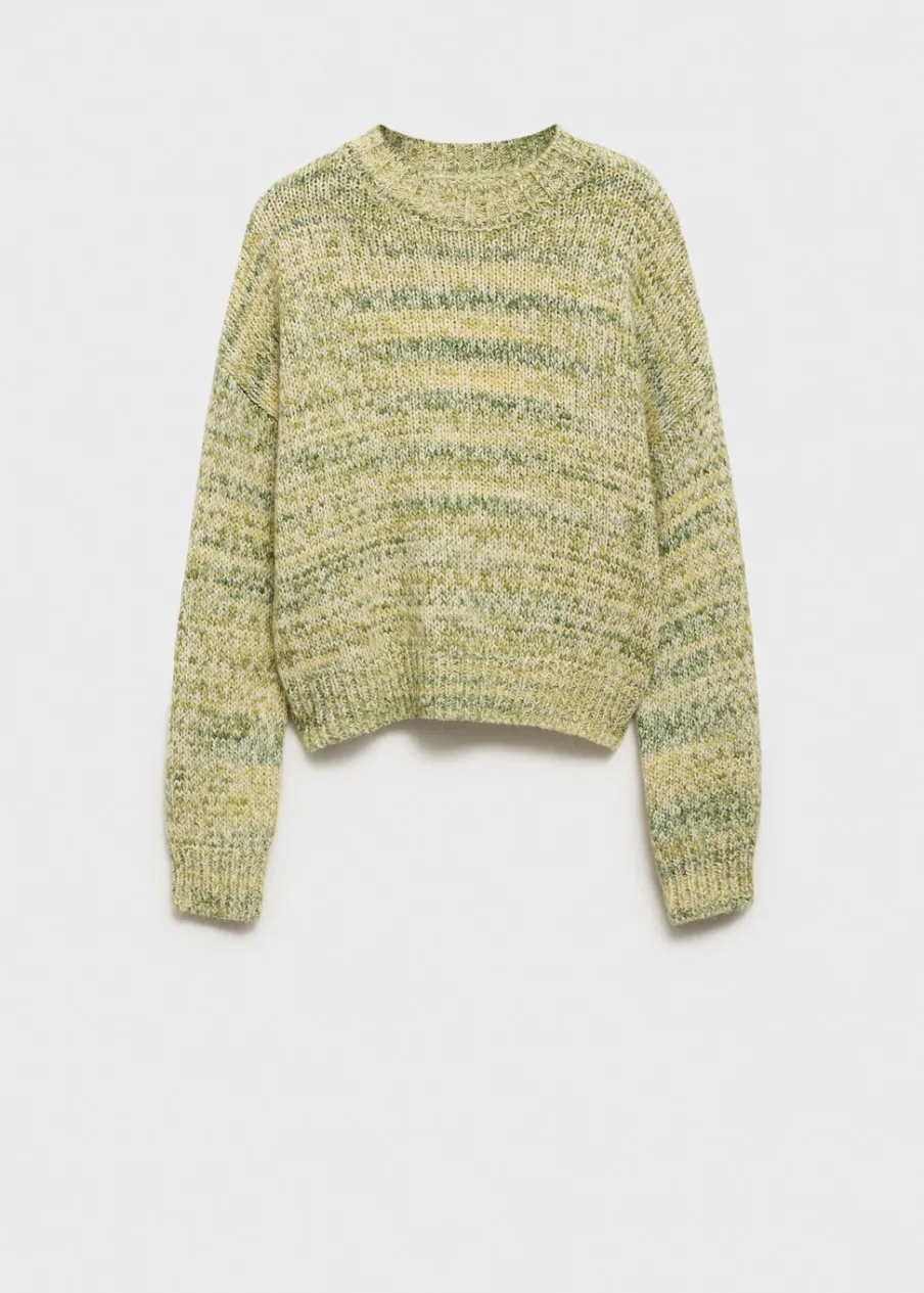 Wełniana tkanina. Bawełniana tkanina. Deseń melanżowy. Dzianina średniej grubości. Długi rękaw. Okrągły dekolt. Kołnierz, mankiety i dół z prążkowanej dzianiny.