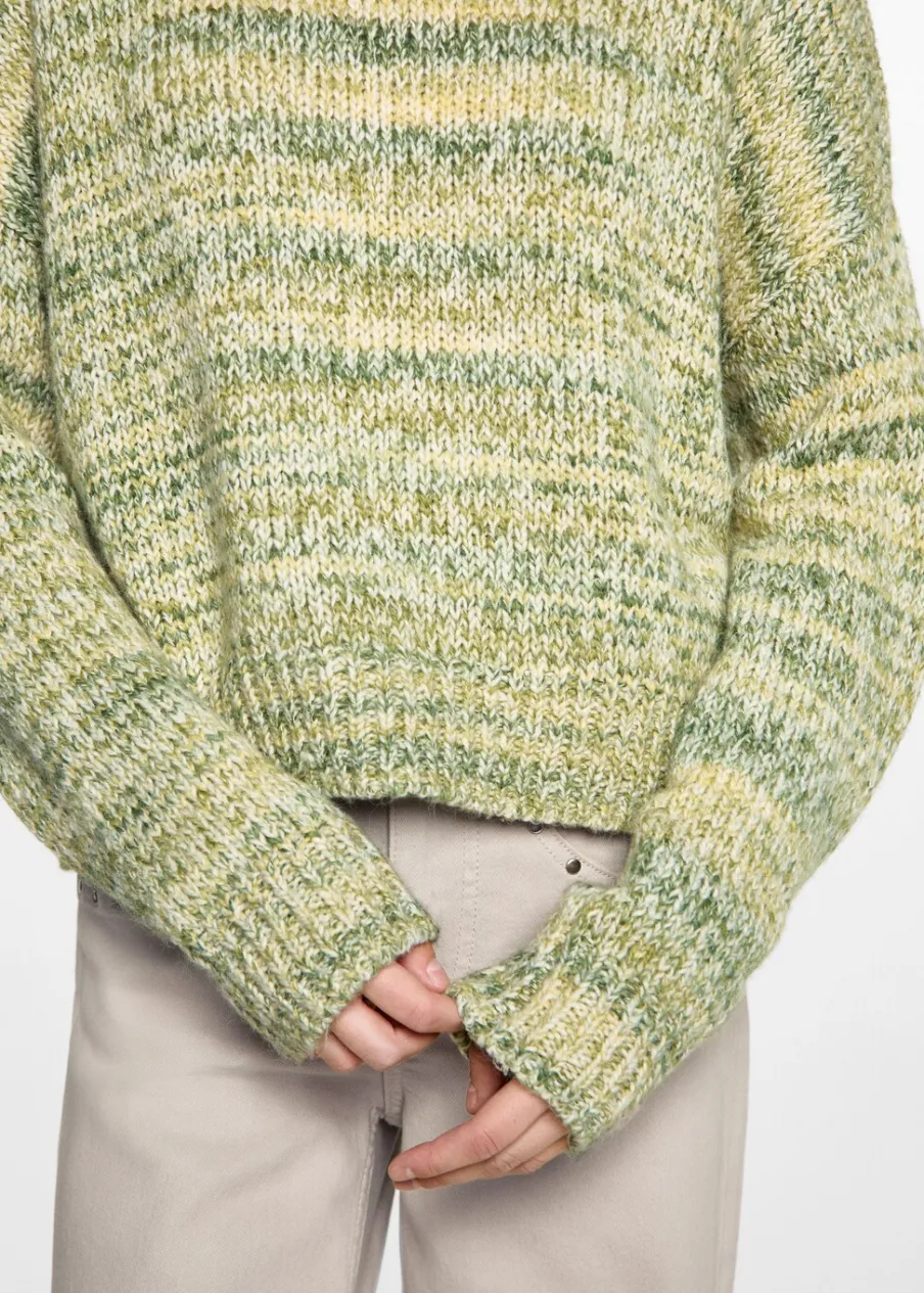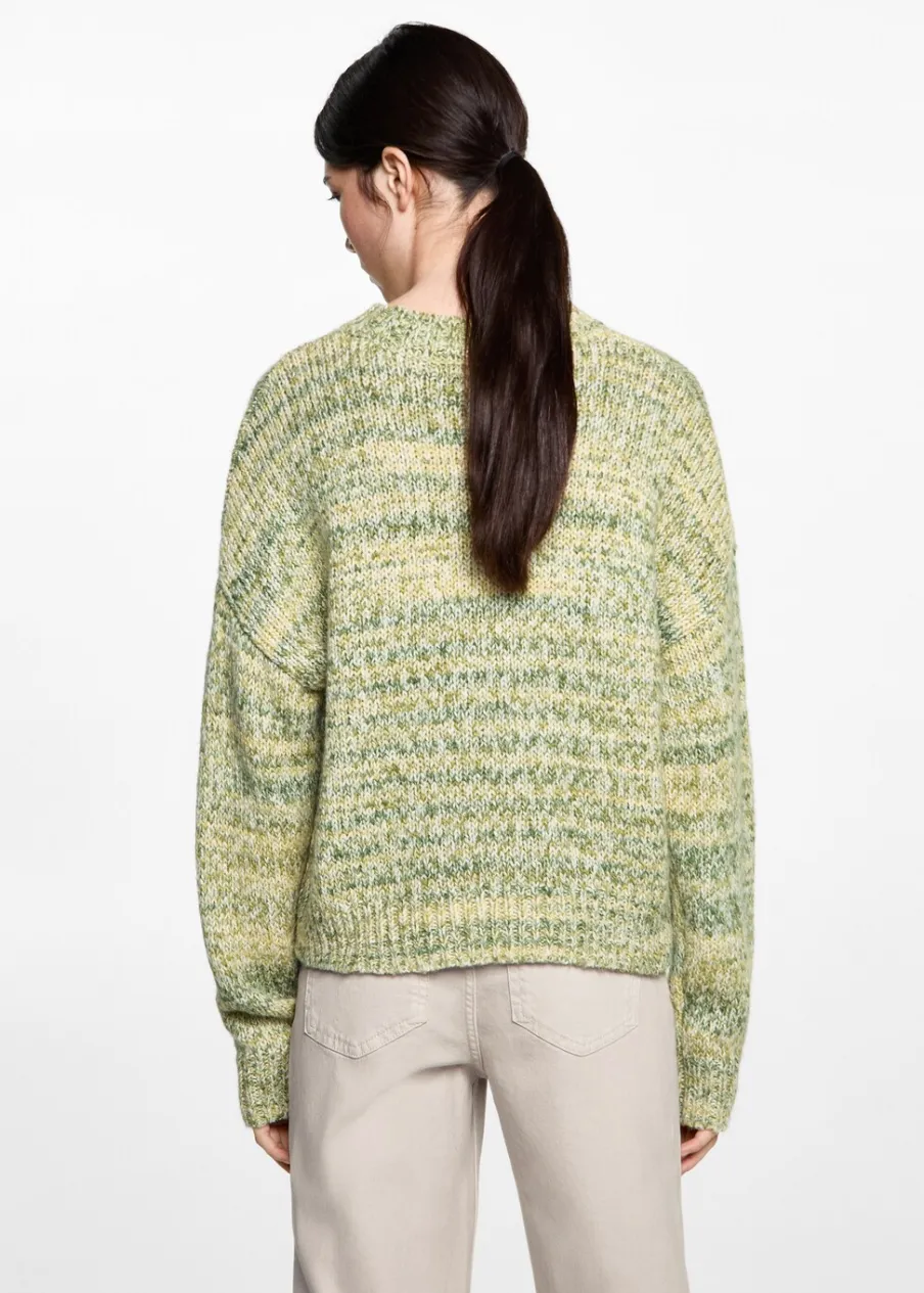 OpisWełniana tkanina. Bawełniana tkanina. Deseń melanżowy. Dzianina średniej grubości. Długi rękaw. Okrągły de…