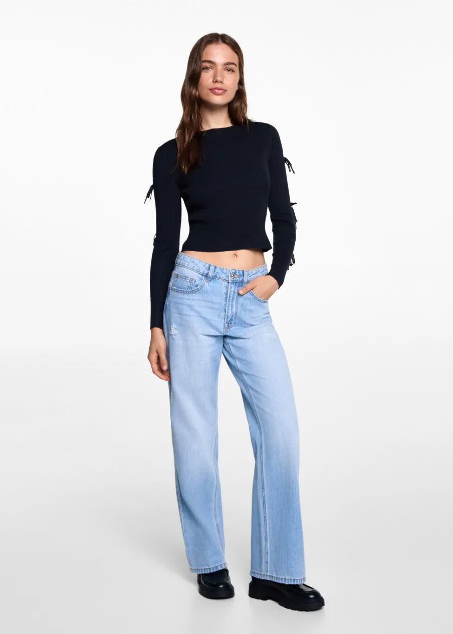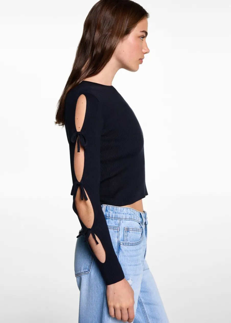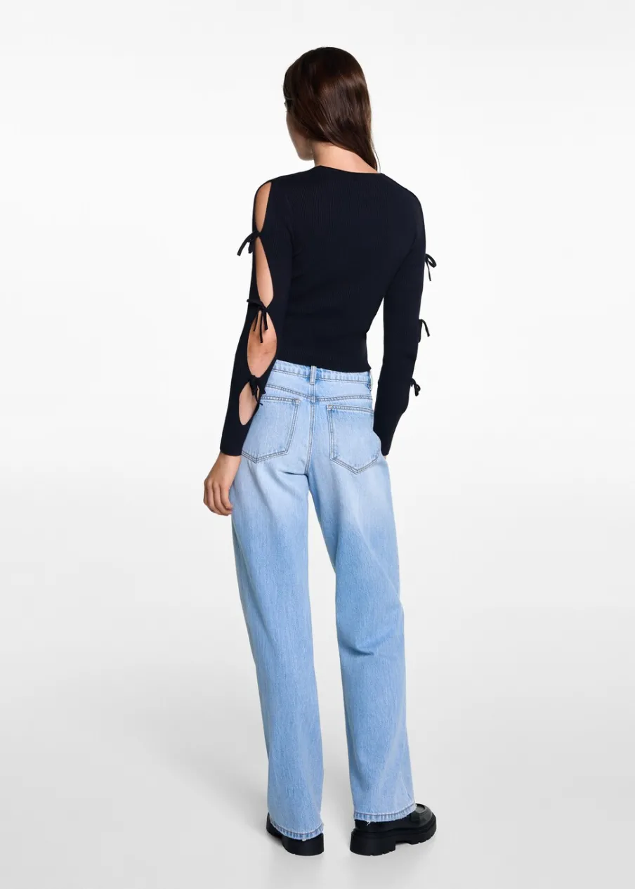 Powrót do szkoły. Model prosty. Okrągły dekolt. Długie rękawy z rozcięciem. Regulowane wiązanie. Modelka ma 172 cm wzrostu i nosi rozmiar M.