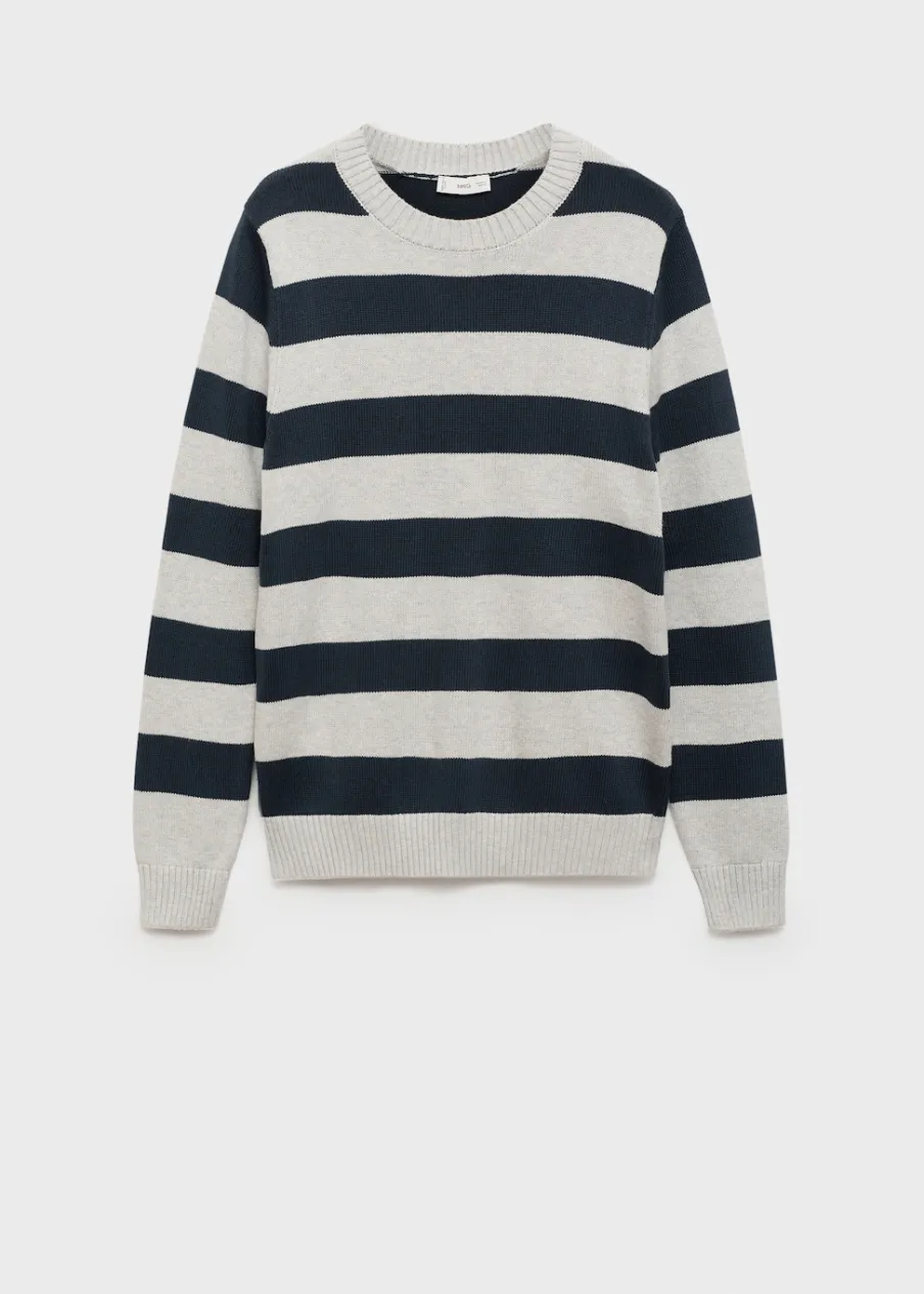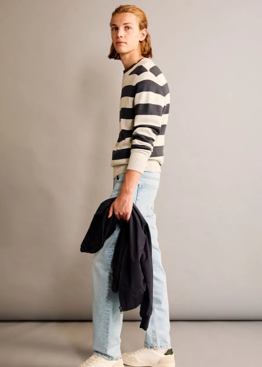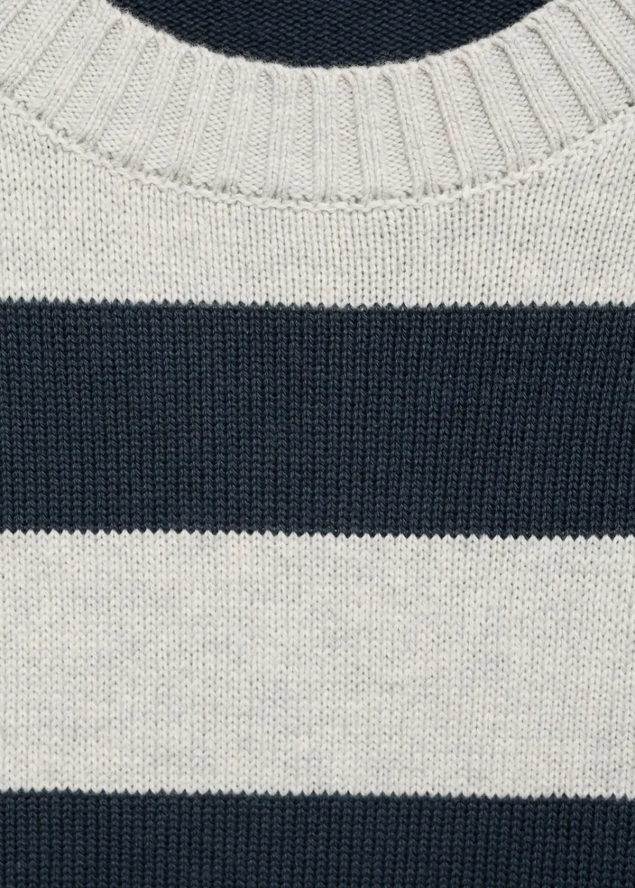 Dzianina. Model prosty. Wzór w paski. Okrągły dekolt. Długi rękaw. Bez zapięcia. Model ma 175 cm wzrostu i nosi rozmiar M.