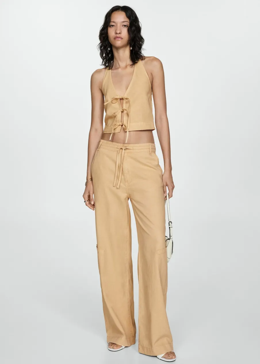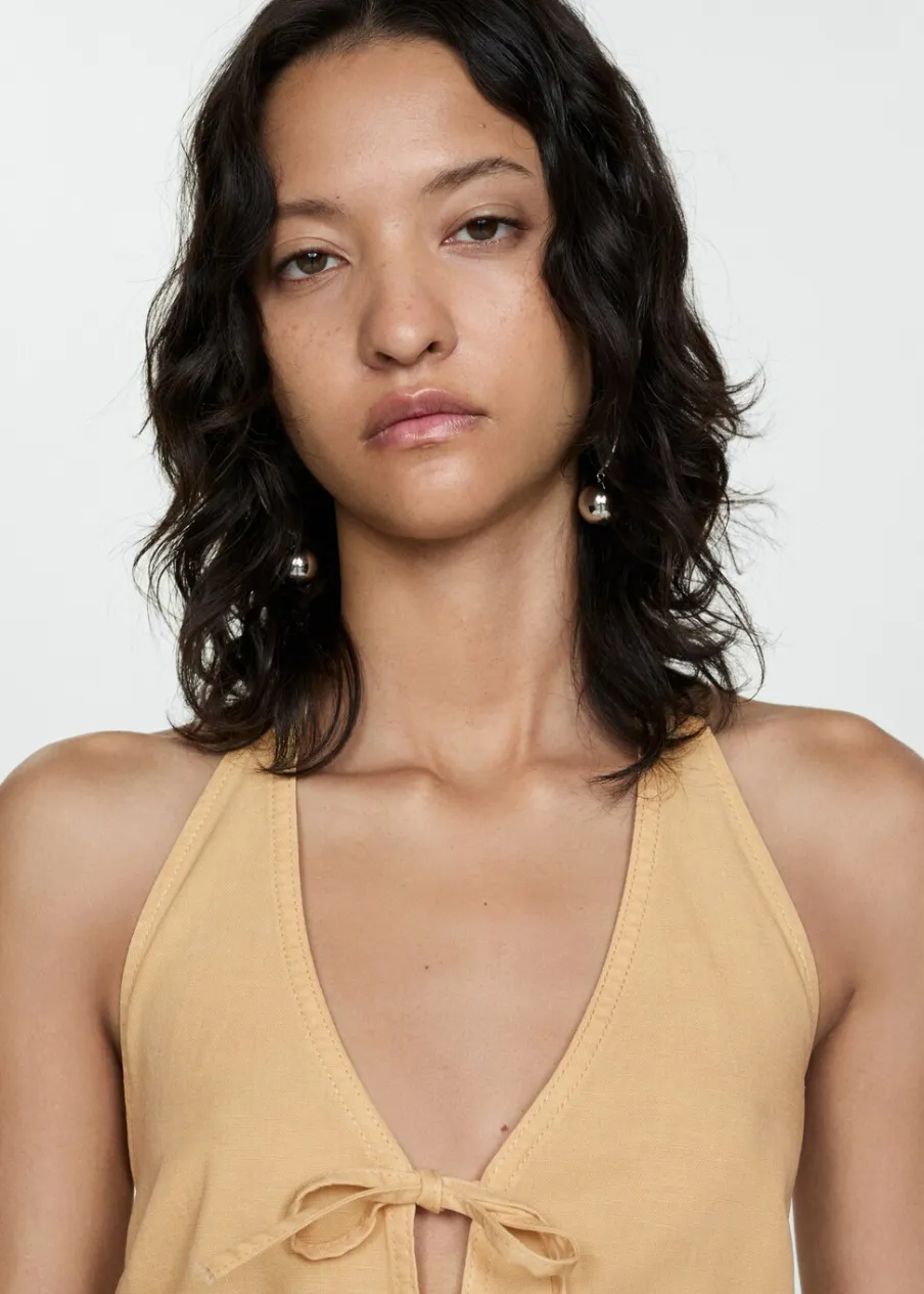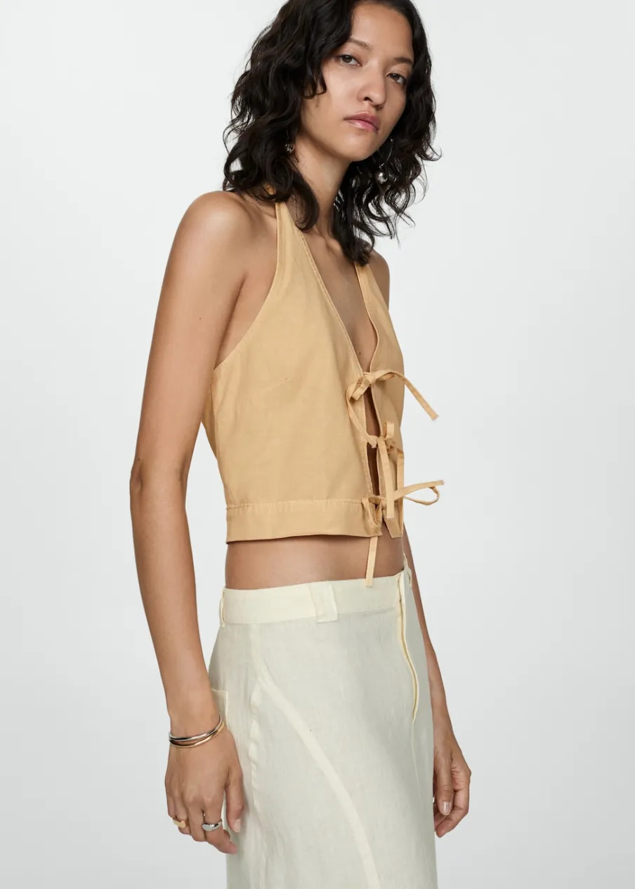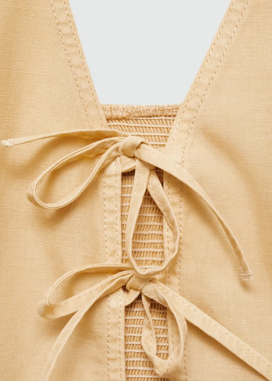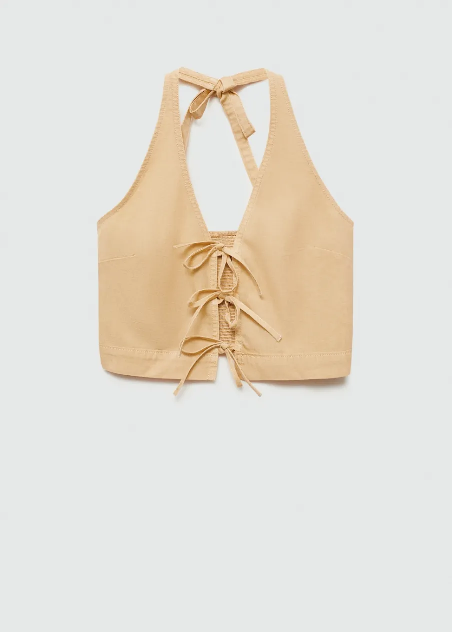 Deseń crop. Model prosty. Dekolt w stylu halter. Bez rękawów. Wiązanie z przodu. Wiązanie na szyi. Marszczony panel ze ściegiem typu plaster miodu. Total look. Średnia wielkość. Slim-fit. Miękki denim. Tkanina mieszana z lyocellu, bawełny i lnu.
