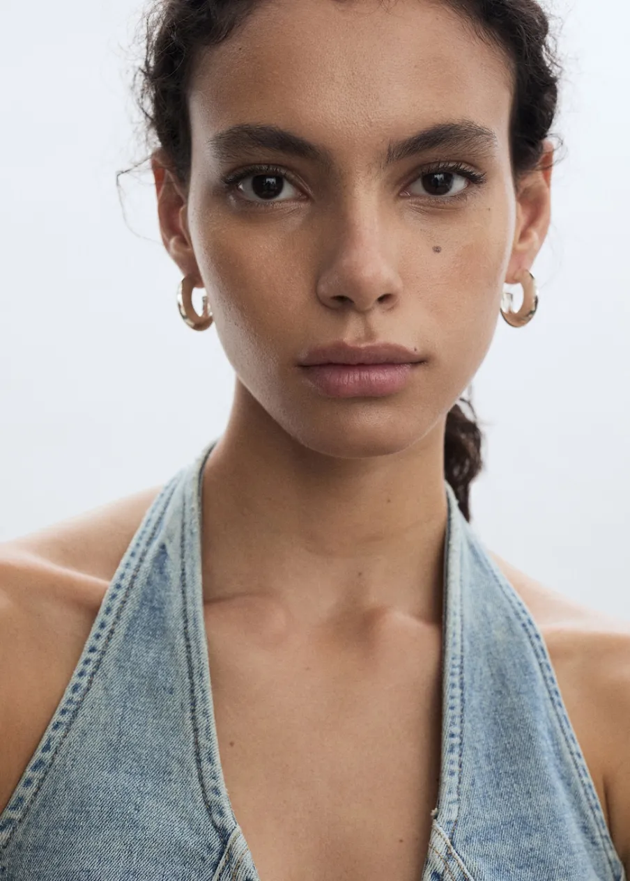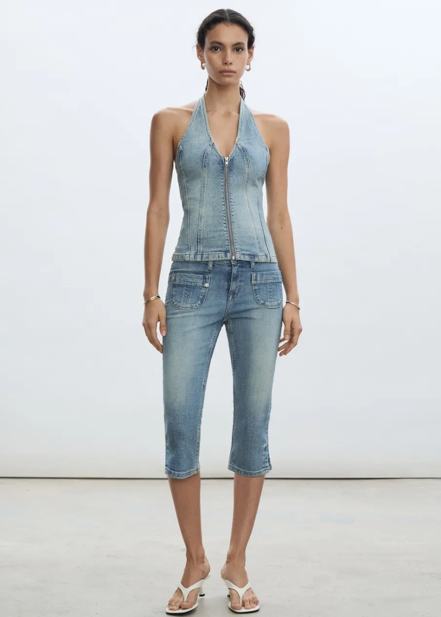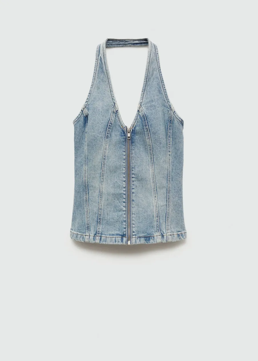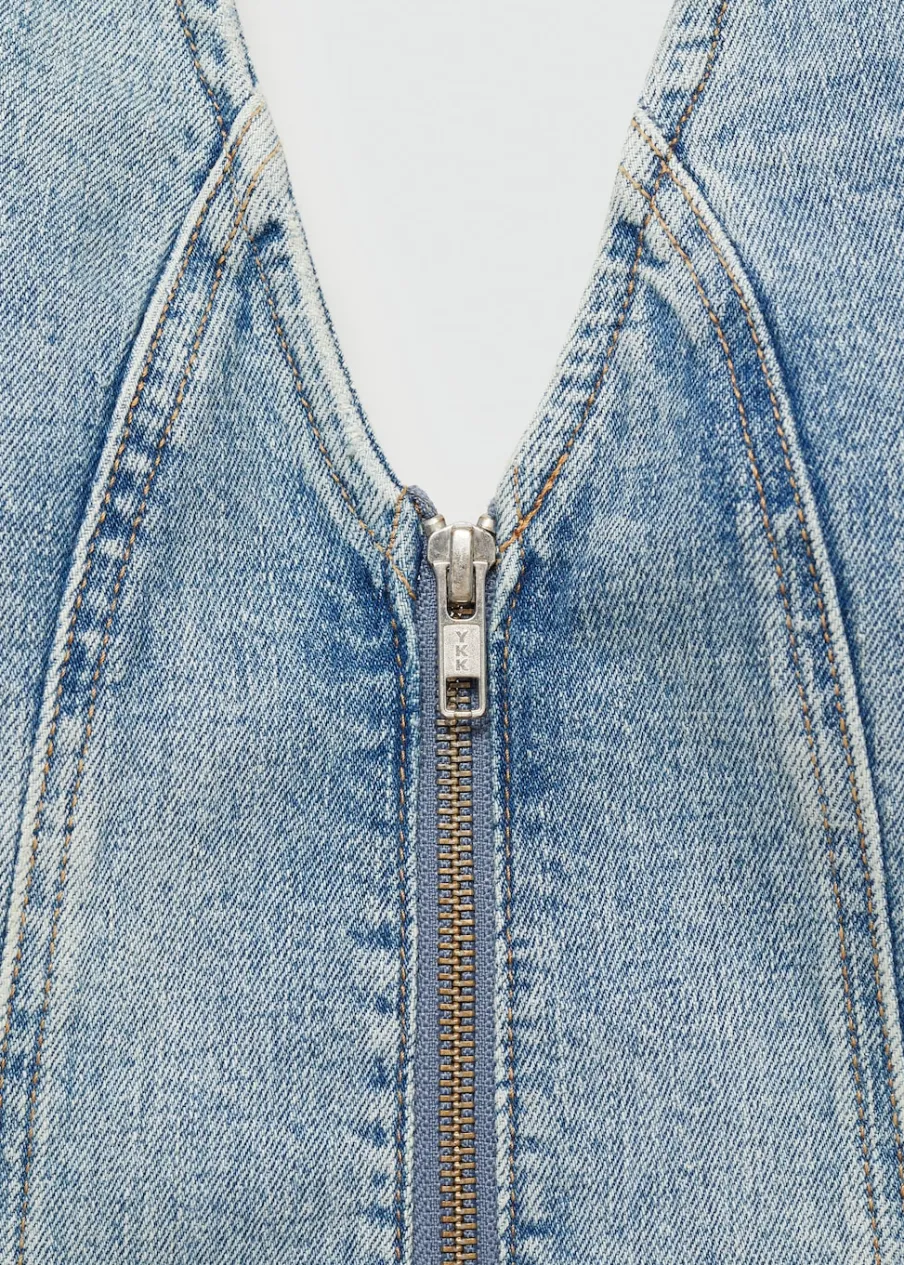 Tkanina bawełniana w dżinsowym stylu. Dekolt w stylu halter. Bez rękawów. Zapięcie na zamek z przodu. Total look. Model wcięty. Długość wewnętrzna 45,5 cm.