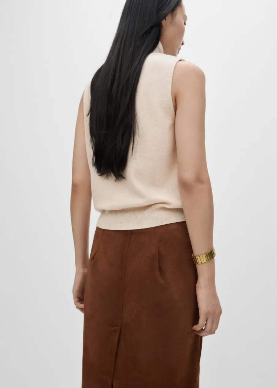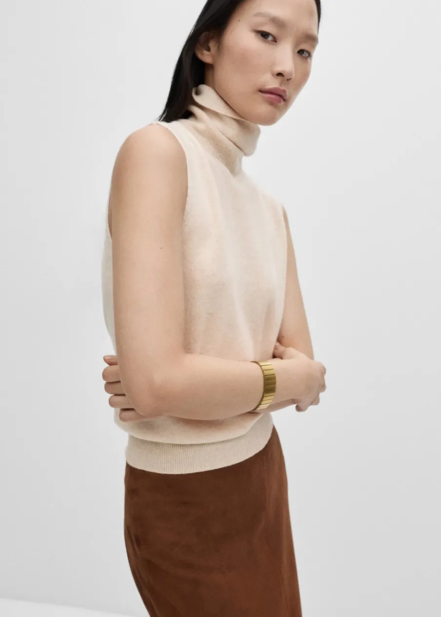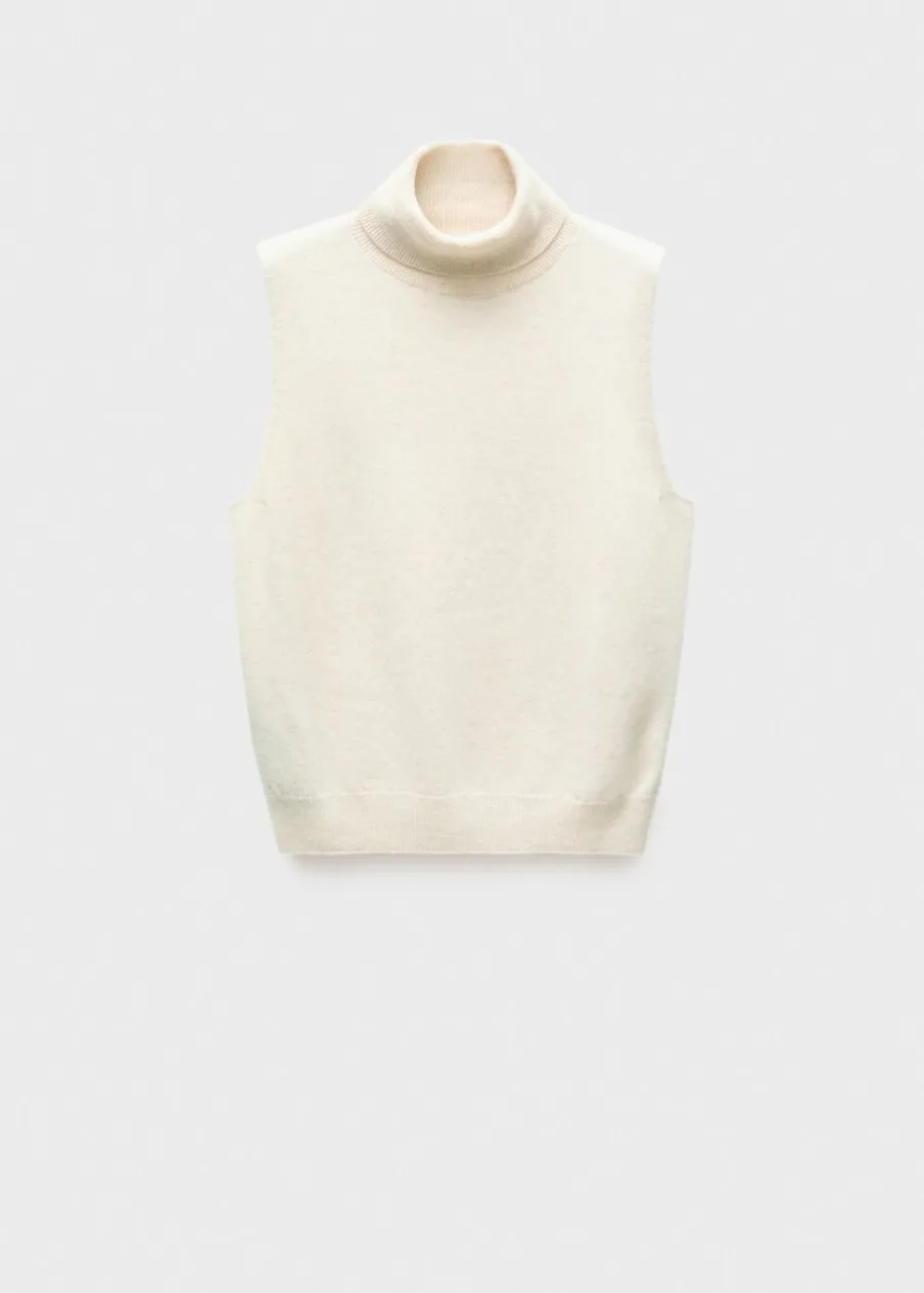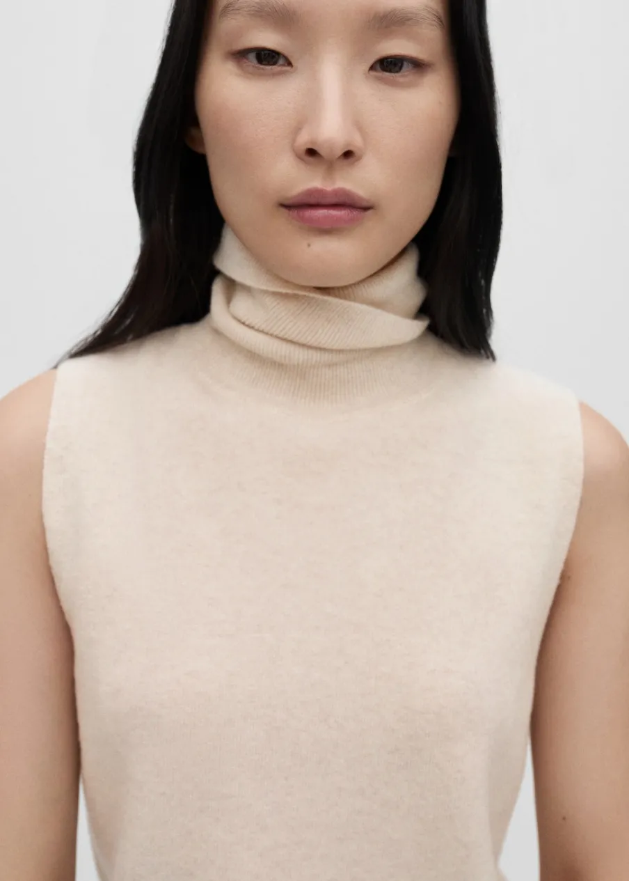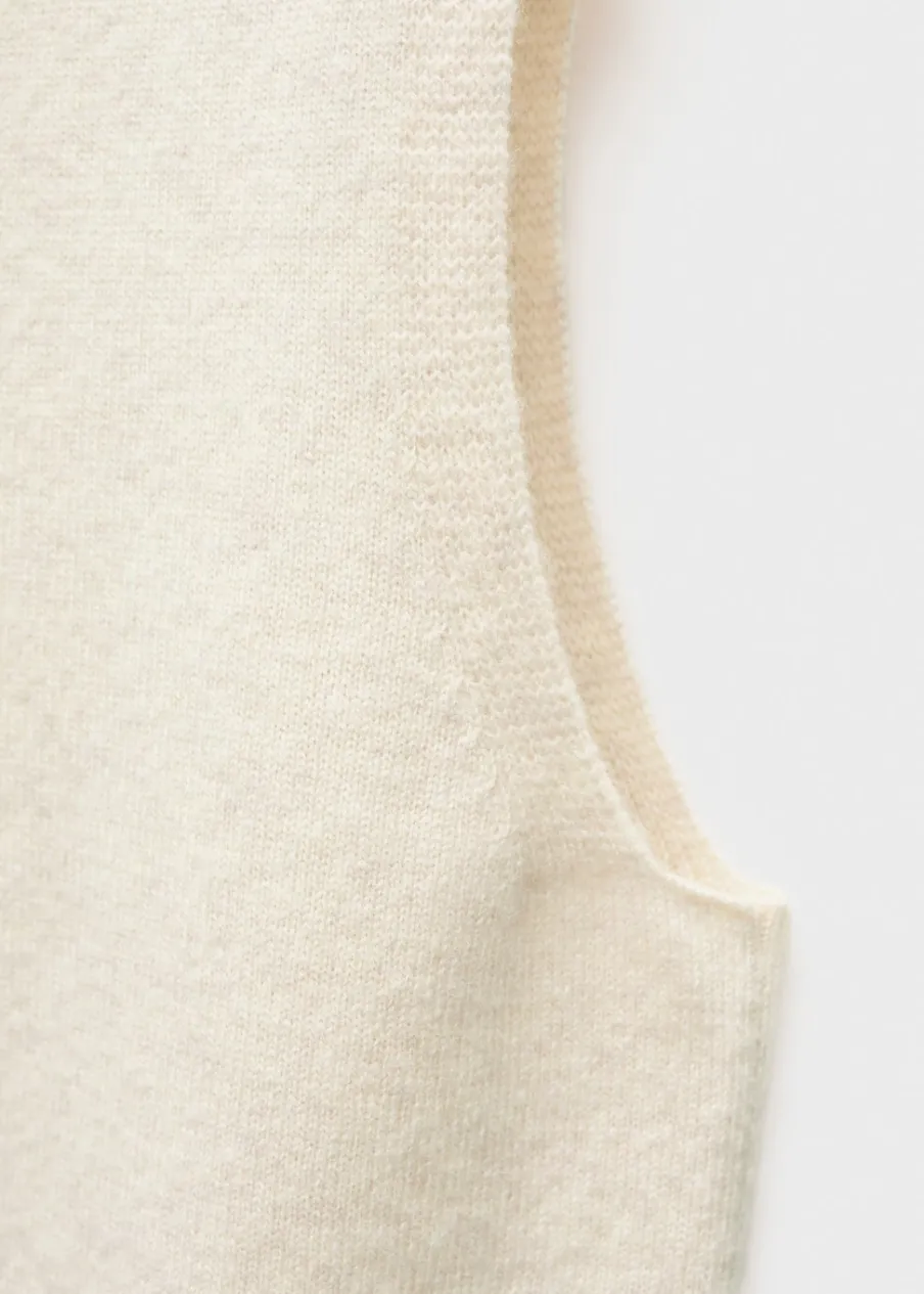 Bez rękawów. Tkanina z cienkiej dzianiny. Ściągaczowe wykończenia. Kolekcja Selection. Modelka ma 175 cm wzrostu i nosi rozmiar S/36. Tkanina z 100% wełny. Wywinięty kołnierz. Model prosty.