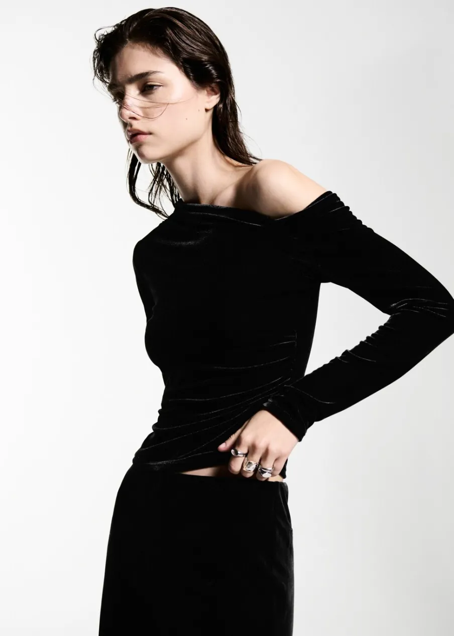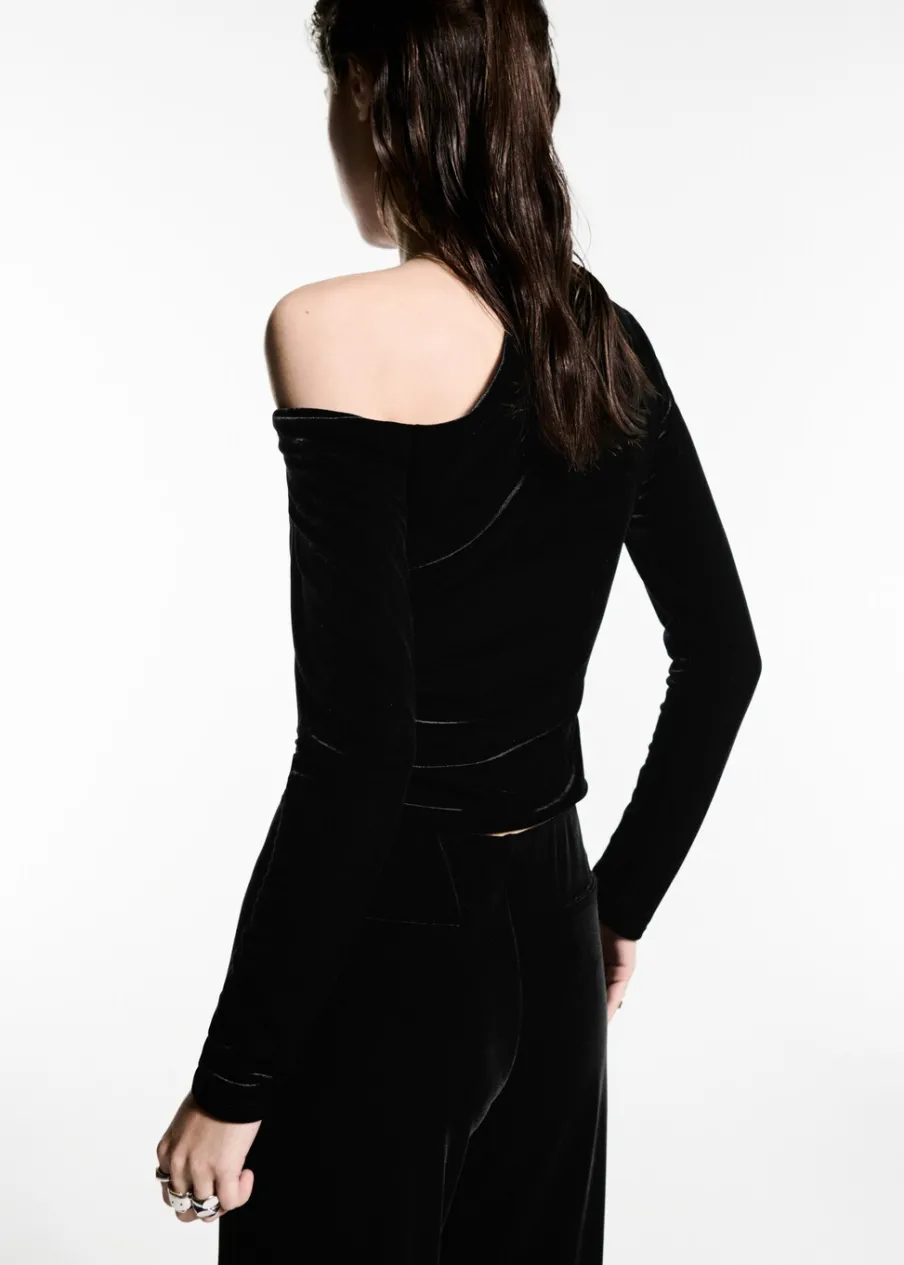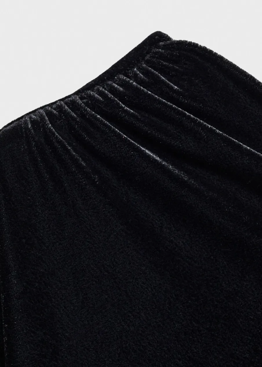 Aksamitna tkanina. Asymetryczny krój. Model wcięty. Asymetryczny dekolt. Długi rękaw. Marszczona tekstura. Bez zapięcia. Modelka ma 177 cm wzrostu i nosi rozmiar S/36. Kolekcja wizytowa. Średnia wielkość. Model standardowy. Slim-fit.