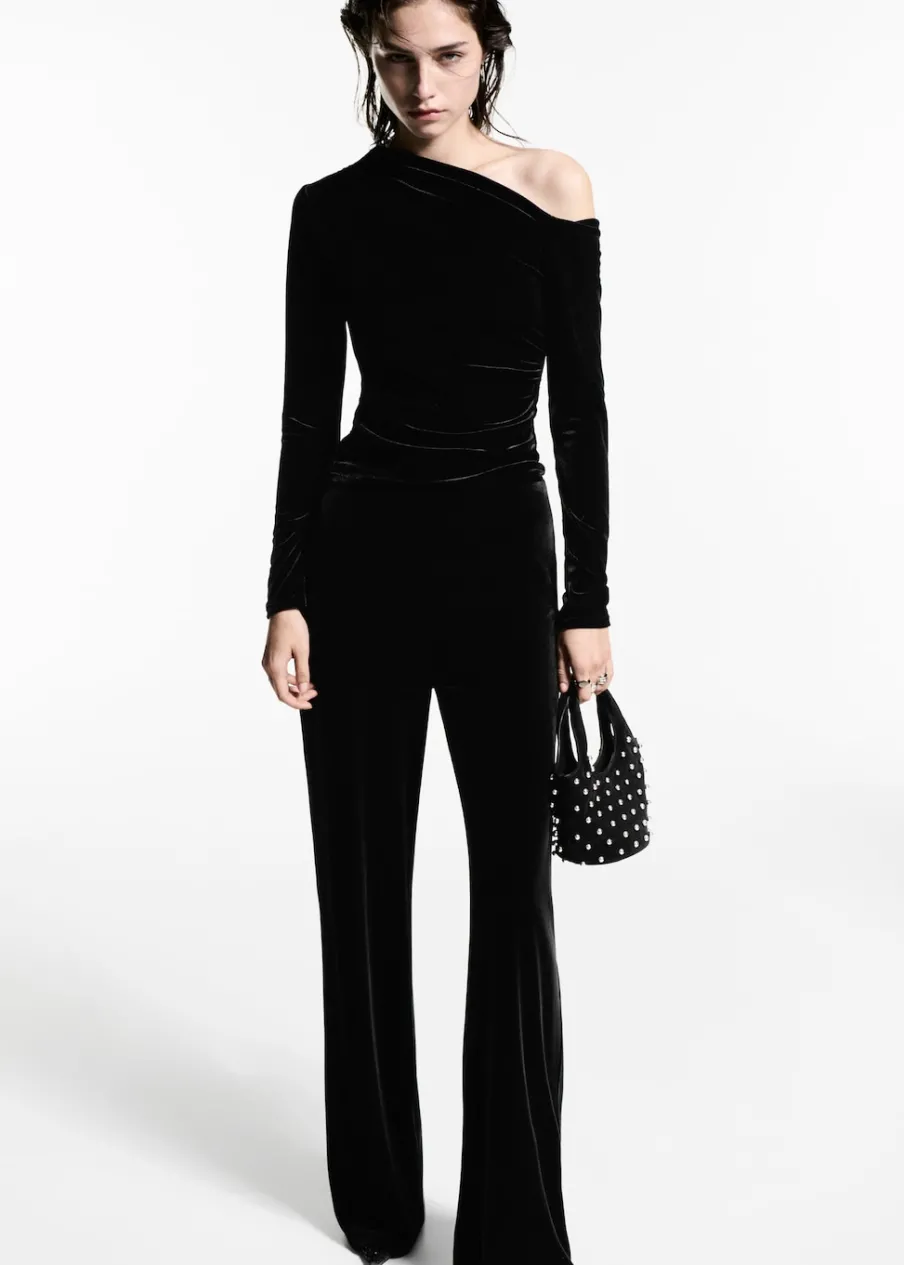 Bársony anyag, slim fit, közepes méretű, normál fazon, aszimmetrikus dizájn, szűkebb modell, asszimetrikus nyakrész, hosszú ujj, ráncolt részletek, zár nélkül, a modell 1,77 cm magas és S/36 méretet visel, parti és ünnepi kollekció.