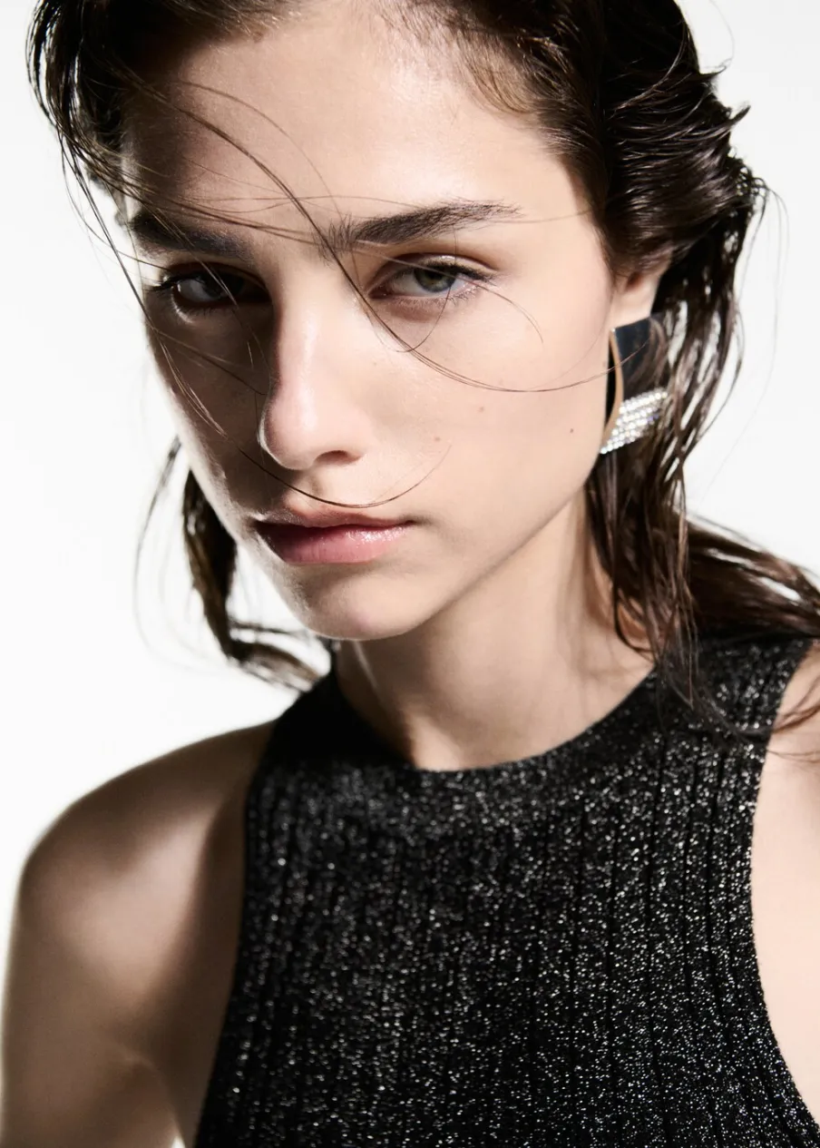 Tkanina z cienkiej dzianiny. Tkanina lureks. Model wcięty. Dekolt w stylu halter. Bez rękawów. Bez zapięcia. Modelka ma 177 cm wzrostu i nosi rozmiar S/36. Kolekcja wizytowa.