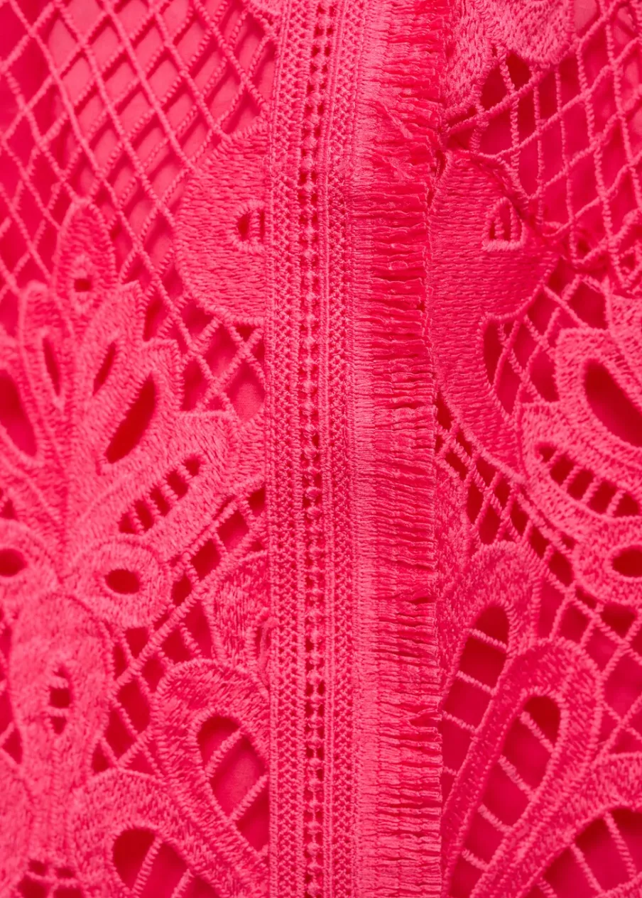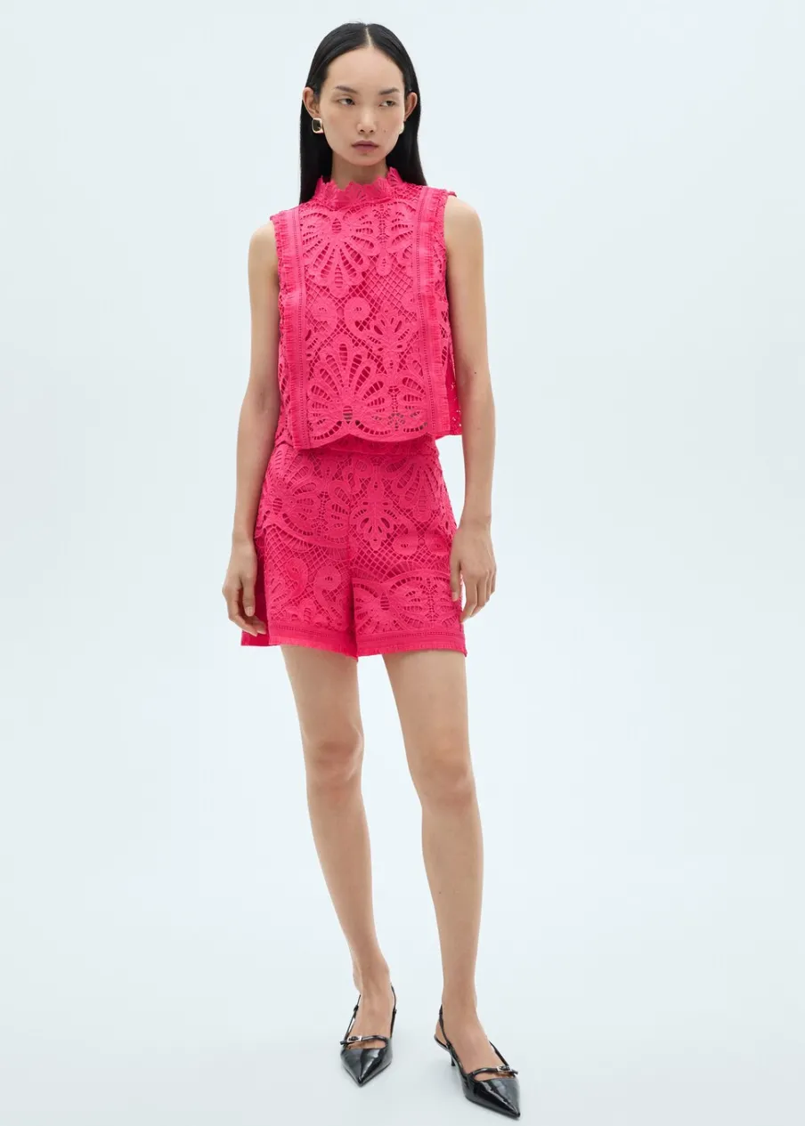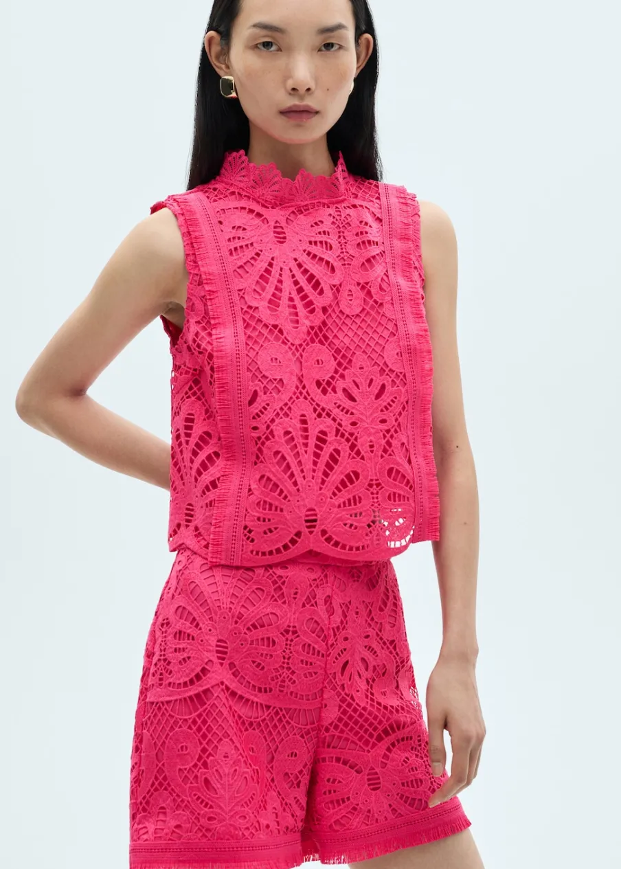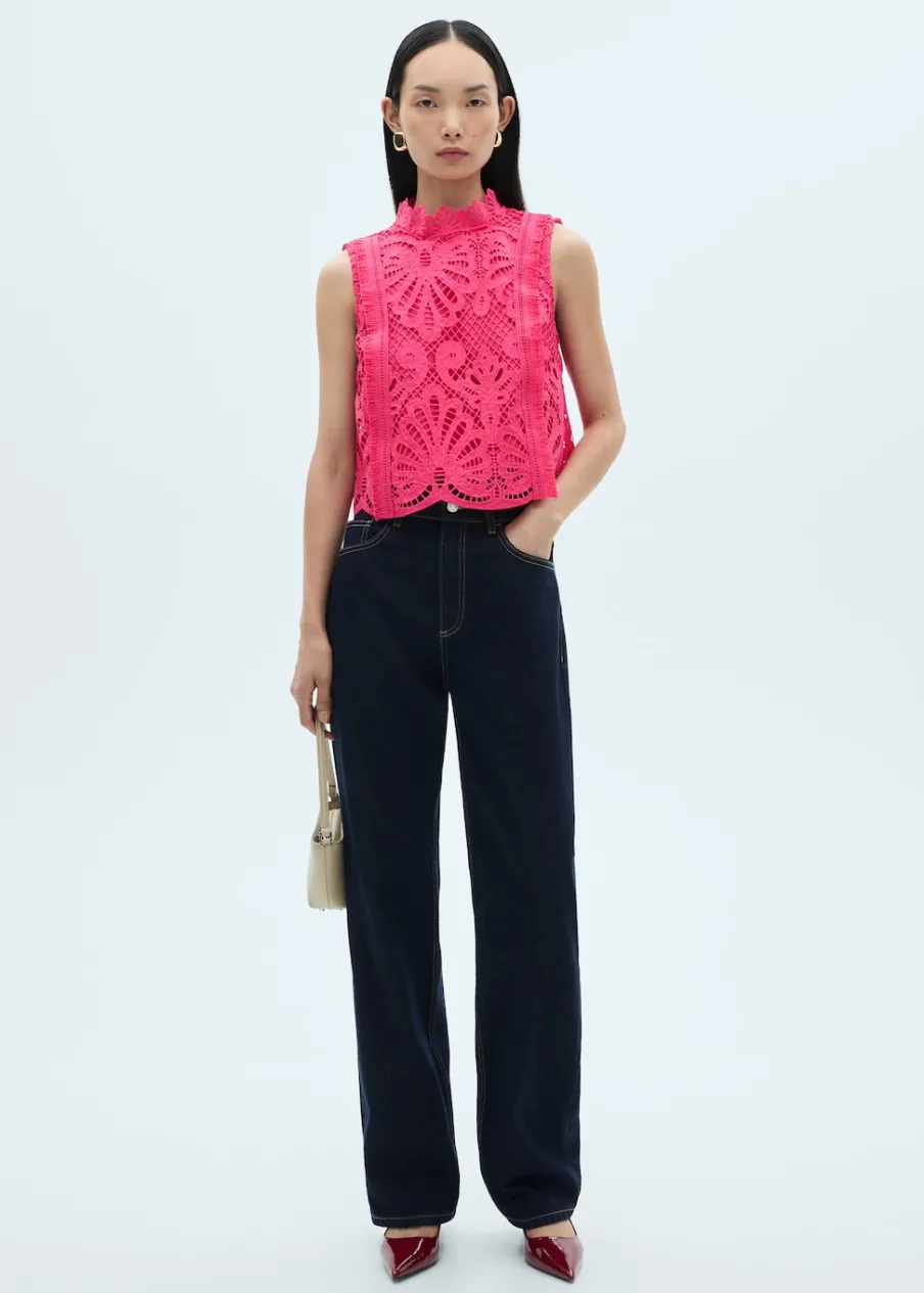 Tkanina z cienkiej dzianiny. Model prosty. Szydełkowy model. Półgolf. Bez rękawów. Zapięcie na guzik z tyłu. Wewnętrzna podszewka. Total look.