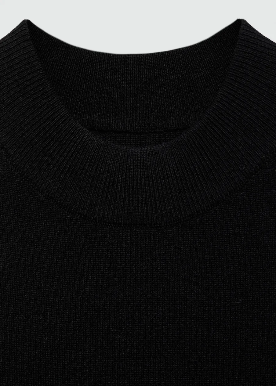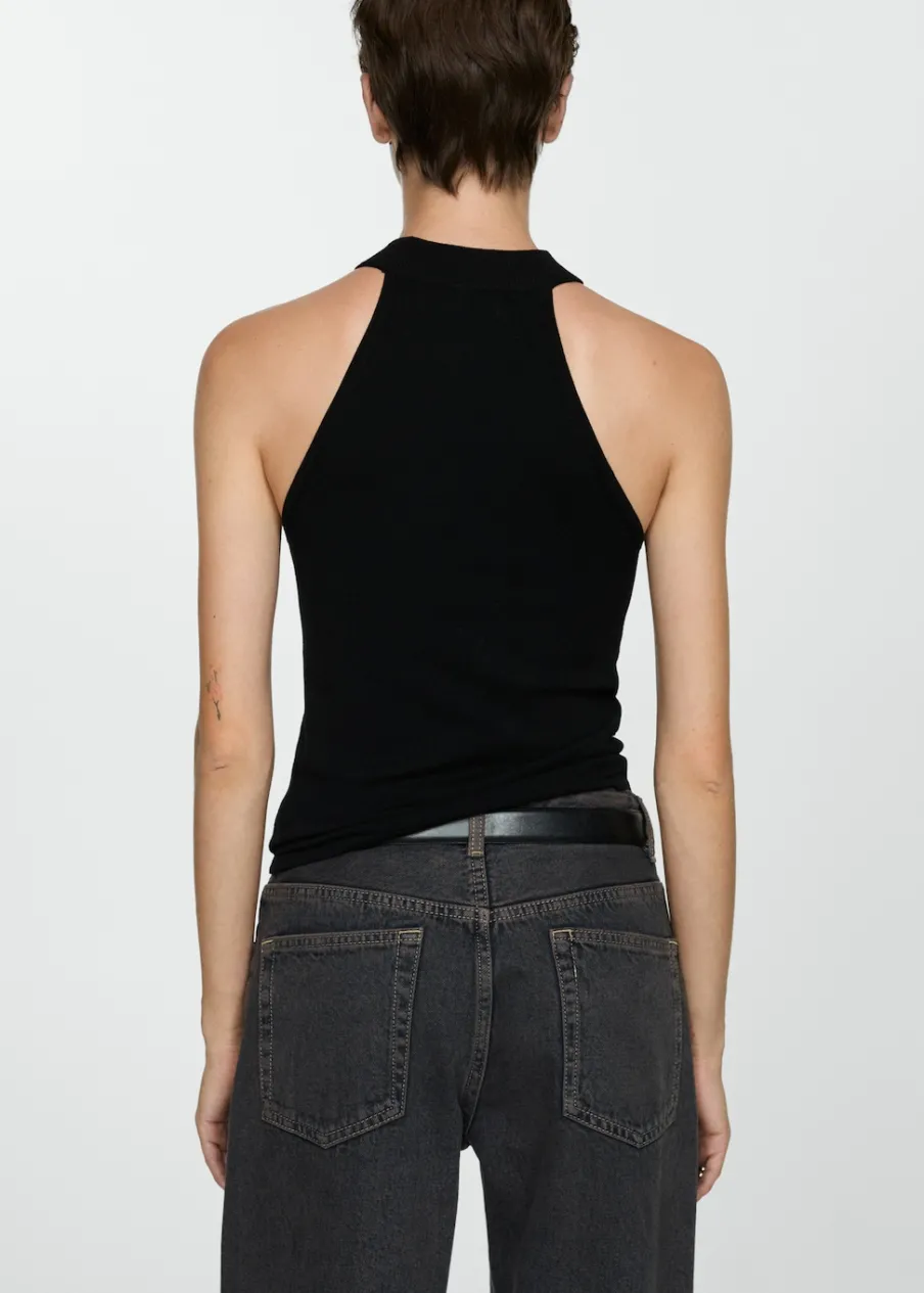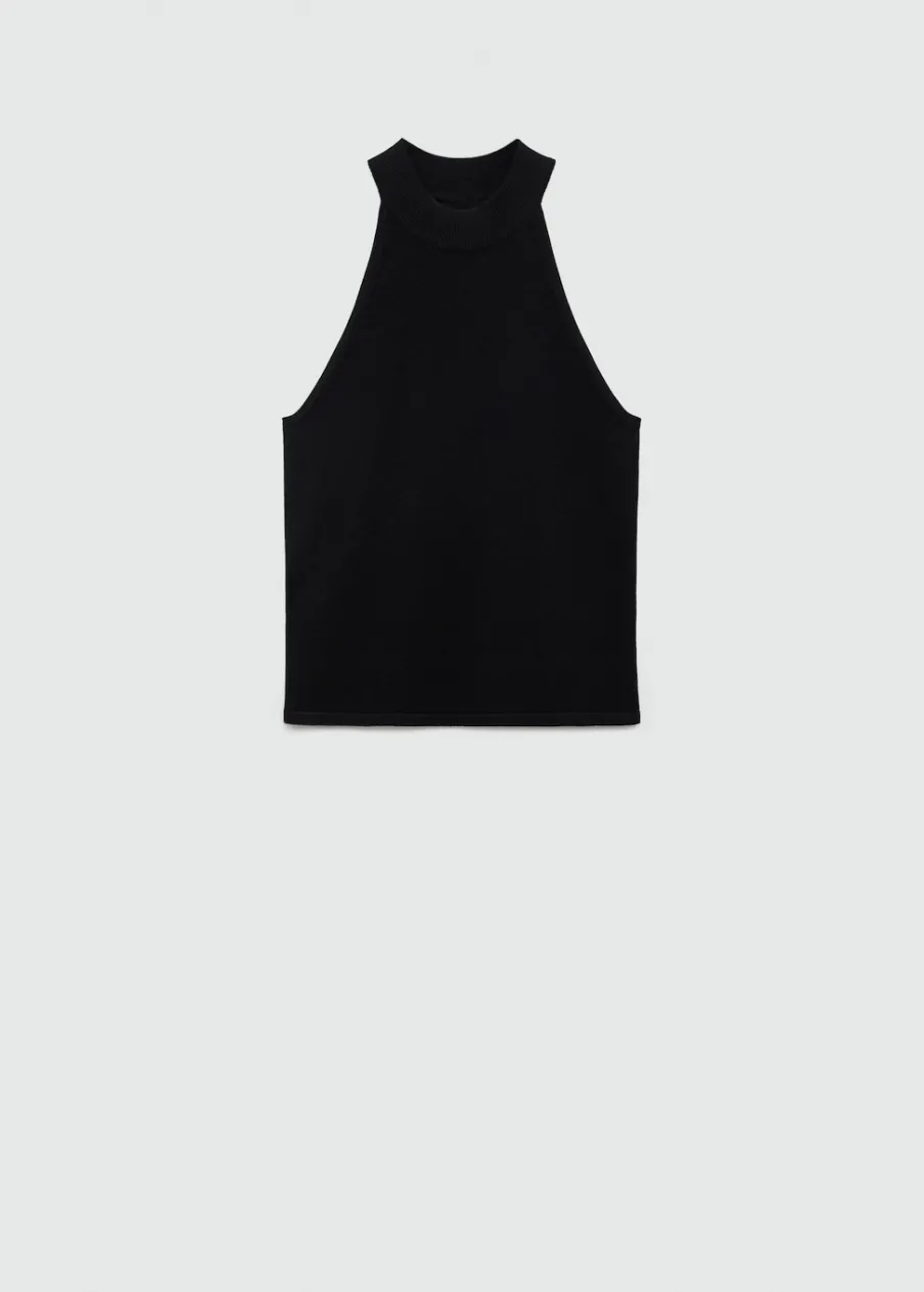 Tkanina z cienkiej dzianiny. Model prosty. Dekolt w stylu halter. Bez rękawów. Model wcięty.