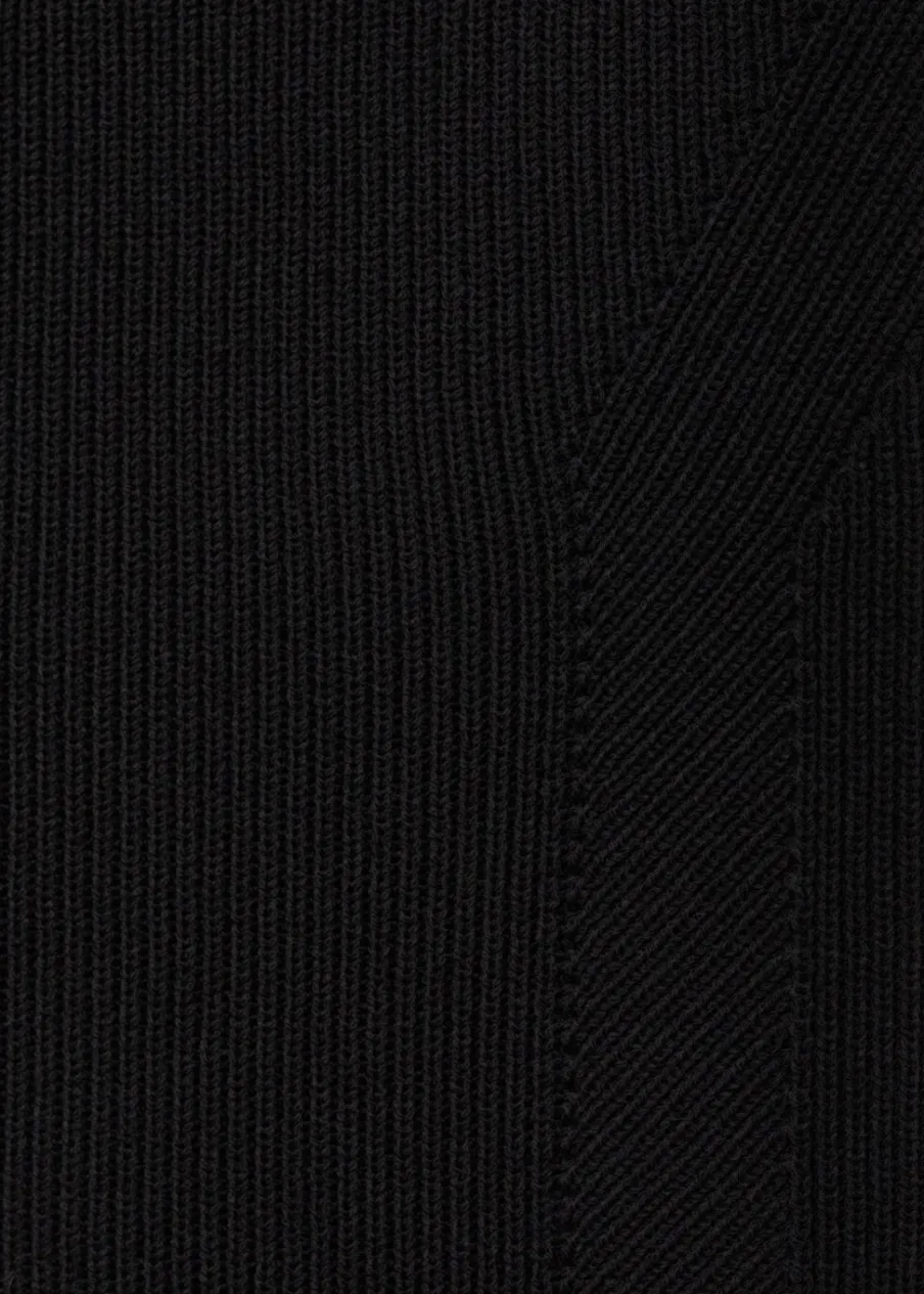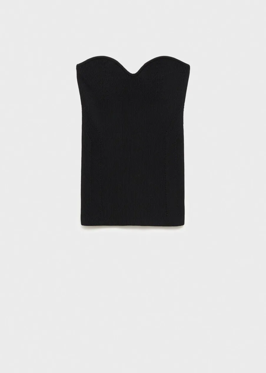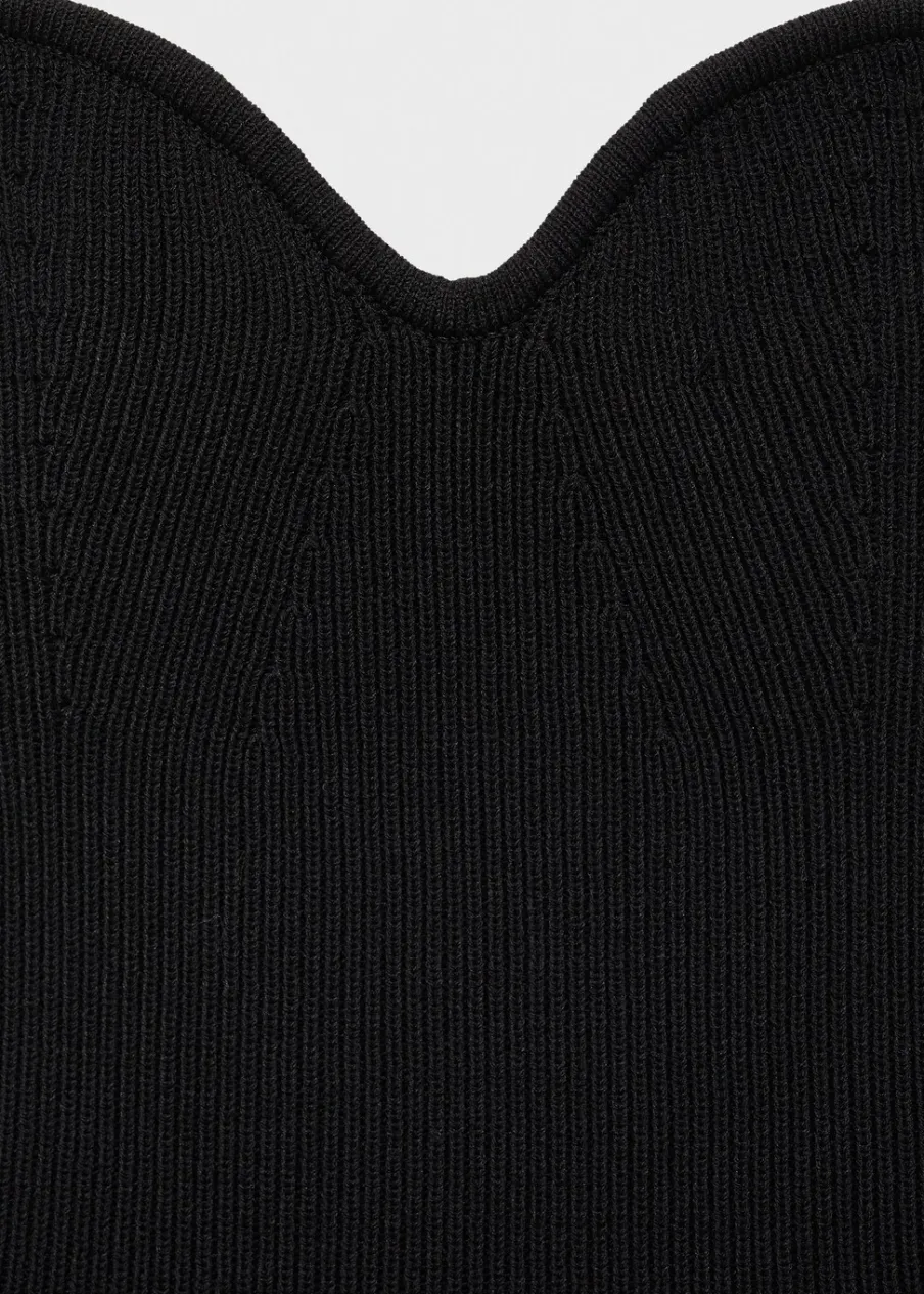 Dzianinowa tkanina. Model wcięty. Dekolt w kształcie serca. Bez rękawów. Bez zapięcia. Kolekcja wizytowa. Modelka ma 181 cm wzrostu i nosi rozmiar S/36.