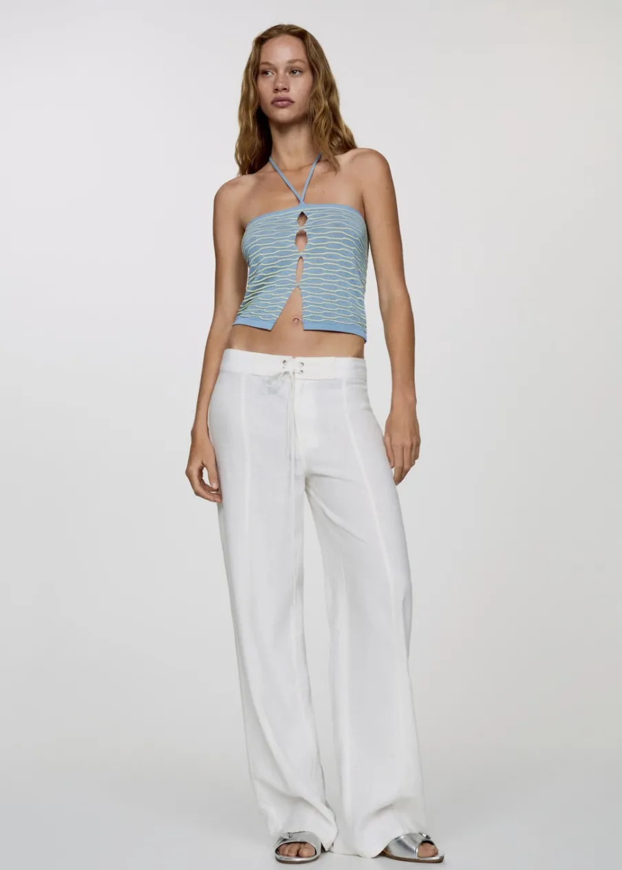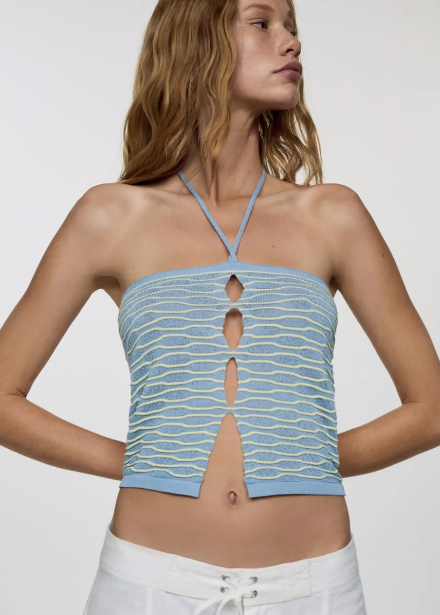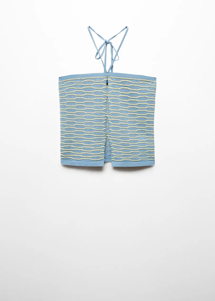 Tkanina z cienkiej dzianiny. Teksturowana tkanina. Deseń crop. Dekolt w stylu halter. Bez rękawów. Cienkie ramiączka. Wiązanie na szyi. Detal z rozcięciem. Model wcięty.