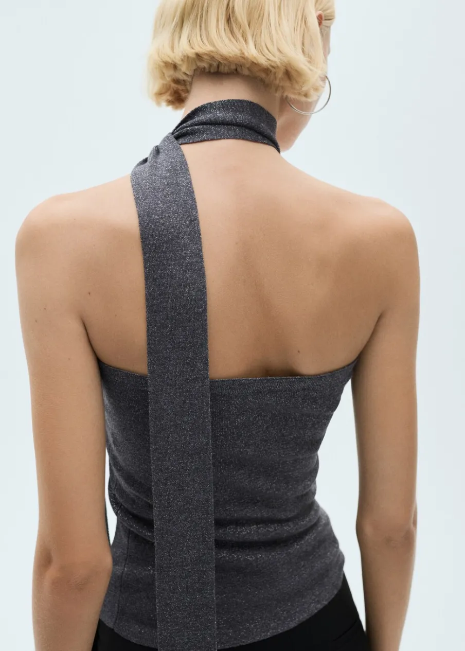 Tkanina z cienkiej dzianiny. Tkanina lureks. Model wcięty. Dekolt bez ramiączek. Bez rękawów. Szarfa pod szyją. W stylu choker. Bez zapięcia. Kolekcja wizytowa.