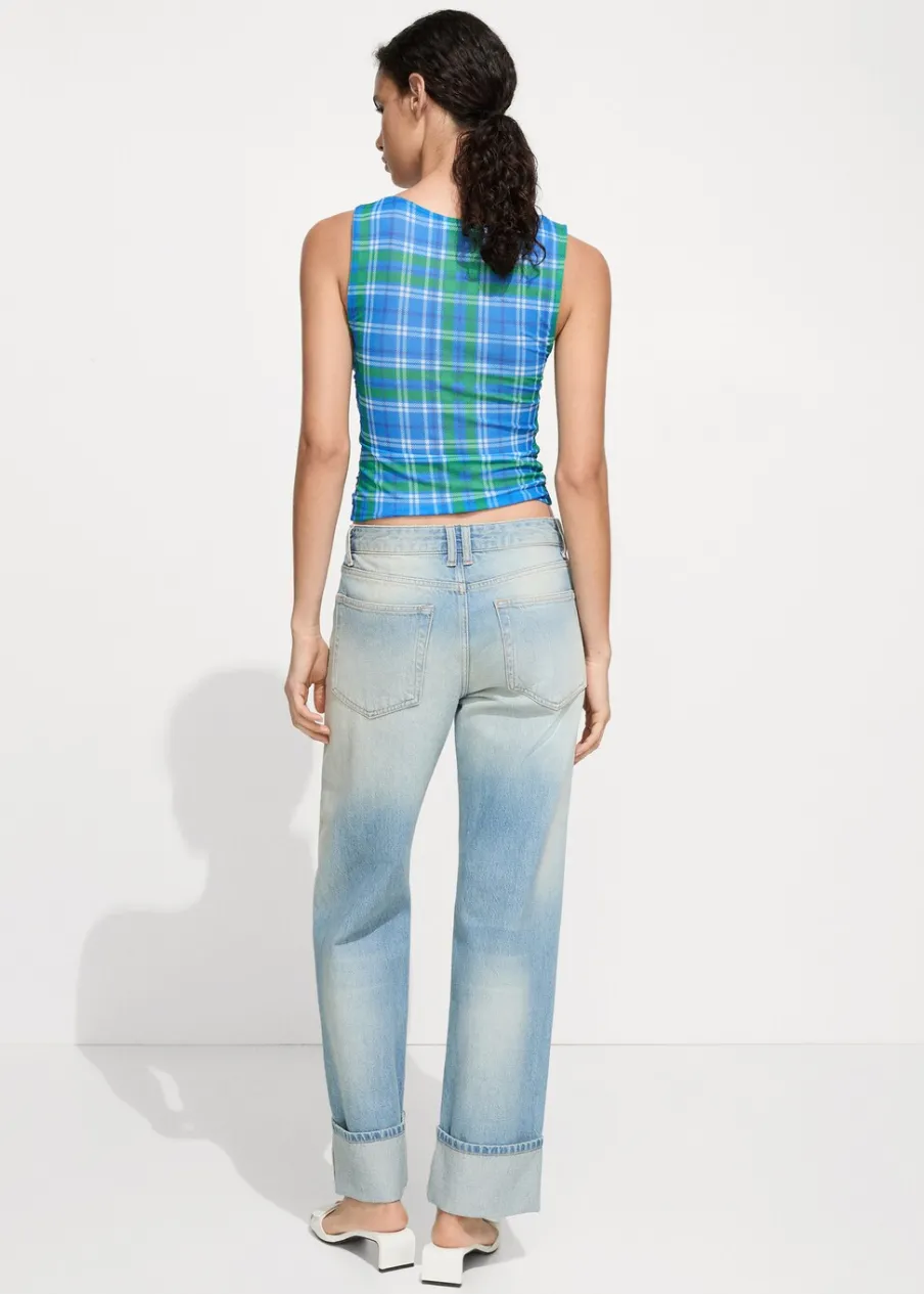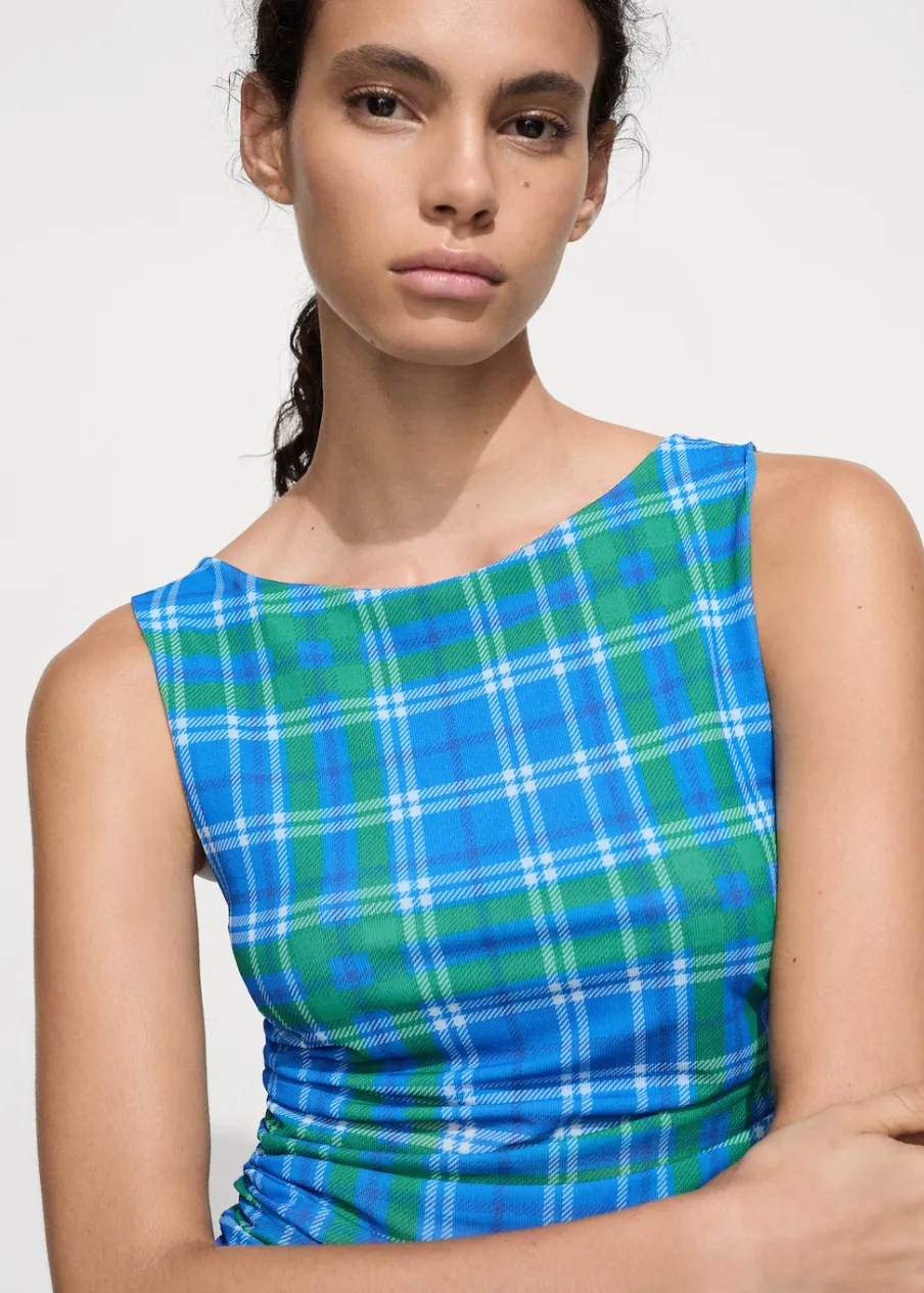 Elastyczna tkanina. Deseń crop. Wzór w kratę. Okrągły dekolt. Bez rękawów. Drapowane detale. Sezon festiwalowy. Model wcięty.