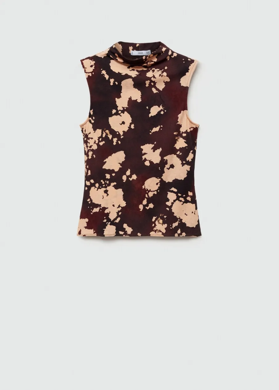 Cienka tkanina. Bez rękawów. Półgolf. Bez zapięcia. Modelka ma 177 cm wzrostu i nosi rozmiar S/36. Model wcięty. Nadruk.