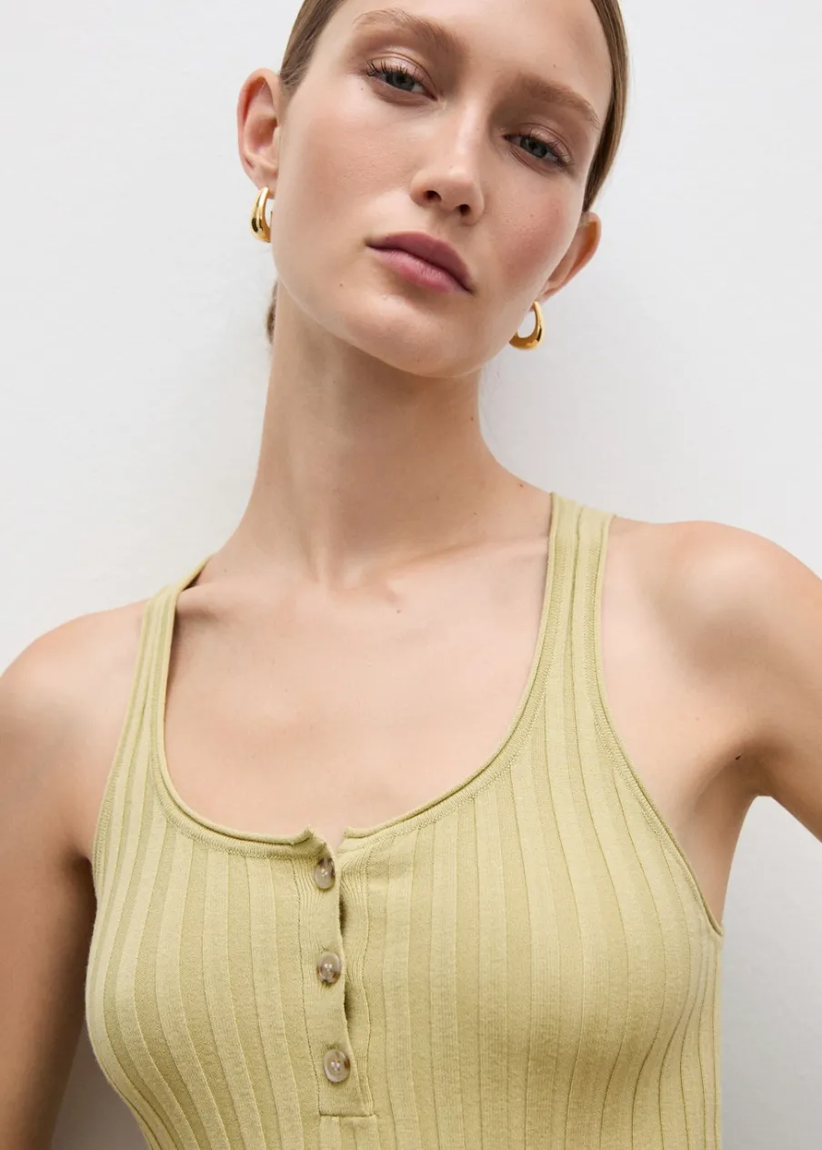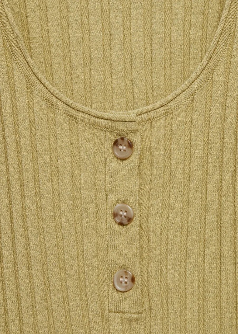 Tkanina z cienkiej dzianiny. Okrągły dekolt. Bez rękawów. Cienkie ramiączka. Ozdobne guziki. Model wcięty.