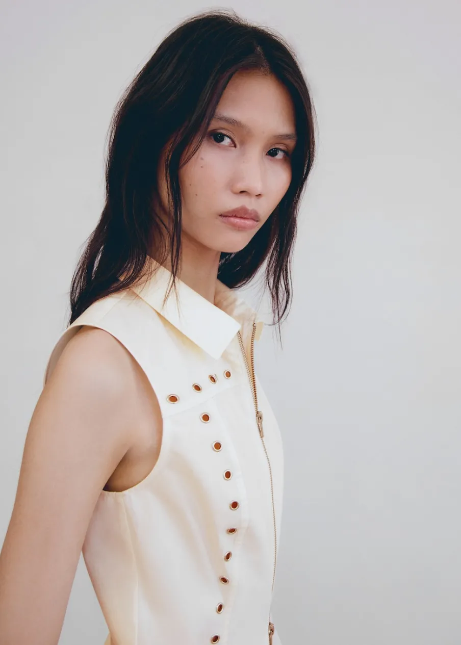 Tkanina z 100% bawełny. Model wcięty. Koszulowy kołnierz. Bez rękawów. Zapięcie z przodu na suwak. Ozdobne ćwieki. Modelka ma 178 cm wzrostu i nosi rozmiar S/36.