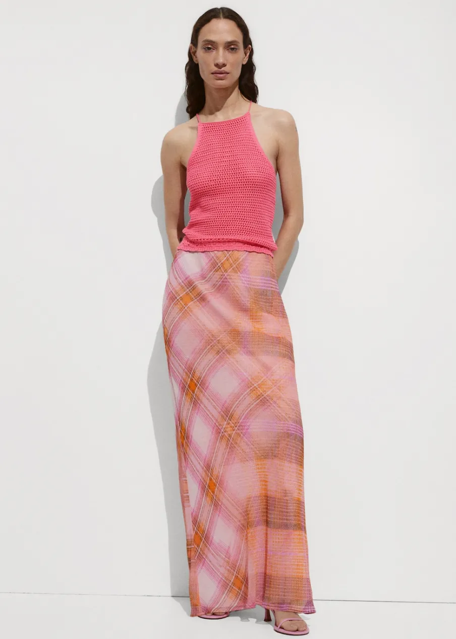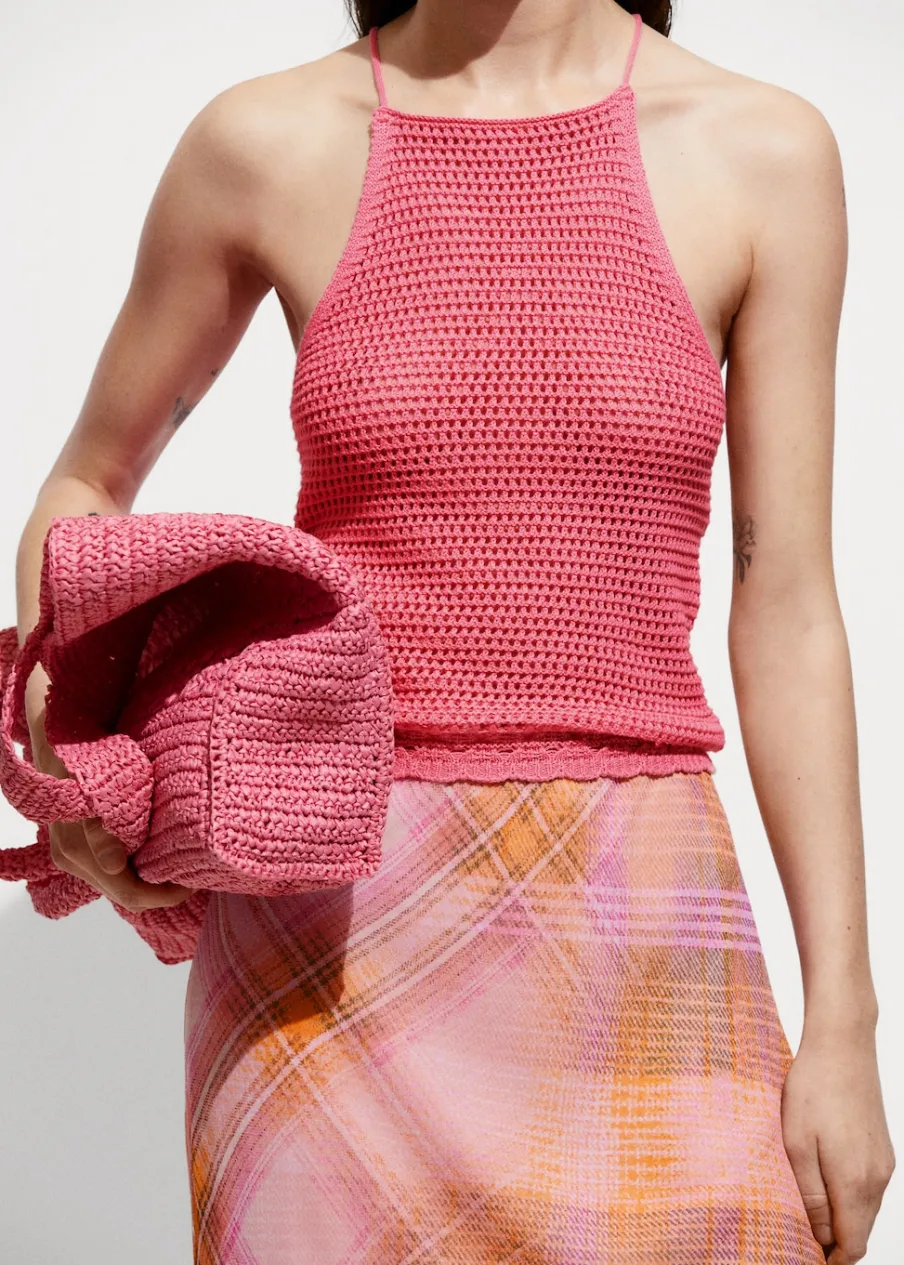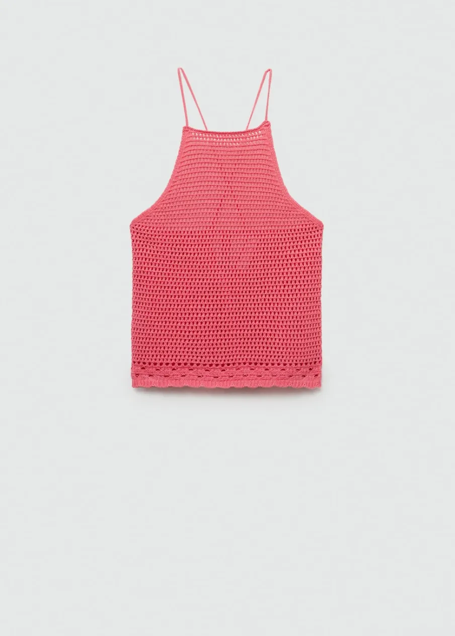 Tkanina z cienkiej dzianiny. Dekolt w stylu halter. Bez rękawów. Cienkie ramiączka. Wiązanie z tyłu. Szydełkowa tkanina. Model wcięty.