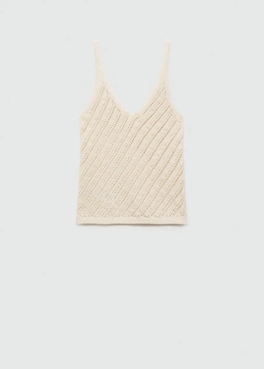 Tkanina z grubej dzianiny. Tkanina mieszanka bawełny. Model prosty. Dekolt V. Cienkie ramiączka. Bez rękawów. Szydełkowa tkanina.
