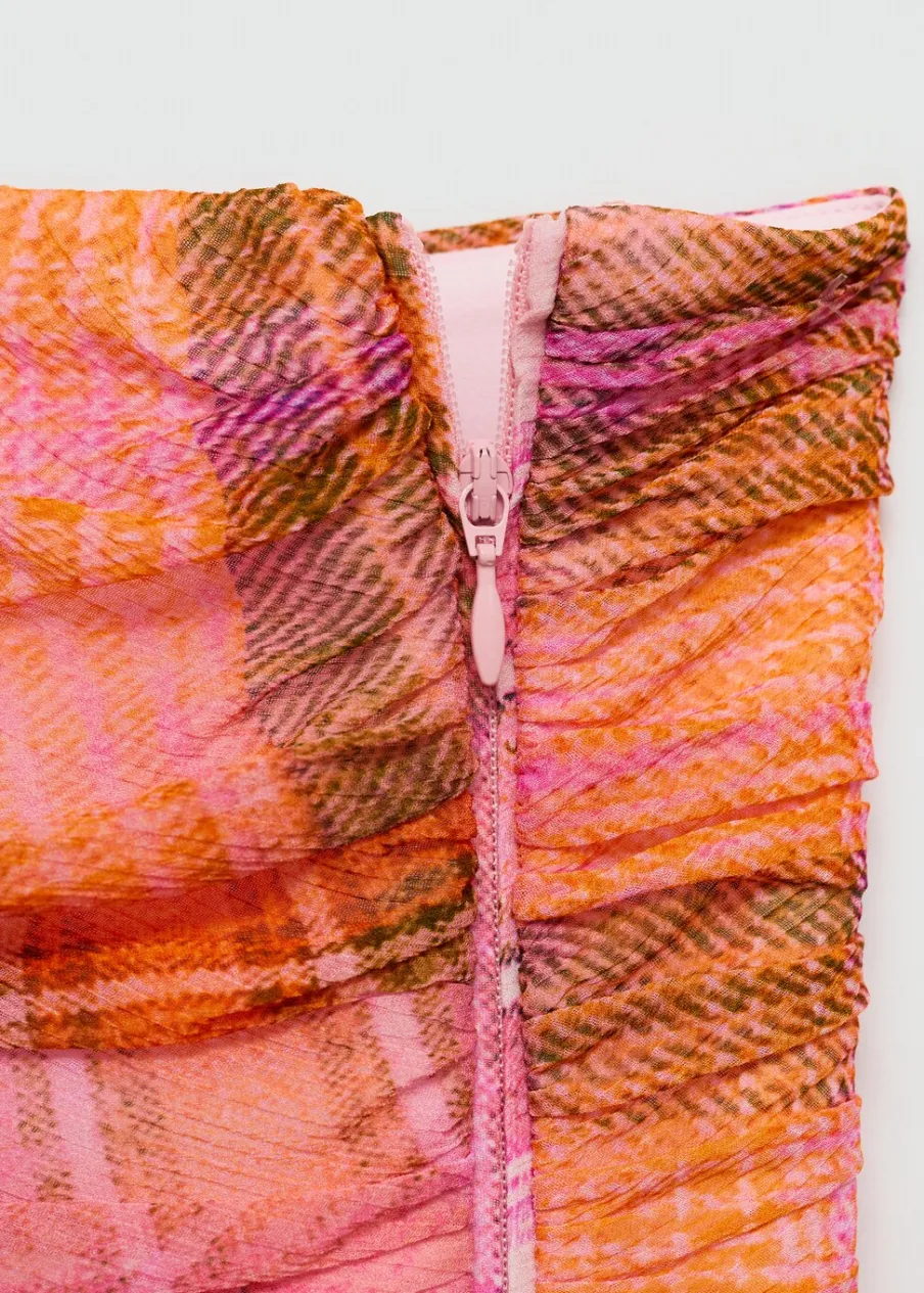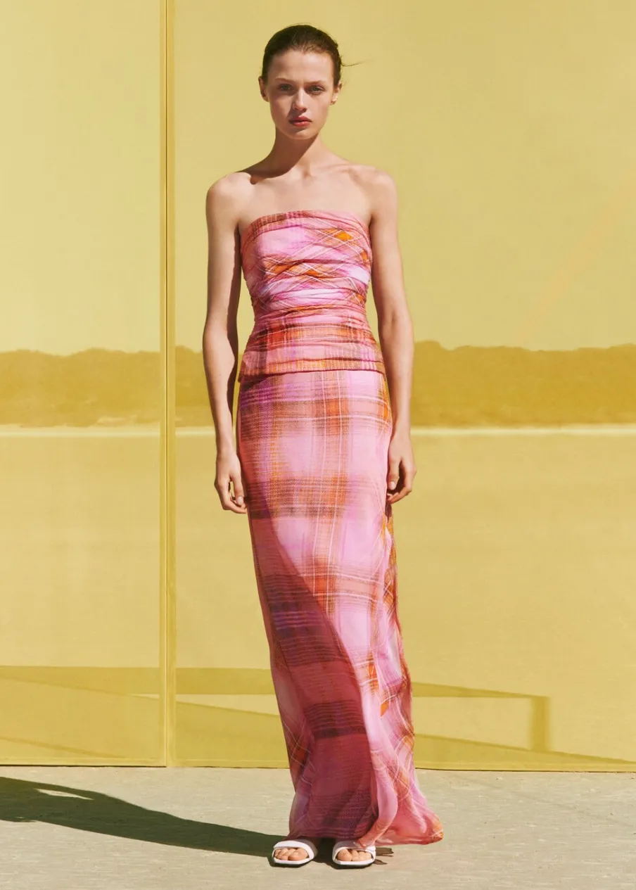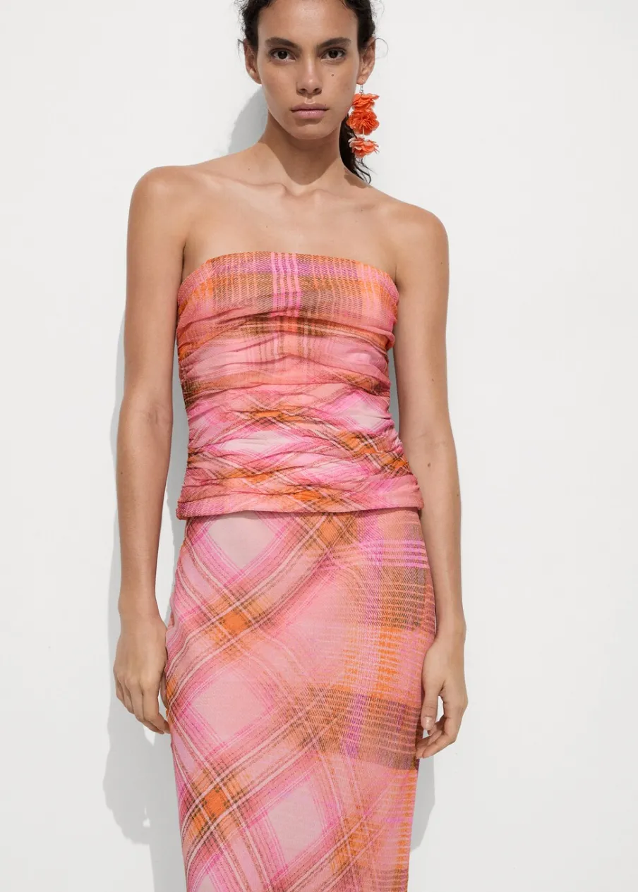 Deseń crop. Wzór w kratę. W stylu gorsetu. Dekolt bez ramiączek. Kryte zapięcie na zamek z boku. Drapowane detale. Wewnętrzna podszewka. Total look. Model wcięty.