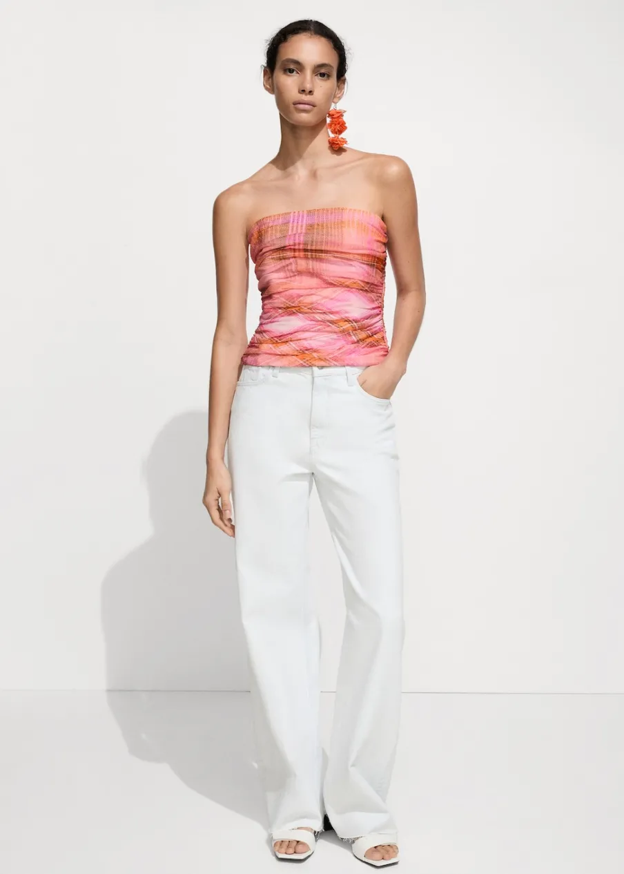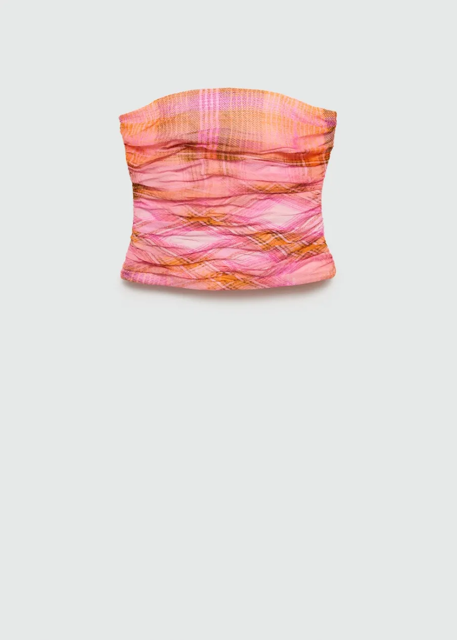 OpisDeseń crop. Wzór w kratę. W stylu gorsetu. Dekolt bez ramiączek. Kryte zapięcie na zamek z boku. Drapowane deta…
