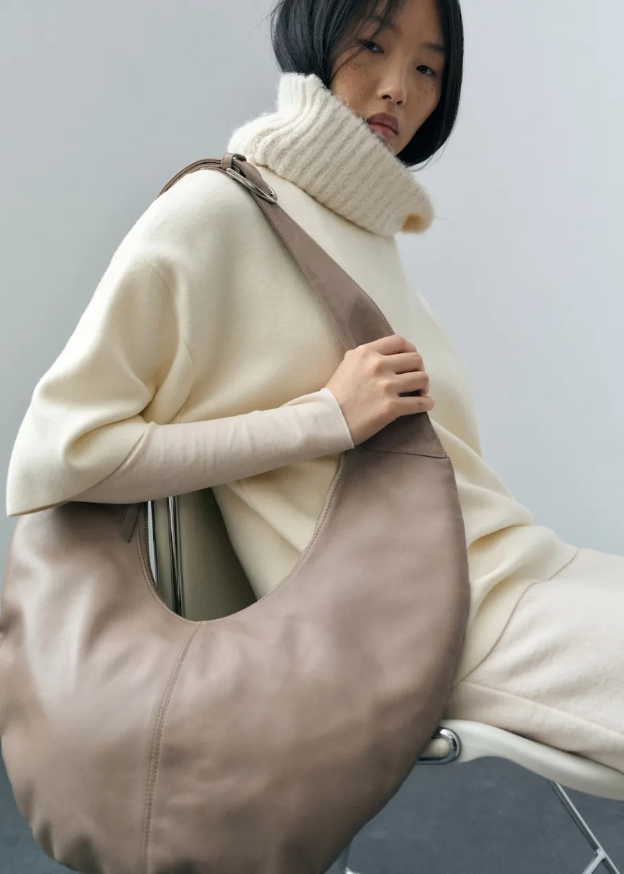 100% skóra bydlęca. Kształt księżyca. Duża wielkość. Pasek na ramię. Regulowany uchwyt. Z uchwytem. Zapięcie na suwak. Wewnętrzna podszewka.