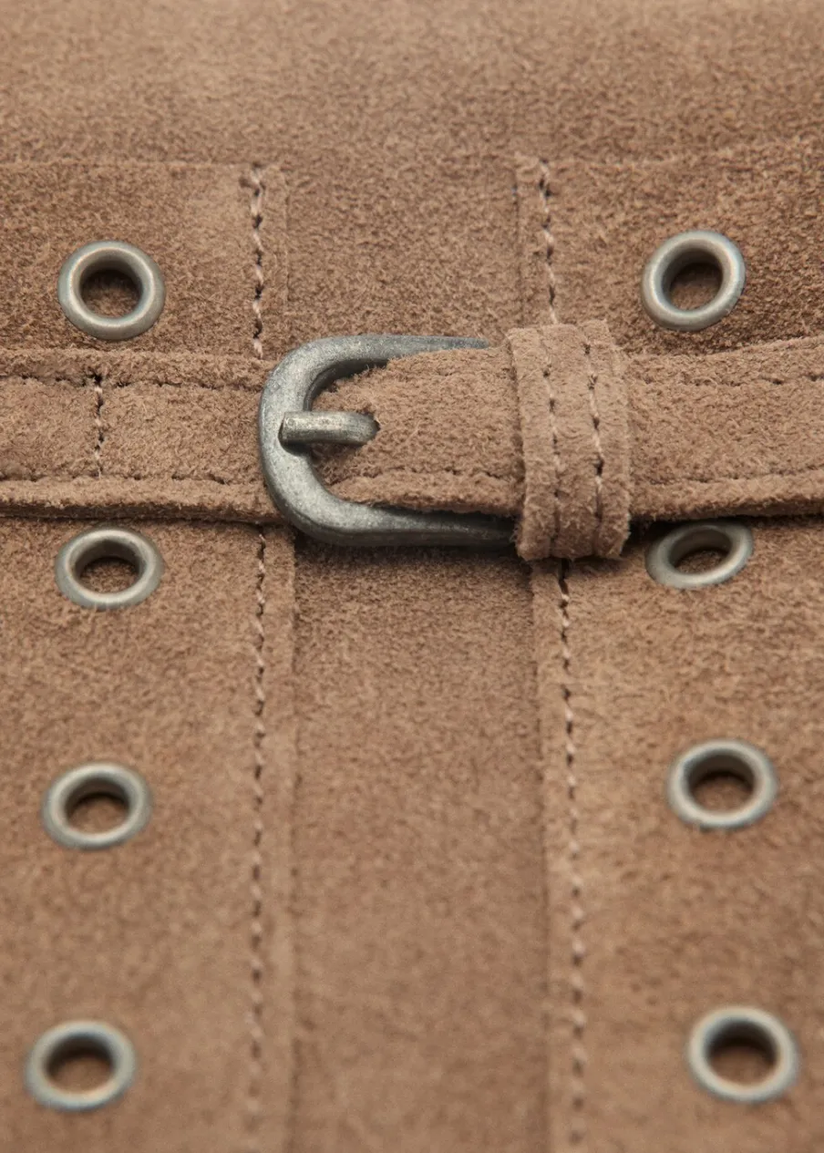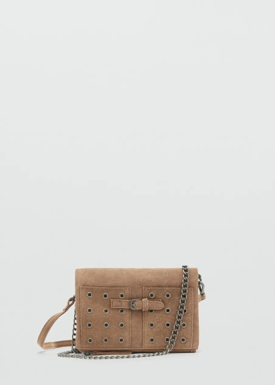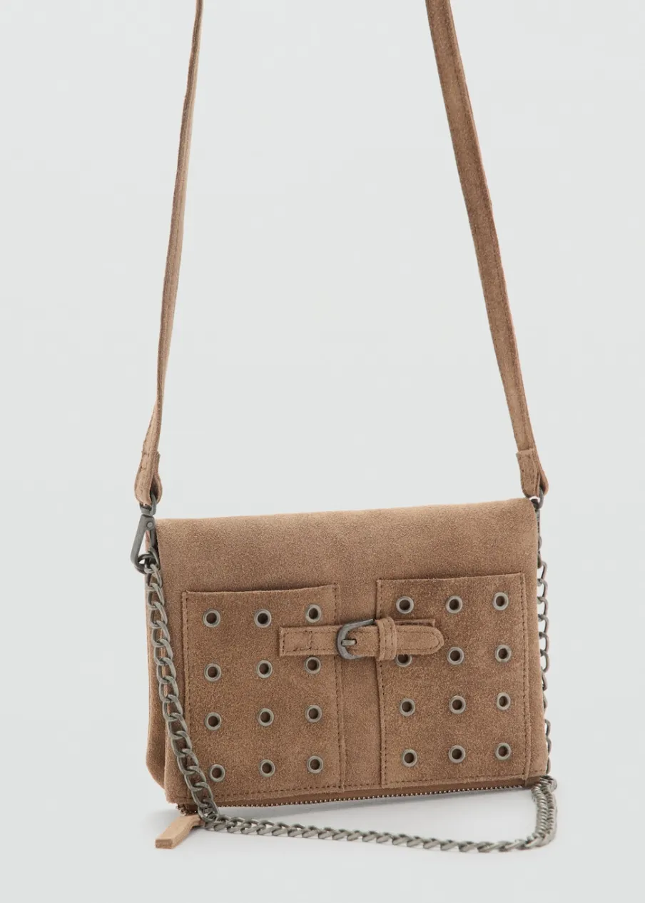 100% skóra bydlęca. Podwójny uchwyt. Zapięcie na suwak. Metalowe zapięcie na magnes. Detal z ćwiekami. Ozdobna klamra.
