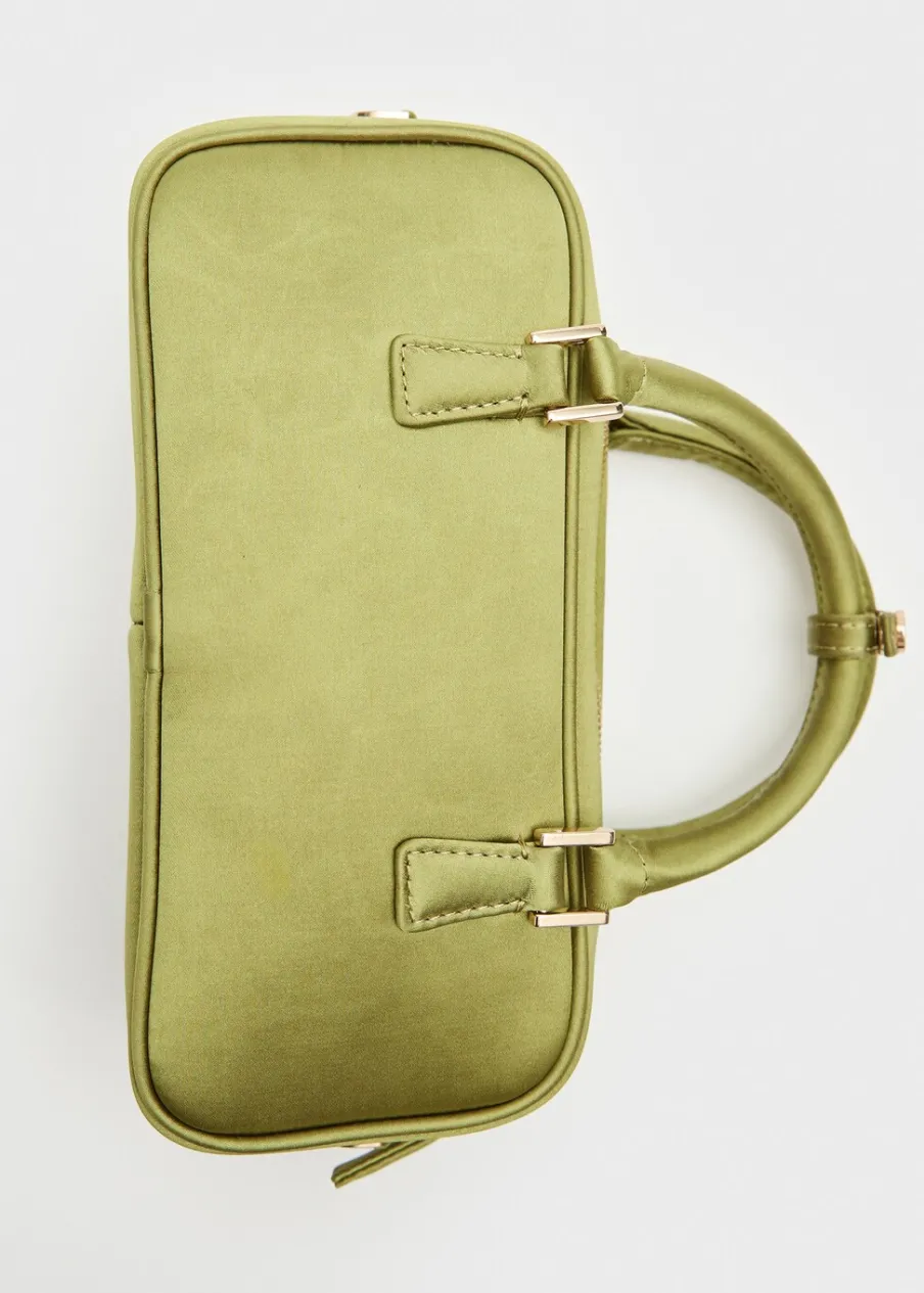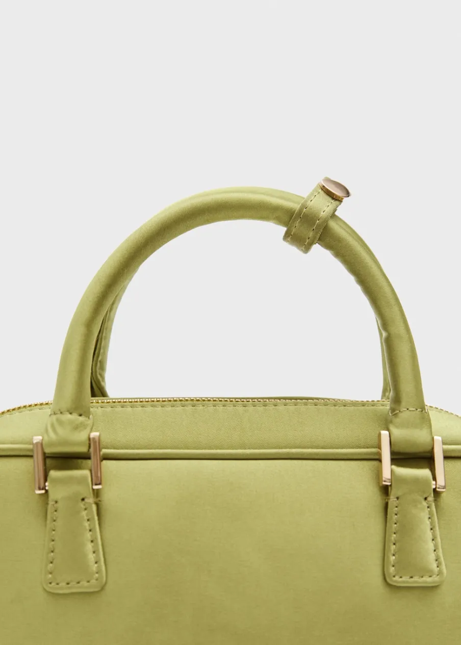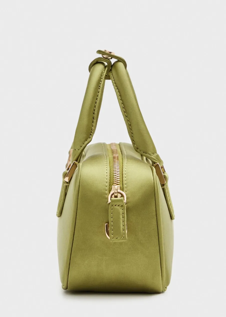 Mała wielkość. Satynowa tkanina. Styl bowling. Zapięcie na suwak. Podwójny, krótki uchwyt. Długi, odpinany uchwyt. Zapięcie na zamki. Wewnętrzna podszewka. Kolekcja Selection.