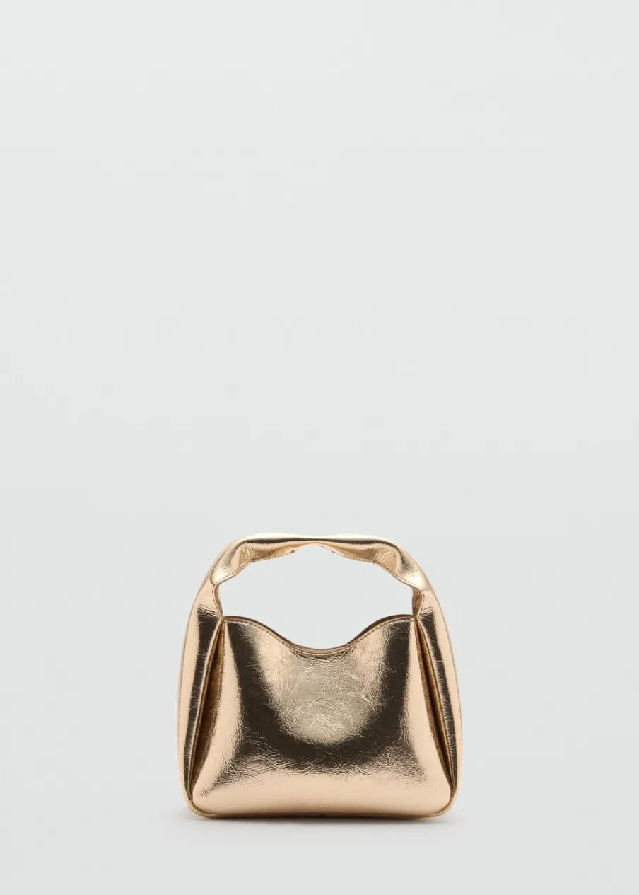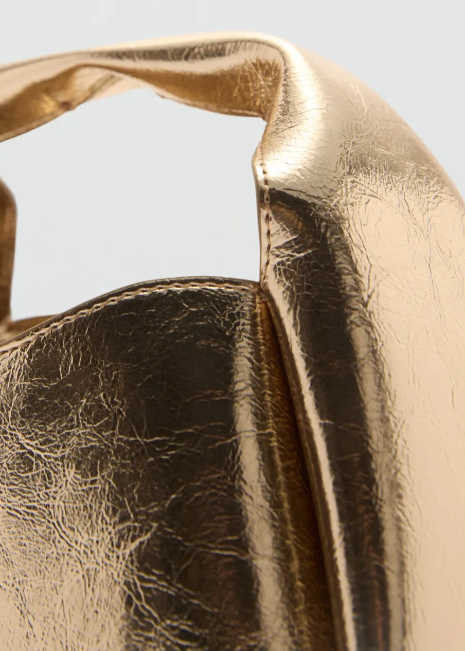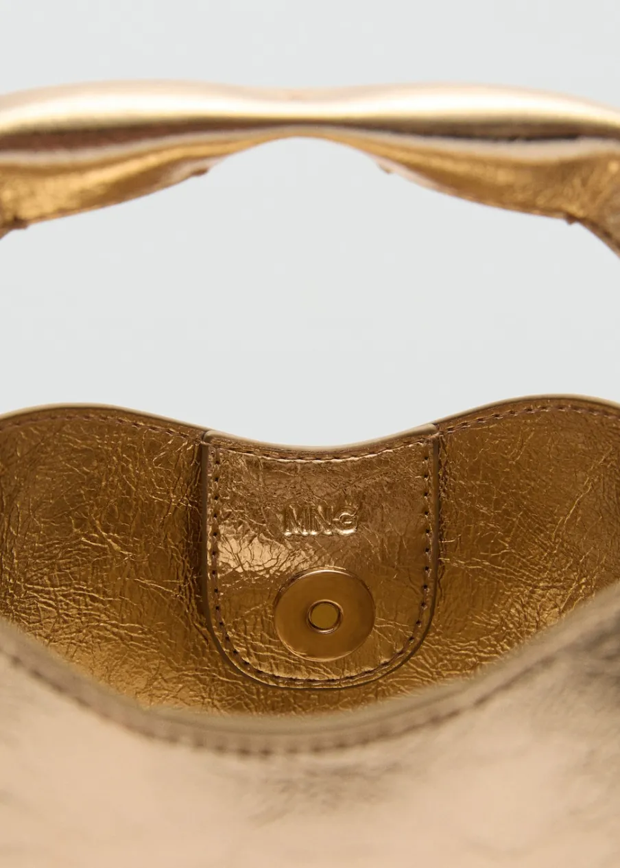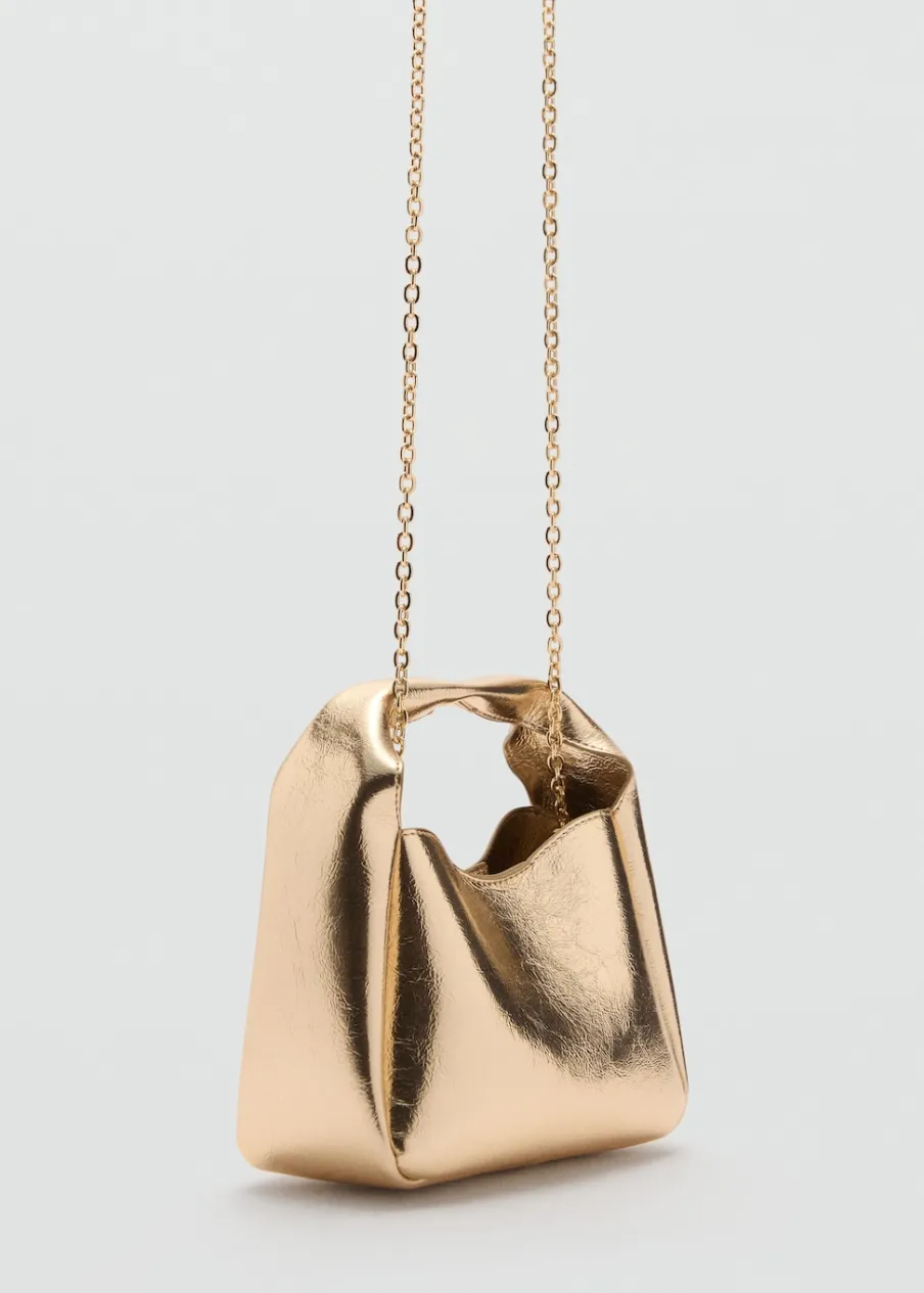 Metaliczny efekt. Średnia wielkość. Uchwyt do ręki. Długi pasek z łańcucha. Zapięcie na magnes. Wewnętrzna podszewka.