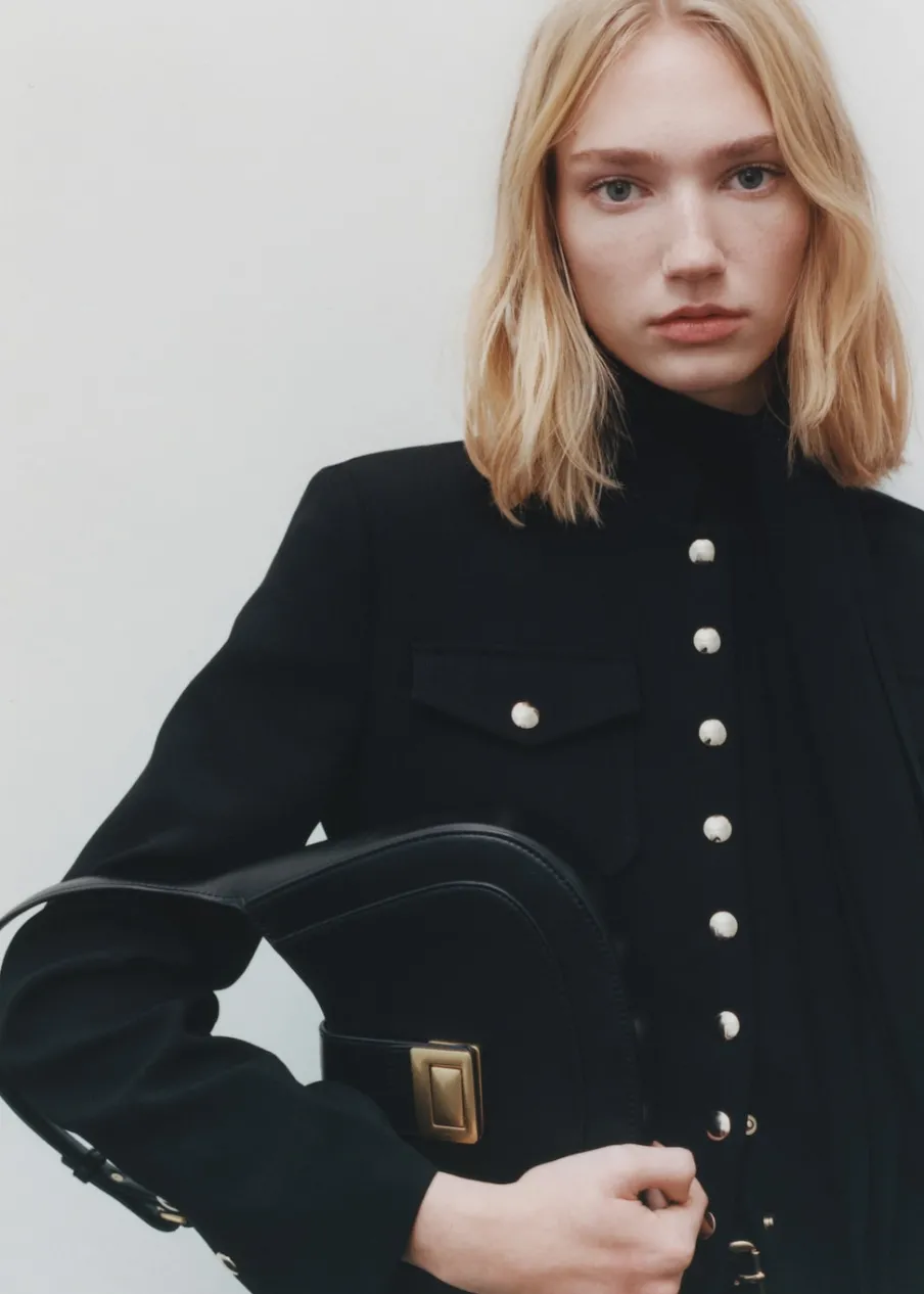 Wewnętrzna podszewka. Pasek na ramię. Metalowe zapięcie na zatrzask. Wewnętrzna kieszeń zapinana na suwak.