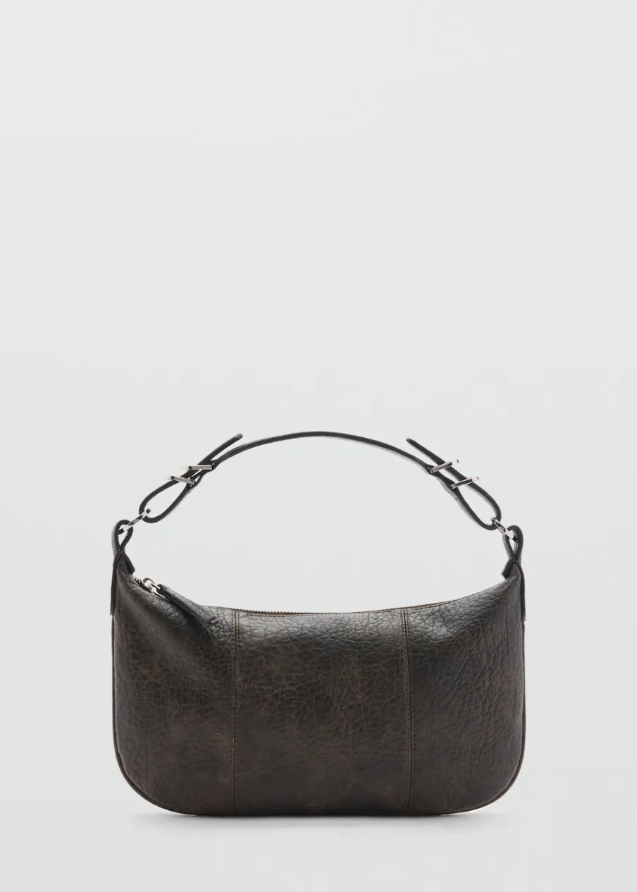 Mała wielkość. Efekt skóry. Krótki uchwyt. Pasek na ramię. Ozdobne klamry. Zapięcie na zamek z przodu. Wewnętrzna podszewka.