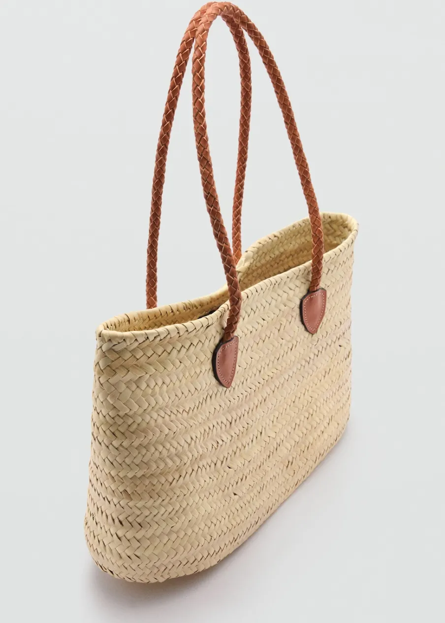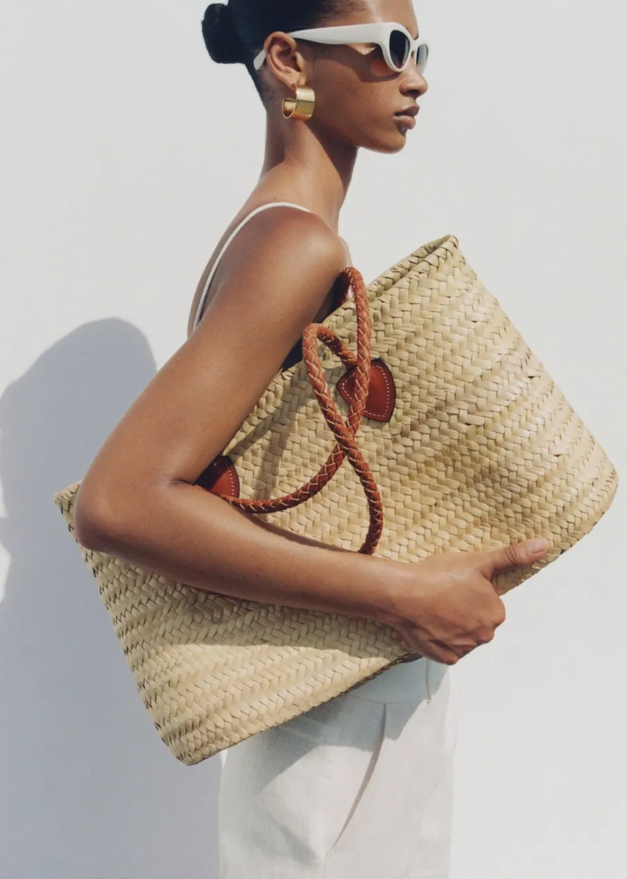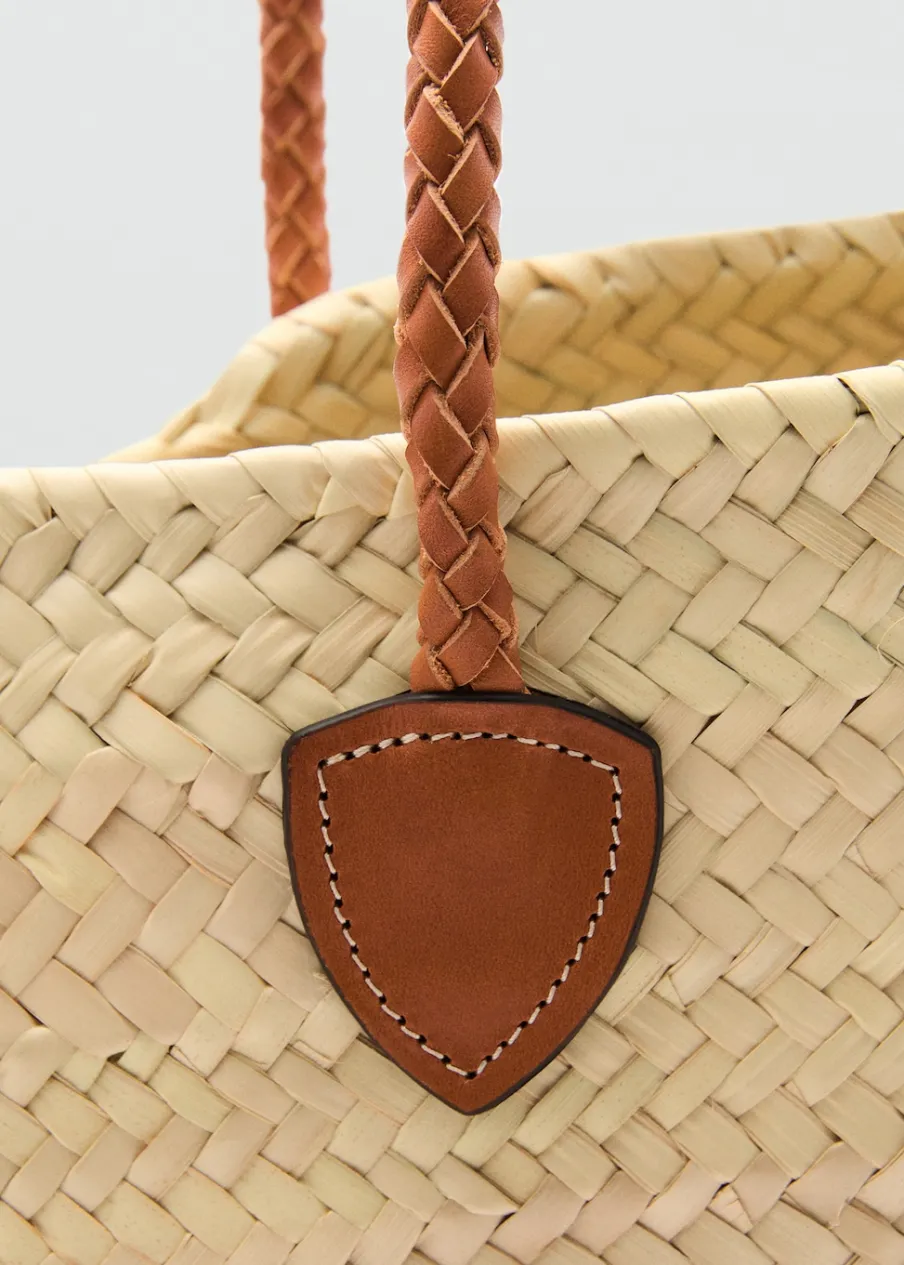 Duża wielkość. Tkanina z naturalnego włókna. Podwójny, krótki uchwyt. Pasek na ramię. Zapięcie na węzełek. Kontrastowy detal. Skóra bydlęca. Akcesoria plażowe.