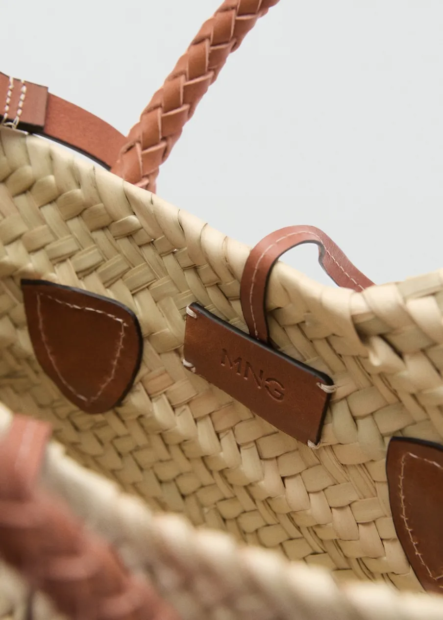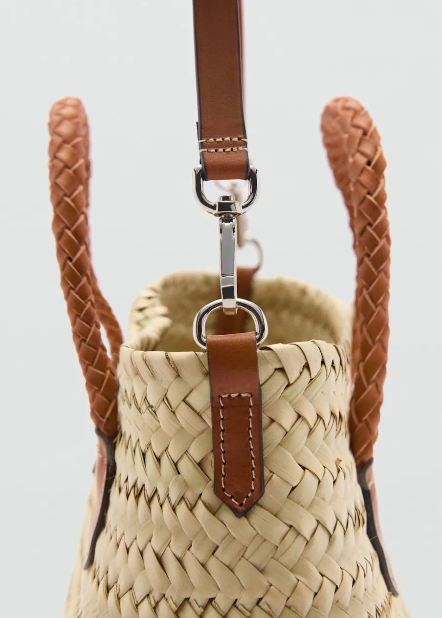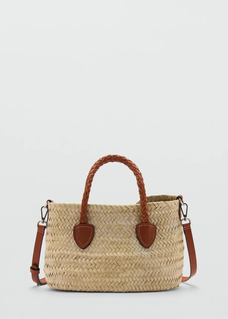 Mała wielkość. Plecione liście palmy kokosowej. Podwójny, krótki uchwyt. Długi, odpinany uchwyt. Torebka na ramię. Wiązanie na sznurek. Skóra bydlęca.