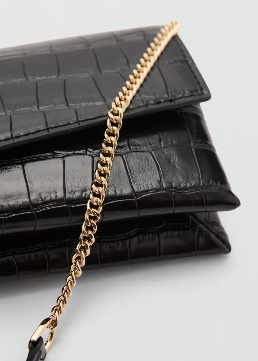 Mała wielkość. Wzór skóry krokodyla. Łańcuchowy uchwyt. Klapa z zapięciem na magnes. Wewnętrzna podszewka.