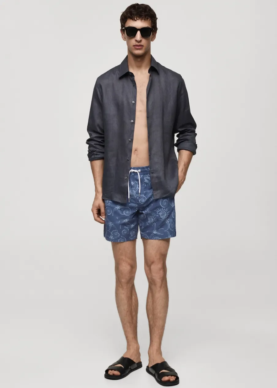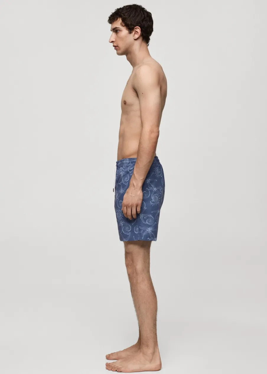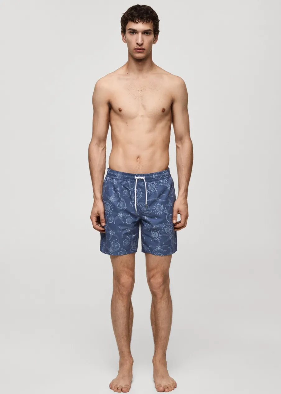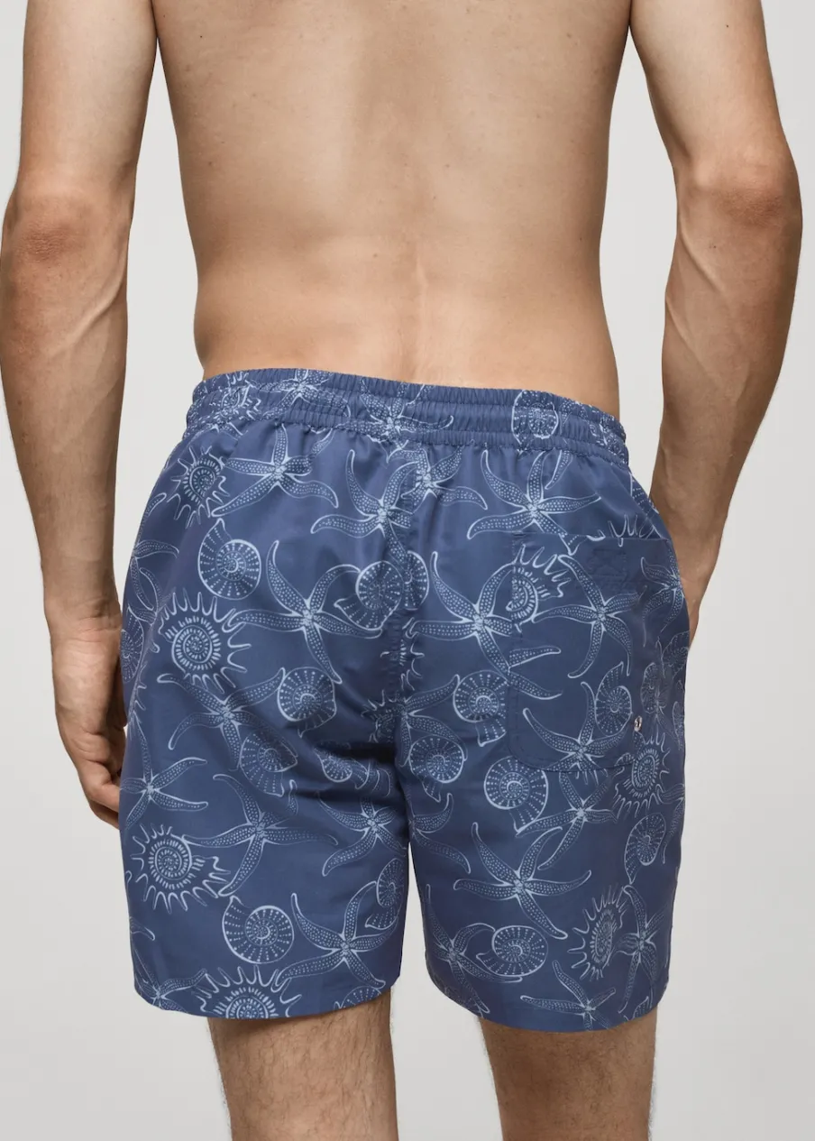 Wzór z morskimi motywami. Elastyczny pas z regulowanym sznurkiem. Dwie kieszenie z przodu. Nakładana kieszeń z tyłu. Model ma 187 cm wzrostu i nosi rozmiar M.
