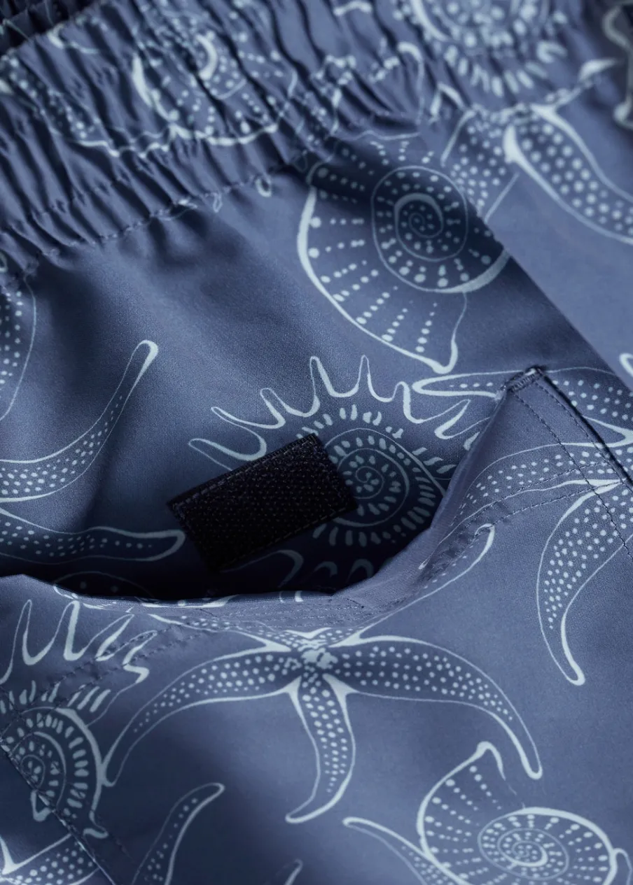 OpisWzór z morskimi motywami. Elastyczny pas z regulowanym sznurkiem. Dwie kieszenie z przodu. Nakładana kieszeń z ty…