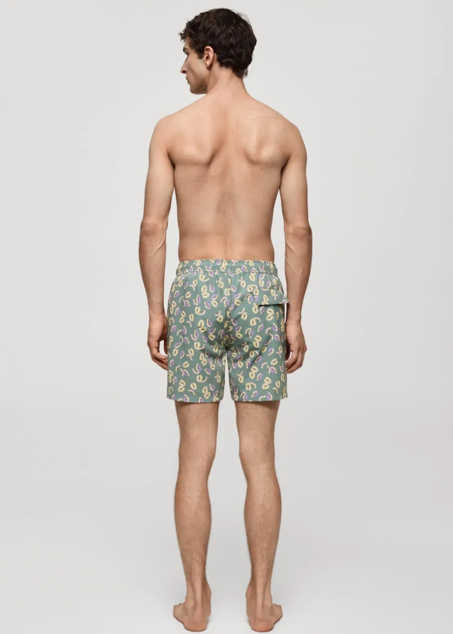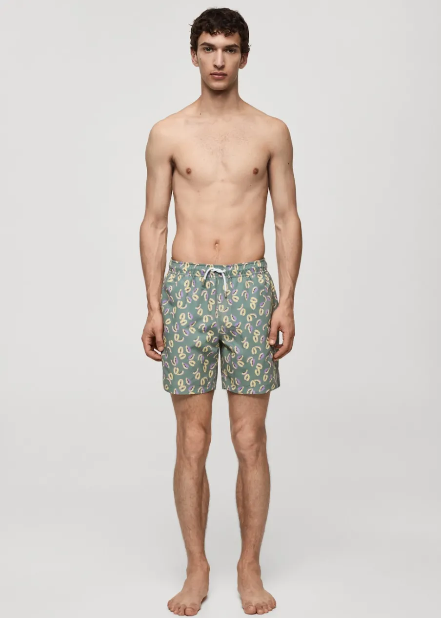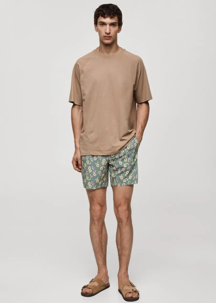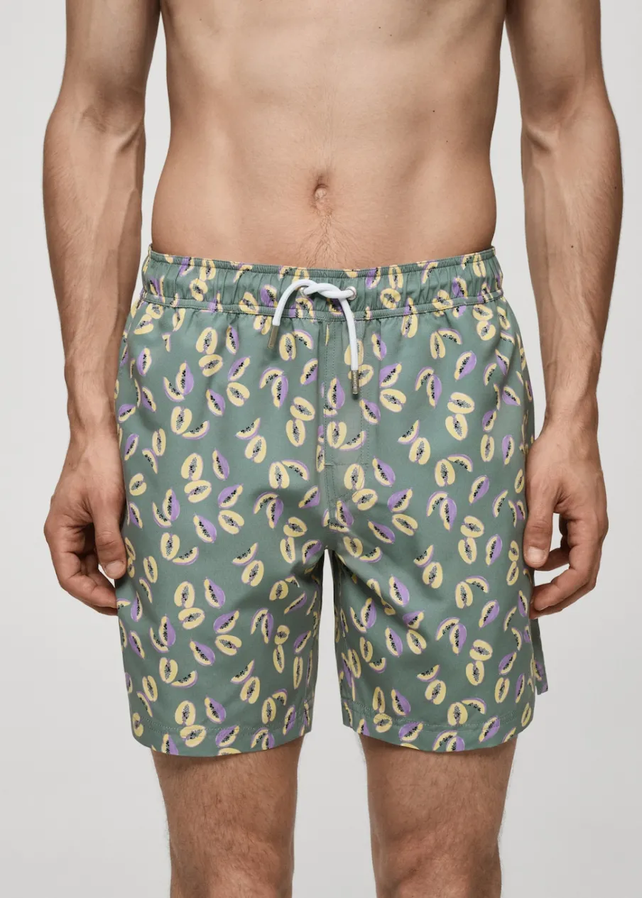 Elastyczny pas z regulowanym sznurkiem. Kieszeń nakładana na piersi. Dwie kieszenie z przodu. Dół z rozcięciem po bokach. Model ma 187 cm wzrostu i nosi rozmiar M. Nadruk w papaje.