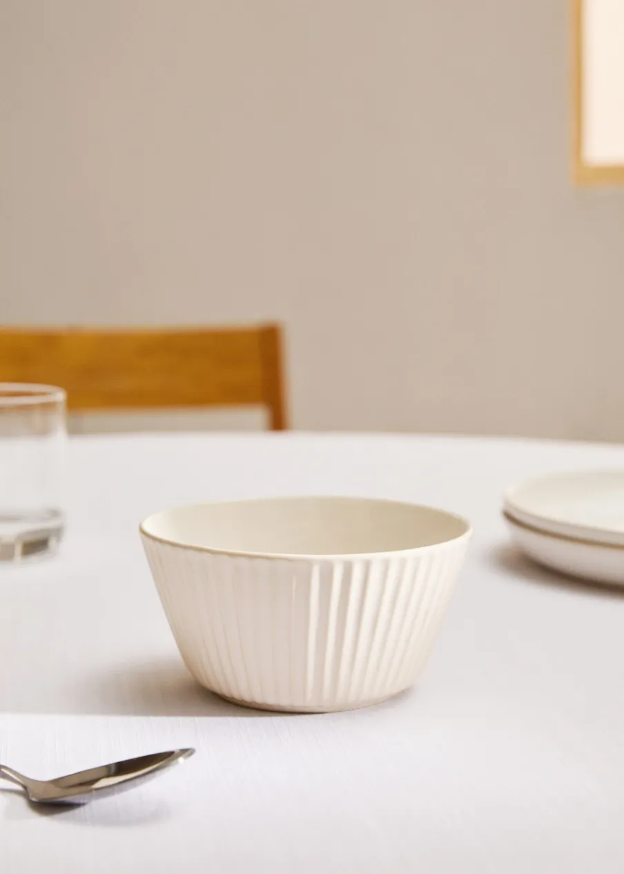 Średnica: 15 cm. Wysokość: 8 cm. 100% kamionka. Naczynie na żywność. Można wypełnić płynami. Sprzedaż na sztuki. Połącz z innymi produktami z kolekcji. Idealny wybór, aby dodać świeżości i elegancji do nakrycia stołu. Łączy rustykalne wzornictwo z elegancką teksturą.