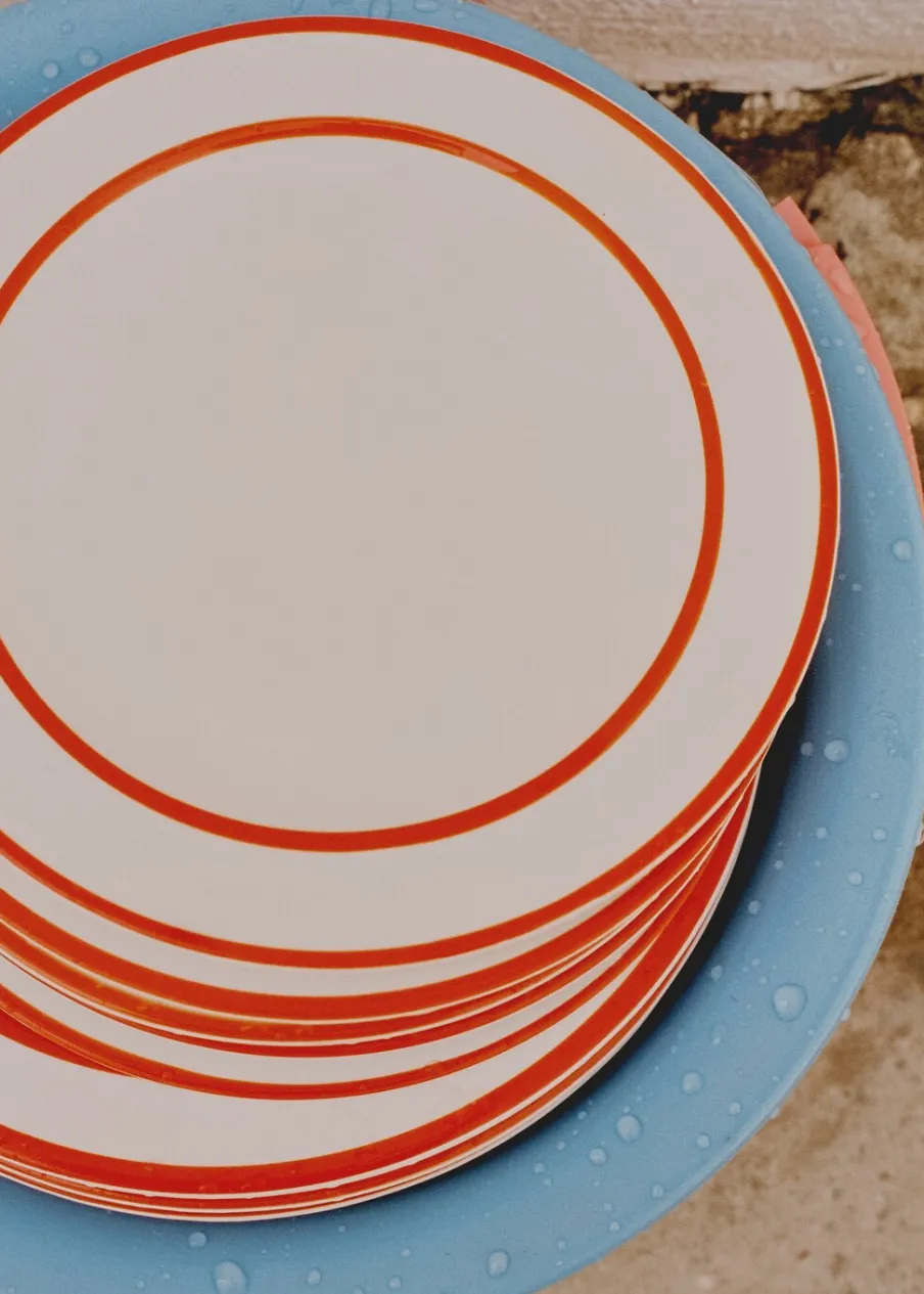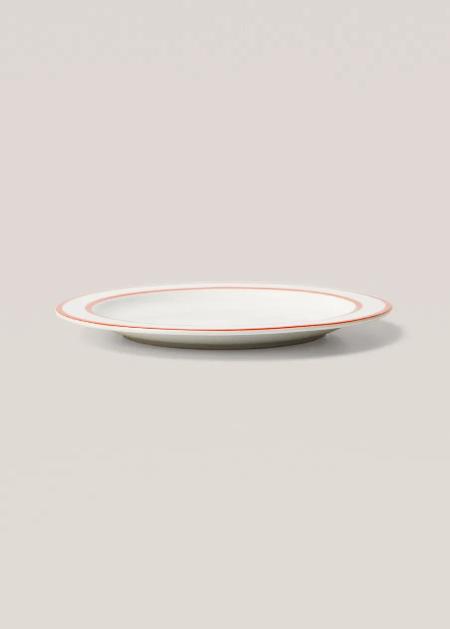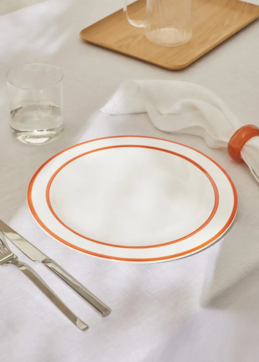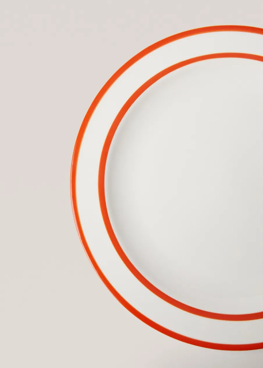 Malowany ręcznie wzór. Mogą występować drobne różnice w wykonaniu. Płaski talerz. 100% kamionka. Model z podwójną obwódką. Każdy talerz jest dziełem sztuki, wykonanym z wysokiej jakości kamionki i ozdobionym ręcznie podwójną obwódką w kontrastowym kolorze, która dodaje nowoczesny i wyrafinowany akcent do zastawy stołowej. Średnica: 27 cm.