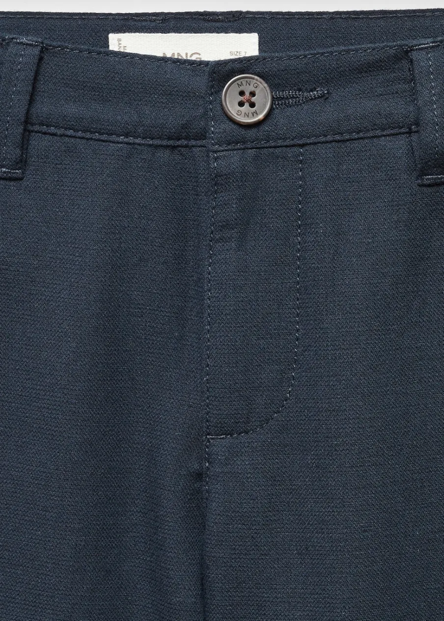 Kolekcja wizytowa. Tkanina mieszanka bawełny i lnu. Model prosty. Krótki krój. Szlufki. Dwie kieszenie z przodu. Dwie wpuszczane kieszenie z tyłu. Zapięcie na suwak i guzik.